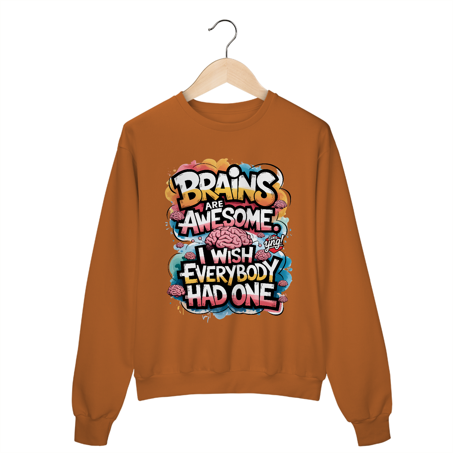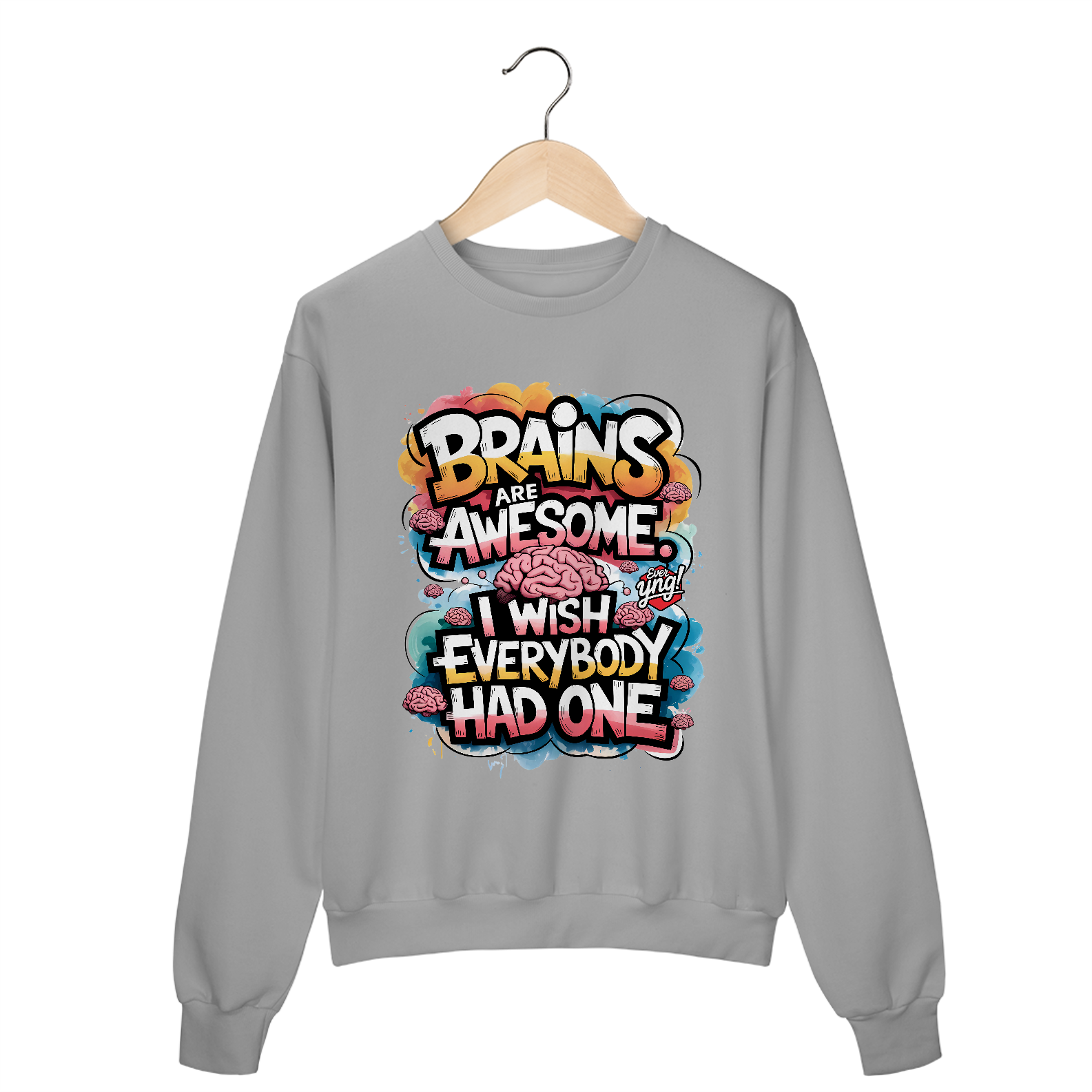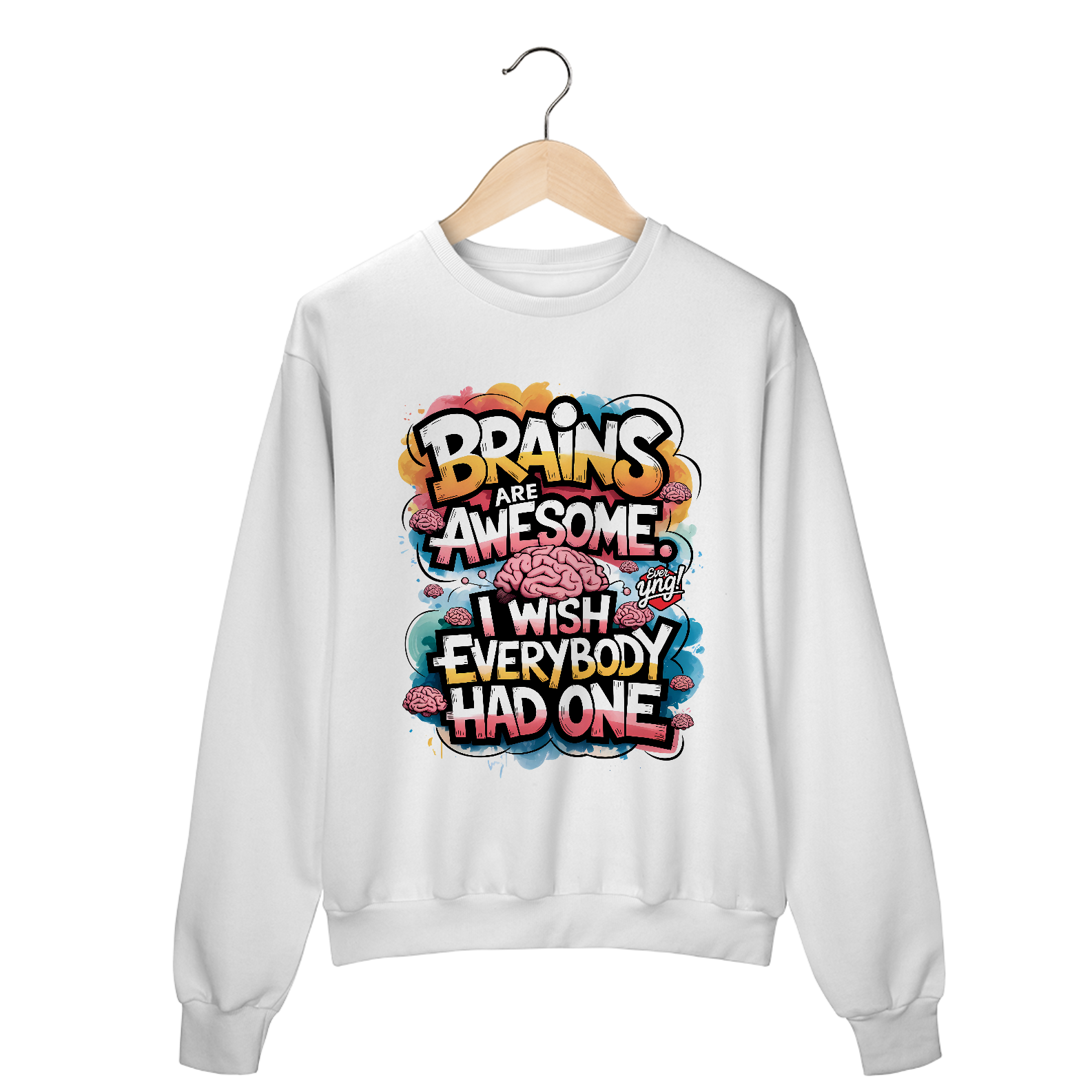 Uma explosão vibrante de cores e ilustrações de cérebros estilizados, com a frase “CÉREBROS SÃO INCRÍVEIS” flutuando no centro da composição. Uma peça energizante para aqueles que querem destacar sua inteligência com muito estilo. A Ever Yng capricha em criatividade com essa estampa cheia de cor e energia!