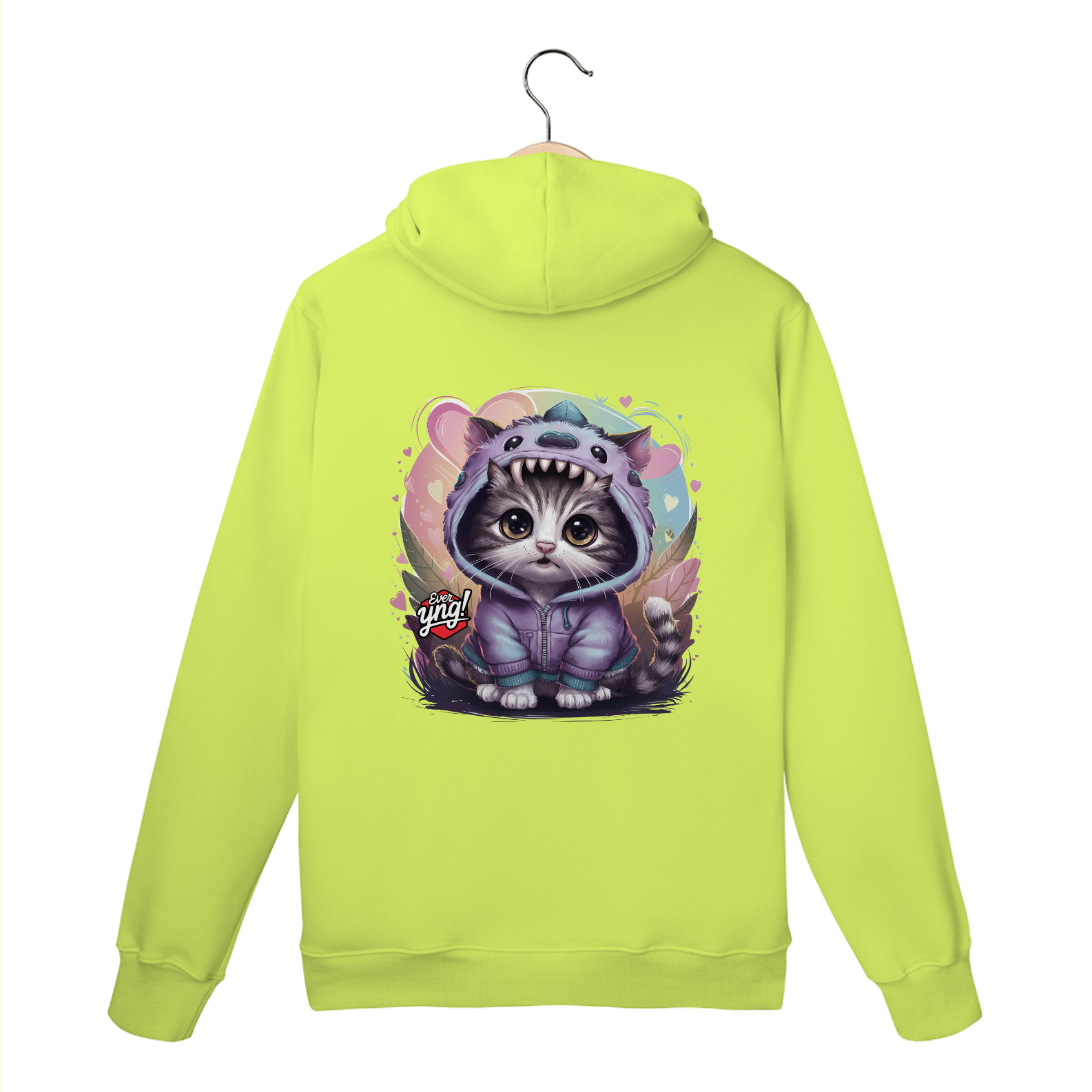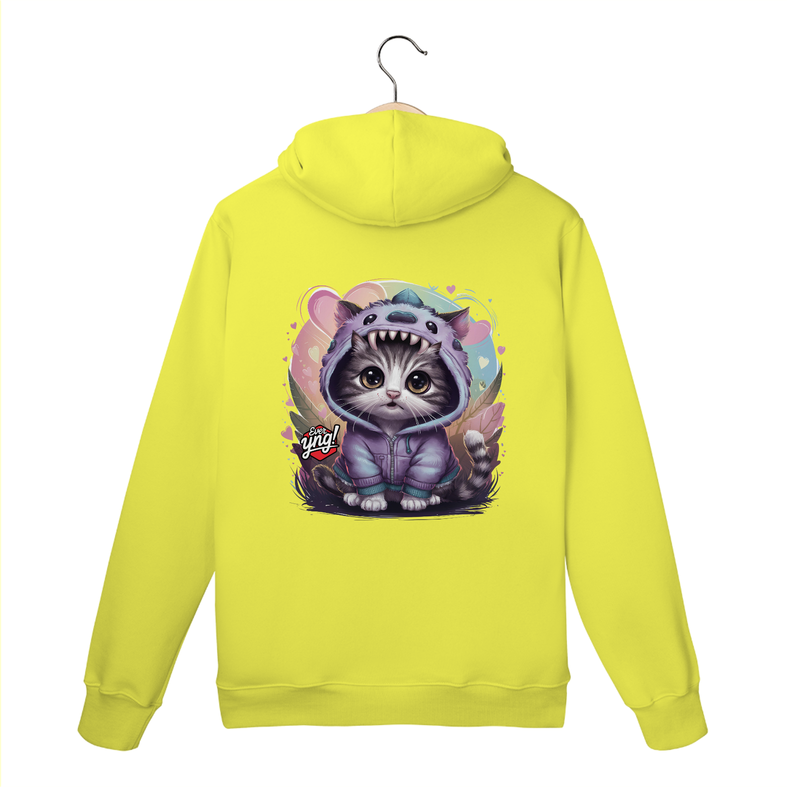 A estampa "Curiosidade Felina" da Ever Yng! traz a mistura perfeita de fofura e mistério. Um gatinho de olhos grandes, vestido com um capuz roxo que lembra uma criatura mística de olhos enormes e dentes afiados, está cercado por um cenário de corações, folhas e um gradiente suave em tons pastéis. Com uma expressão lúdica e curiosa, este design é perfeito para quem ama estilo jovial e divertido. Na Ever Yng!, envelhecer é opcional, e nossa moda é sempre jovem, ousada e cheia de personalidade!