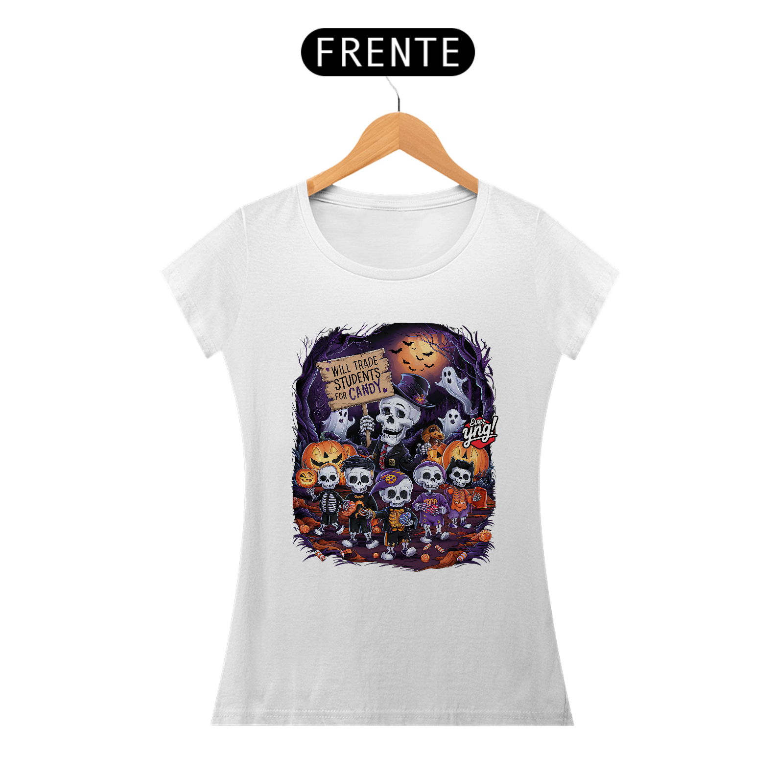 Doces ou Estudantes? é a escolha perfeita para os amantes do Dia das Bruxas com uma pitada de humor macabro. A estampa traz um esqueleto estilizado, de terno e chapéu, segurando uma placa que diz: "TROCARÁ ESTUDANTES POR DOCES". Ao redor, outras figuras esqueléticas seguram doces e celebram essa troca inusitada em uma cena de floresta assustadora, iluminada por uma lua cheia e enfeitada com abóboras e fantasmas. Na Ever Yng!, envelhecer é opcional, e nossa moda brinca com o sombrio e o divertido, trazendo sempre o inesperado!