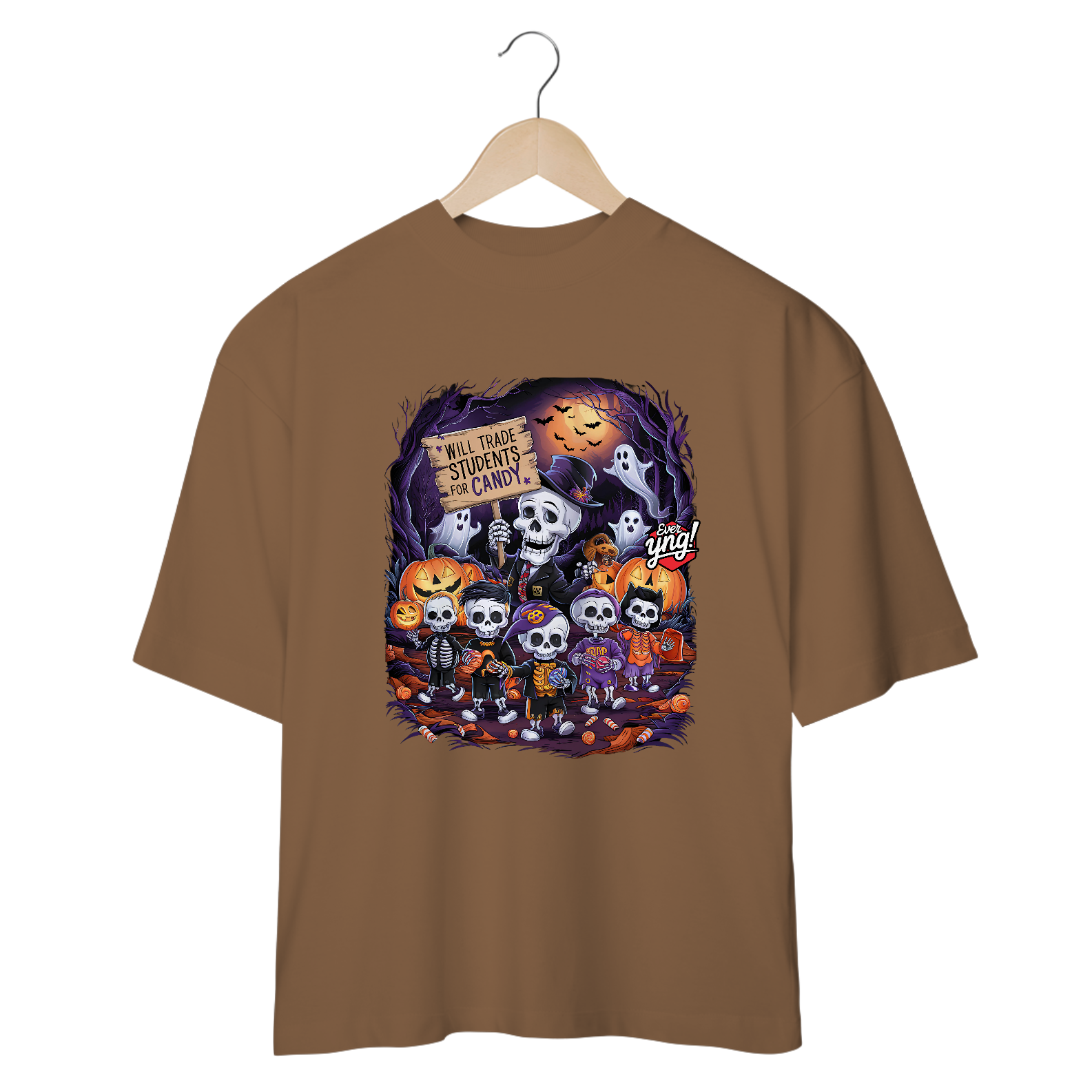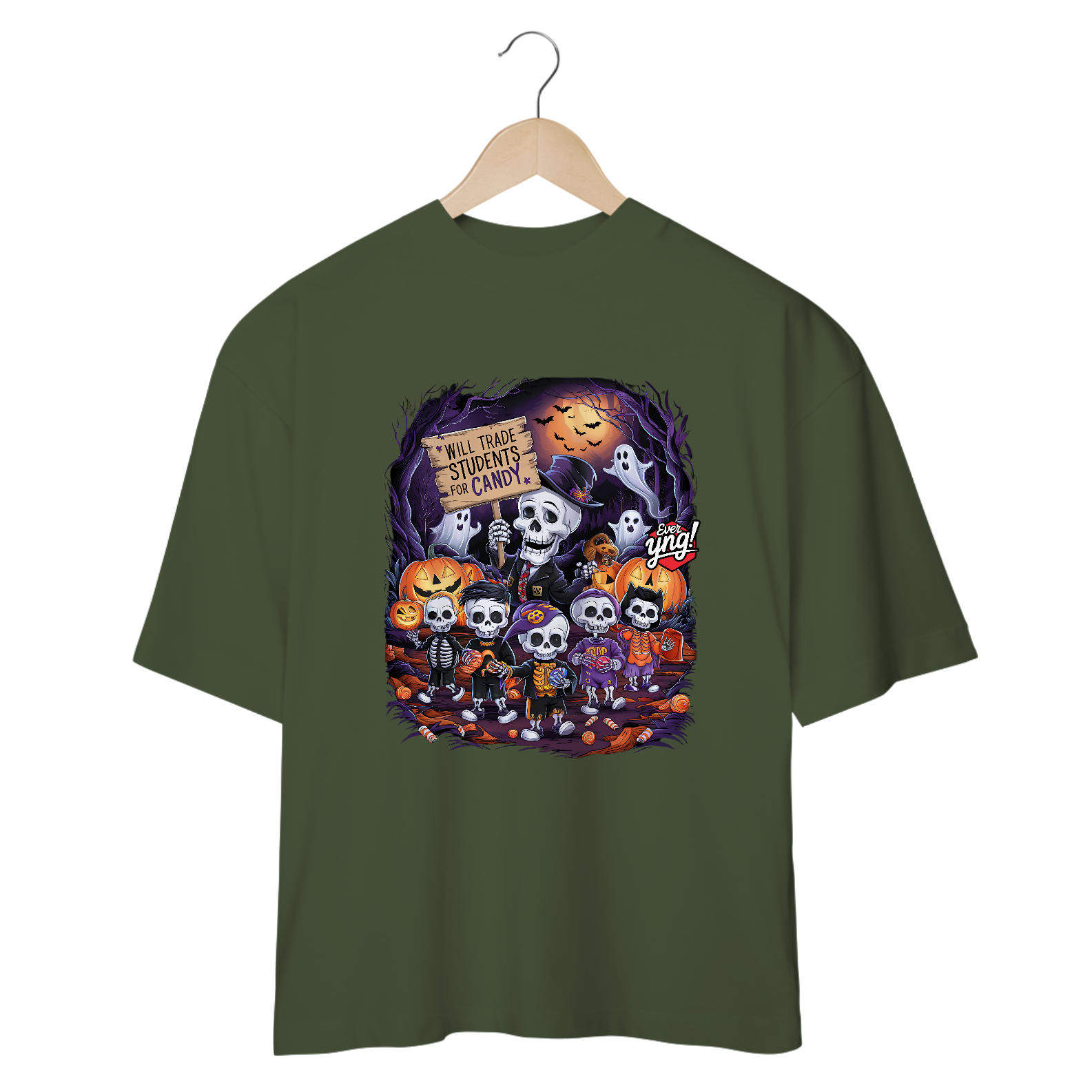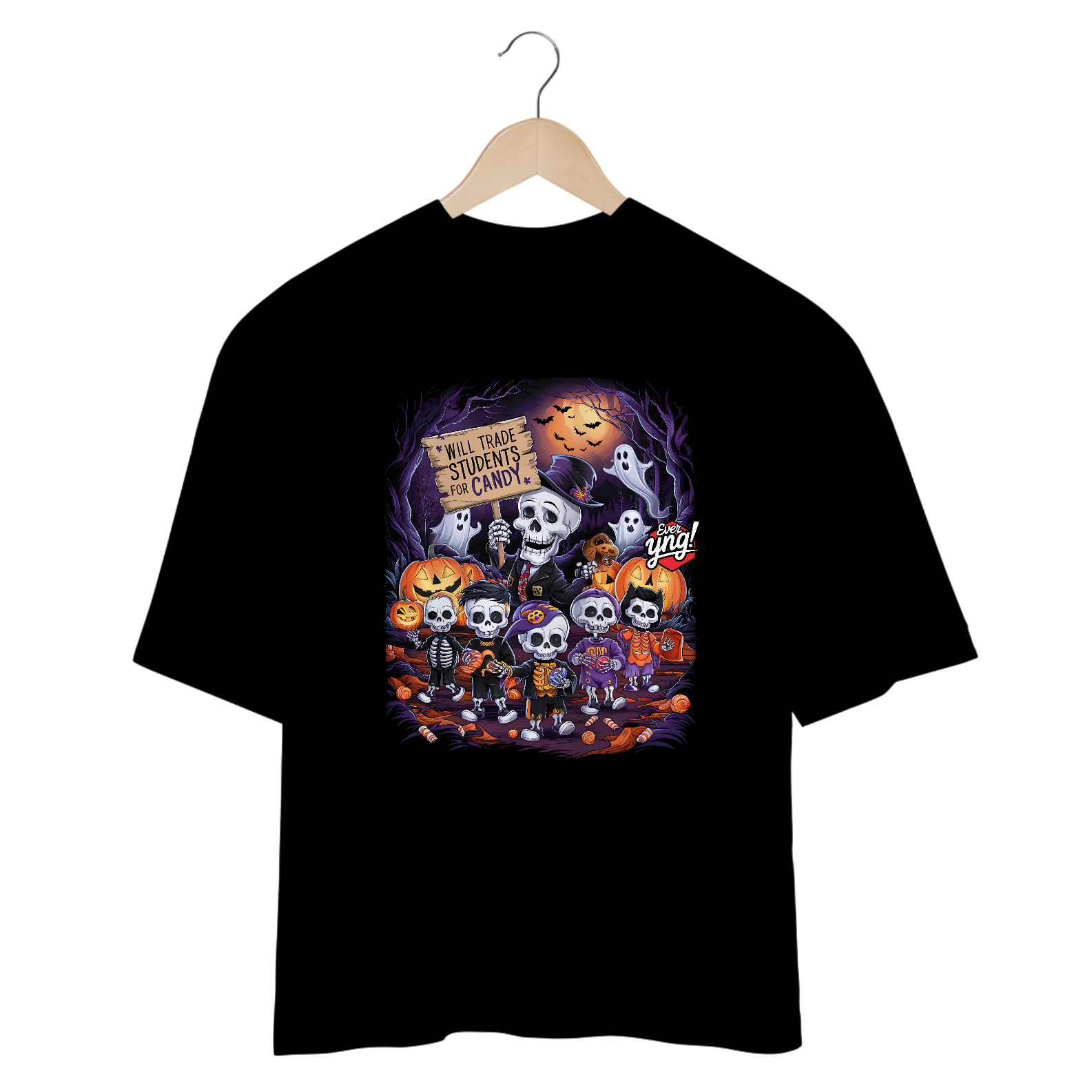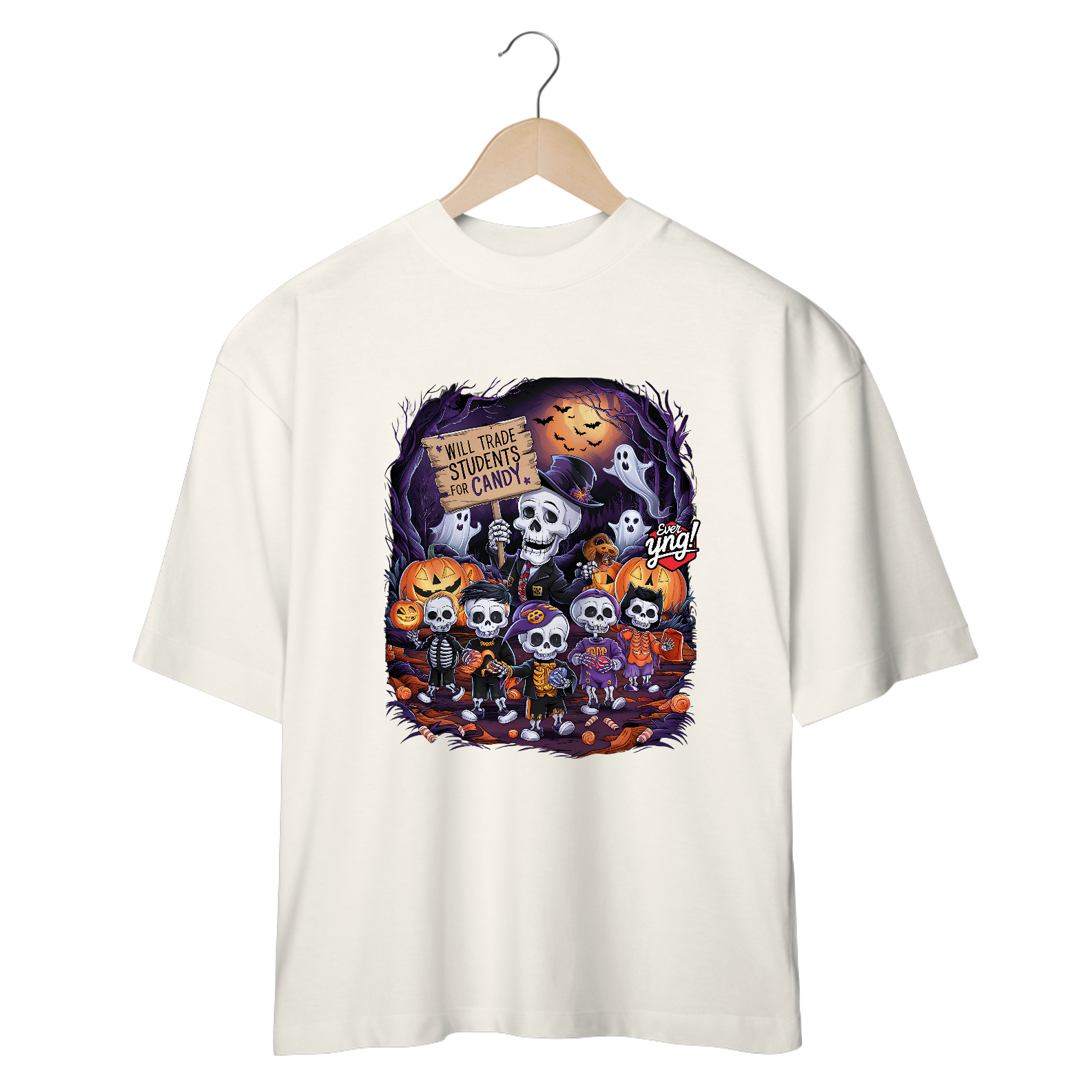 Doces ou Estudantes? é a escolha perfeita para os amantes do Dia das Bruxas com uma pitada de humor macabro. A estampa traz um esqueleto estilizado, de terno e chapéu, segurando uma placa que diz: "TROCARÁ ESTUDANTES POR DOCES". Ao redor, outras figuras esqueléticas seguram doces e celebram essa troca inusitada em uma cena de floresta assustadora, iluminada por uma lua cheia e enfeitada com abóboras e fantasmas. Na Ever Yng!, envelhecer é opcional, e nossa moda brinca com o sombrio e o divertido, trazendo sempre o inesperado!