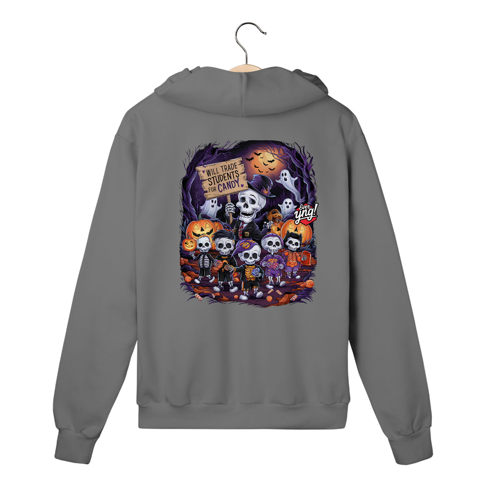 Doces ou Estudantes? é a escolha perfeita para os amantes do Dia das Bruxas com uma pitada de humor macabro. A estampa traz um esqueleto estilizado, de terno e chapéu, segurando uma placa que diz: "TROCARÁ ESTUDANTES POR DOCES". Ao redor, outras figuras esqueléticas seguram doces e celebram essa troca inusitada em uma cena de floresta assustadora, iluminada por uma lua cheia e enfeitada com abóboras e fantasmas. Na Ever Yng!, envelhecer é opcional, e nossa moda brinca com o sombrio e o divertido, trazendo sempre o inesperado!