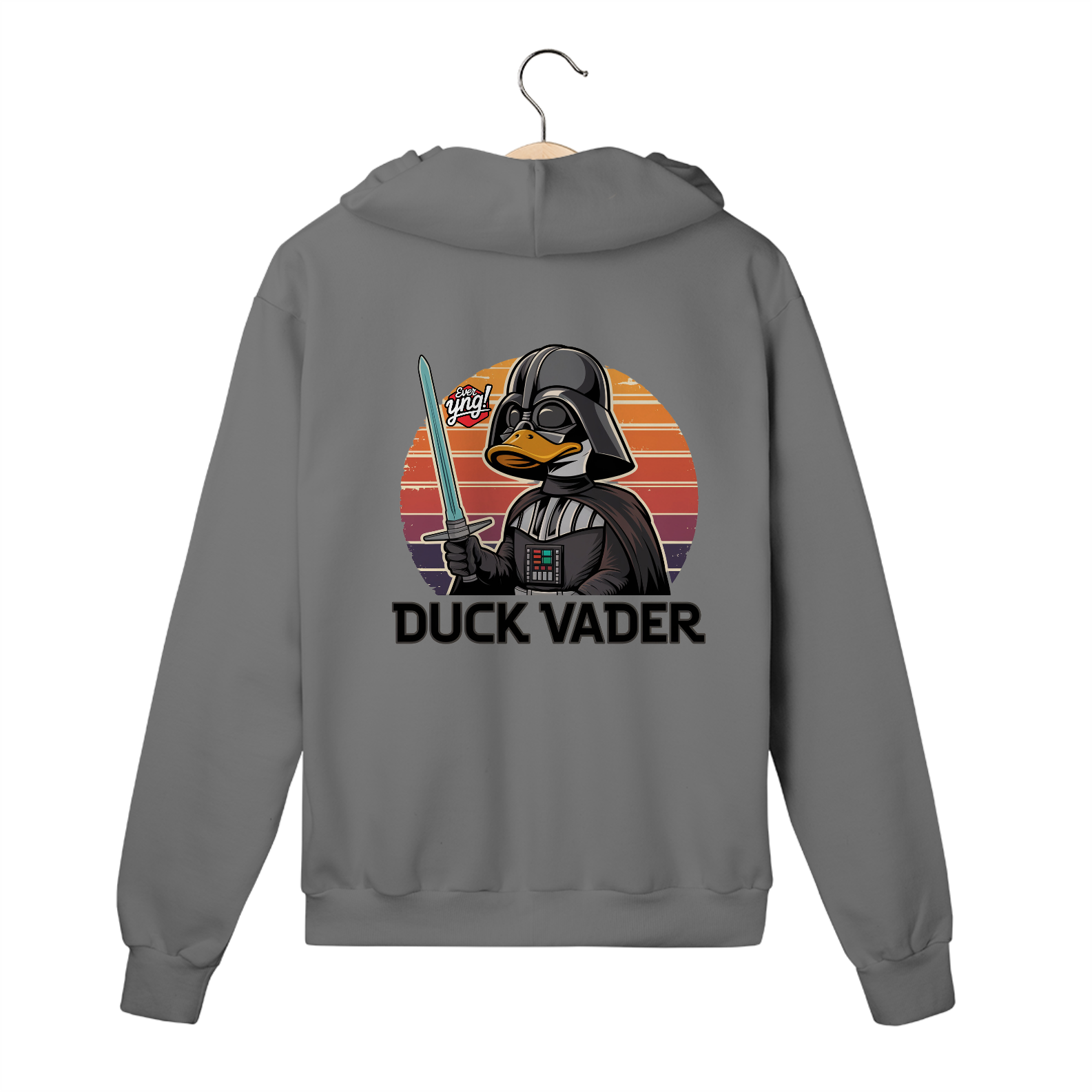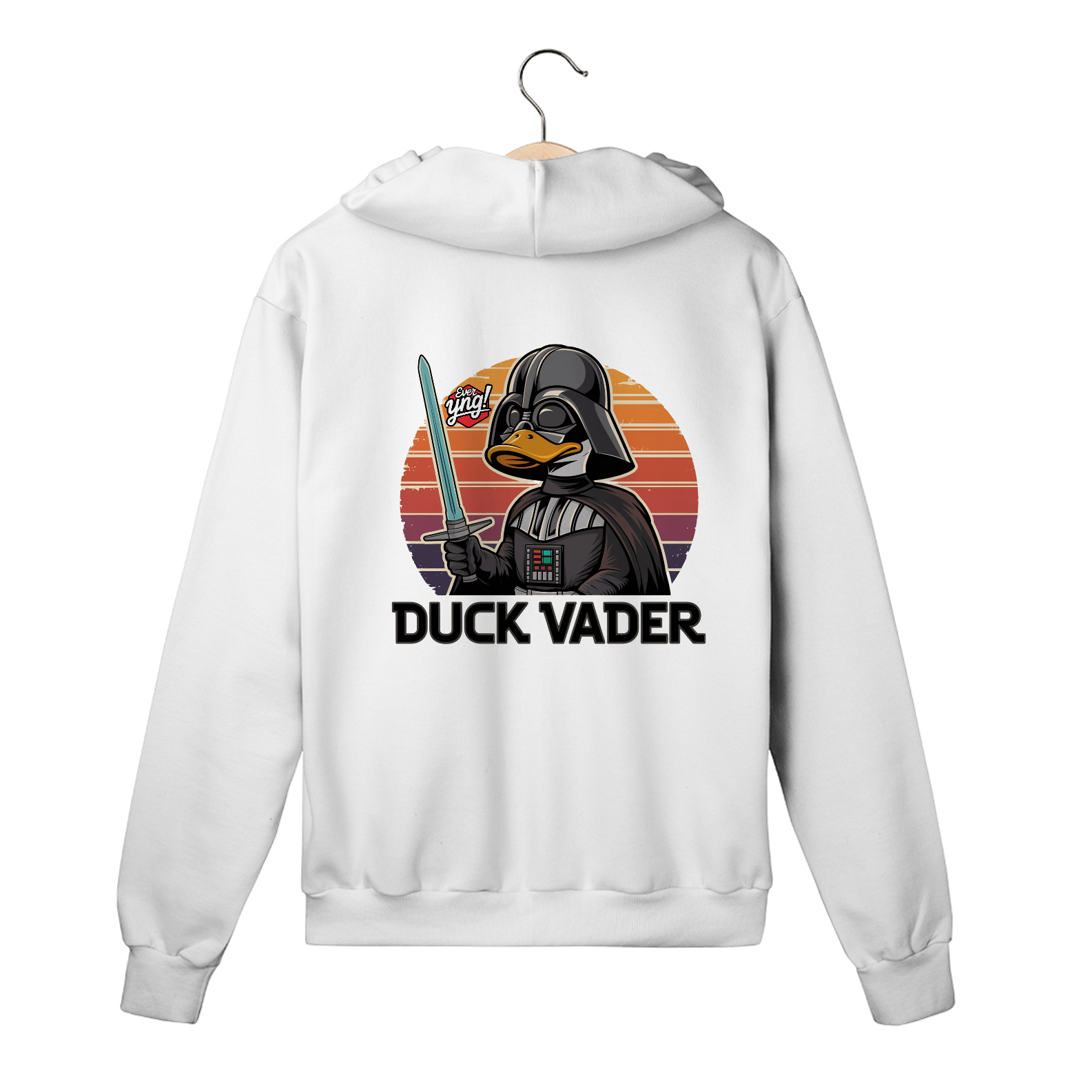 Prepare-se para uma mistura épica entre o universo Star Wars e o inesperado! O Duck Vader é um personagem que combina o temível Darth Vader com o charme descontraído de um pato. Com seu bico destacado e o clássico capacete preto, ele empunha um sabre de luz azul contra um fundo vibrante de listras em tons de pôr do sol. Perfeita para fãs de cultura pop e amantes de referências inusitadas, essa estampa carrega estilo, criatividade e muita atitude.