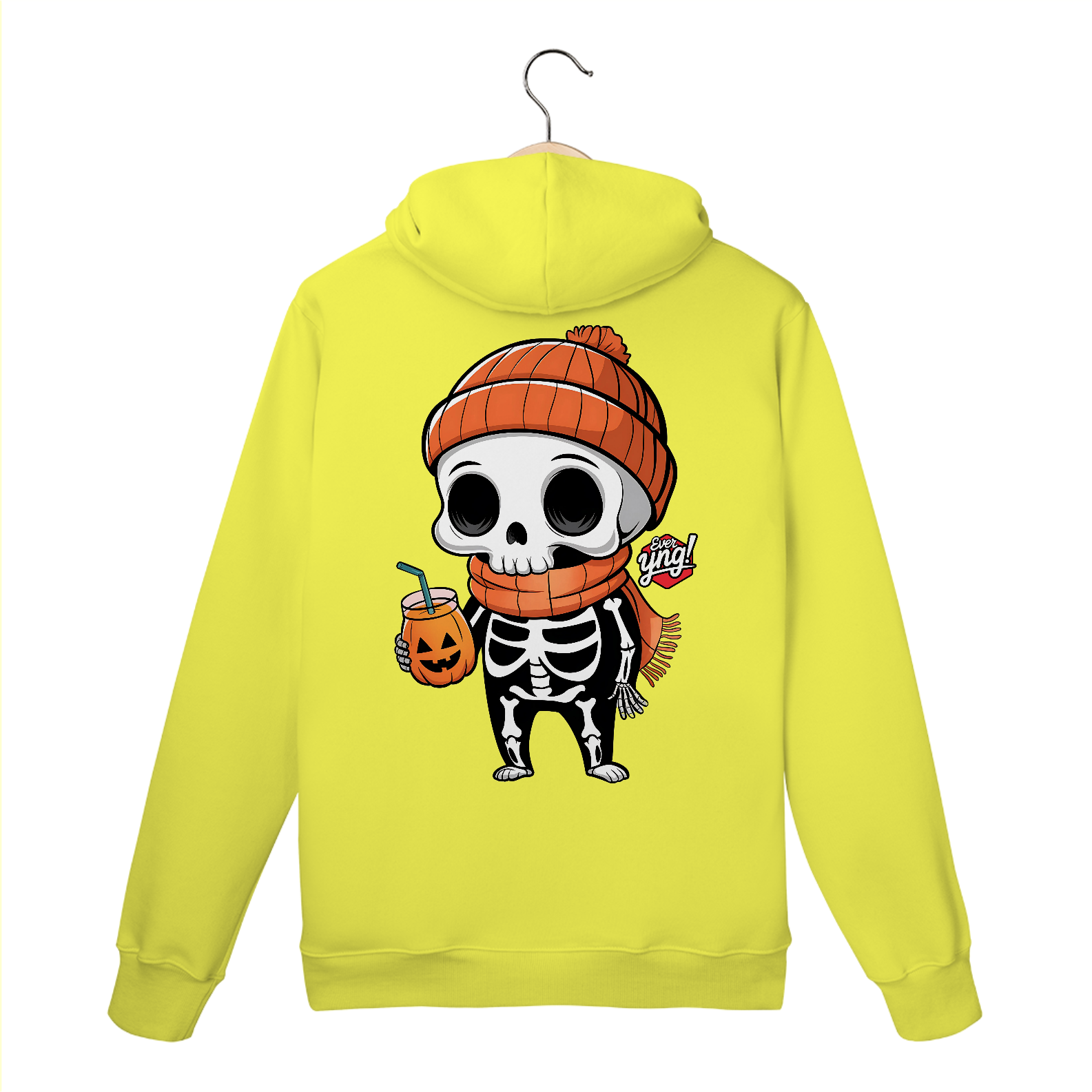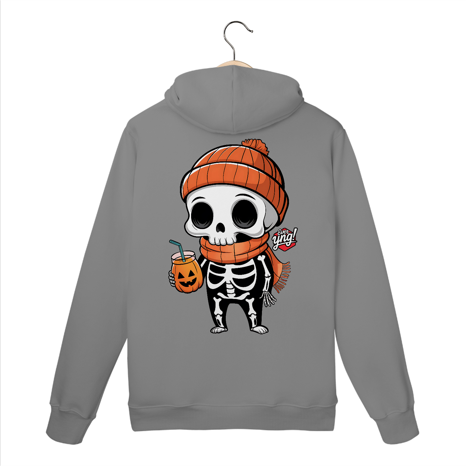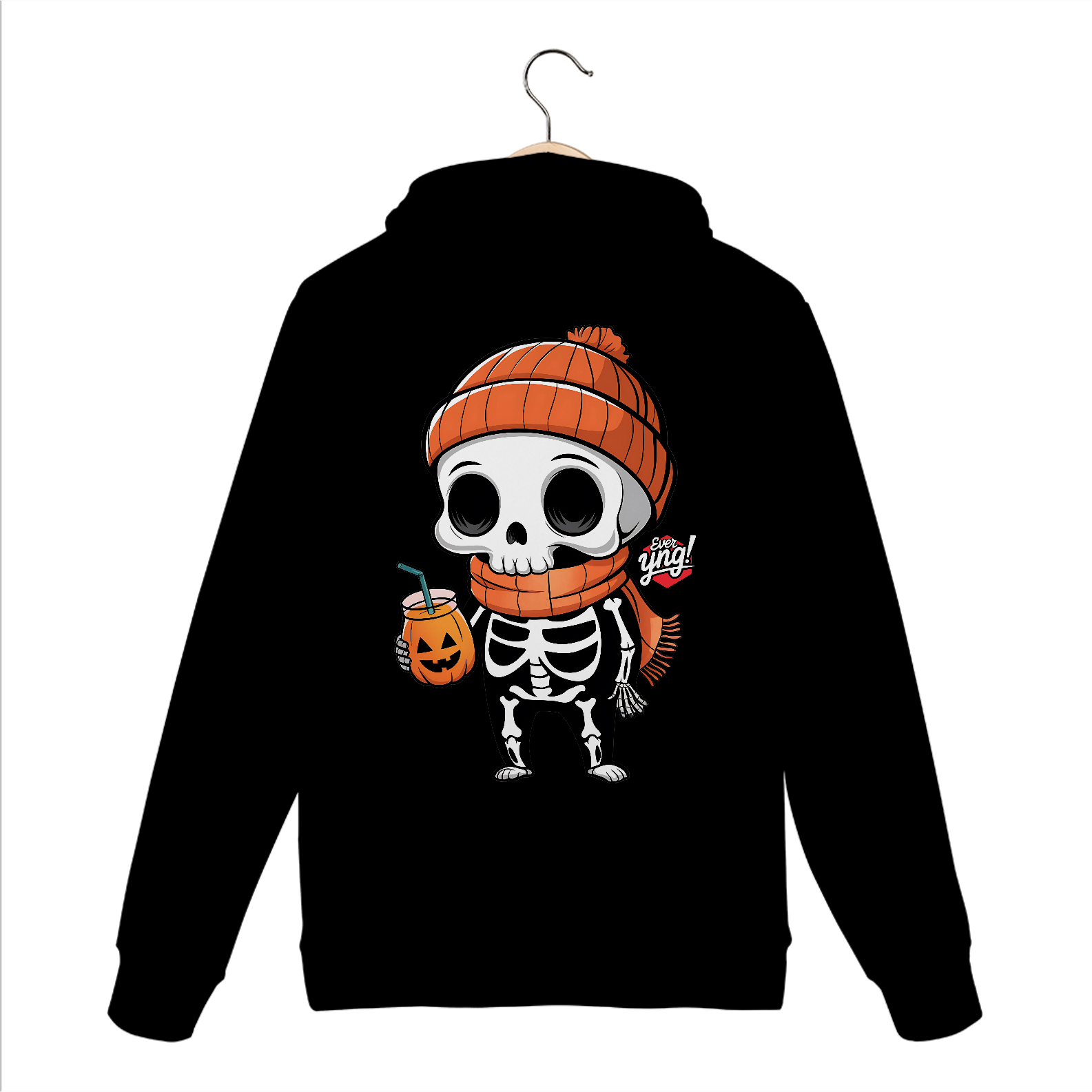 Traga a alegria do Halloween para o seu dia a dia com esta estampa divertida de um esqueleto de desenho animado! Com um gorro laranja e uma xícara de "suco de abóbora", o esqueleto exibe um sorriso contagiante que vai alegrar qualquer look. É uma peça perfeita para as festividades, mas também para quem adora um estilo descontraído e divertido no cotidiano. Com a qualidade da "Ever Yng!", este moletom é um must-have para os jovens que amam se expressar!