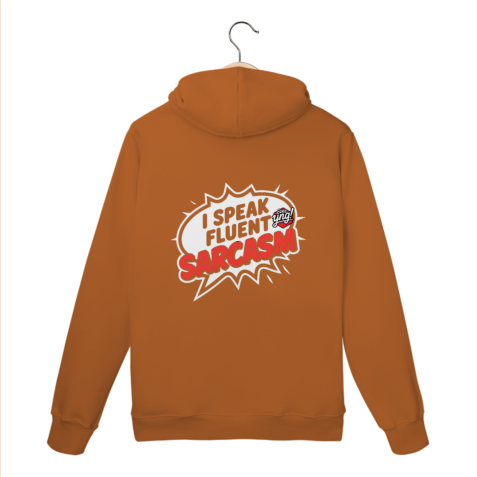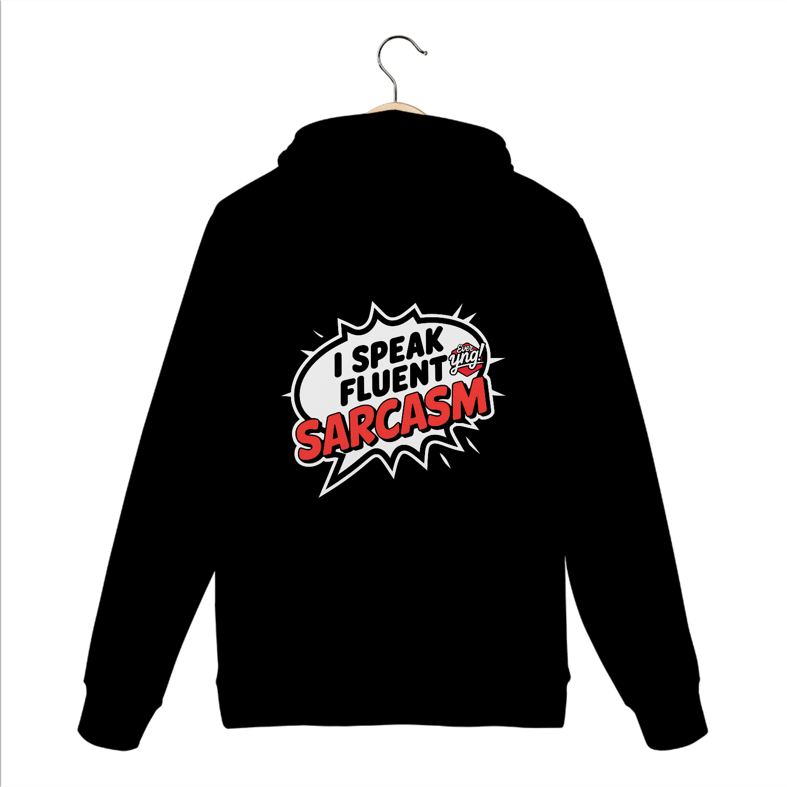 Este moletom é feita para os mestres da ironia. Com um balão de fala cômico em formato de estrela e a frase "EU FALO SARCASMO FLUENTE" em letras vermelhas, essa peça é uma afirmação de atitude e personalidade. O fundo escuro destaca o design simples e direto, tornando essa estampa uma escolha irreverente para quem adora o sarcasmo como forma de expressão. A Ever Yng! entrega novamente uma peça de alta qualidade com estilo jovem e criativo.