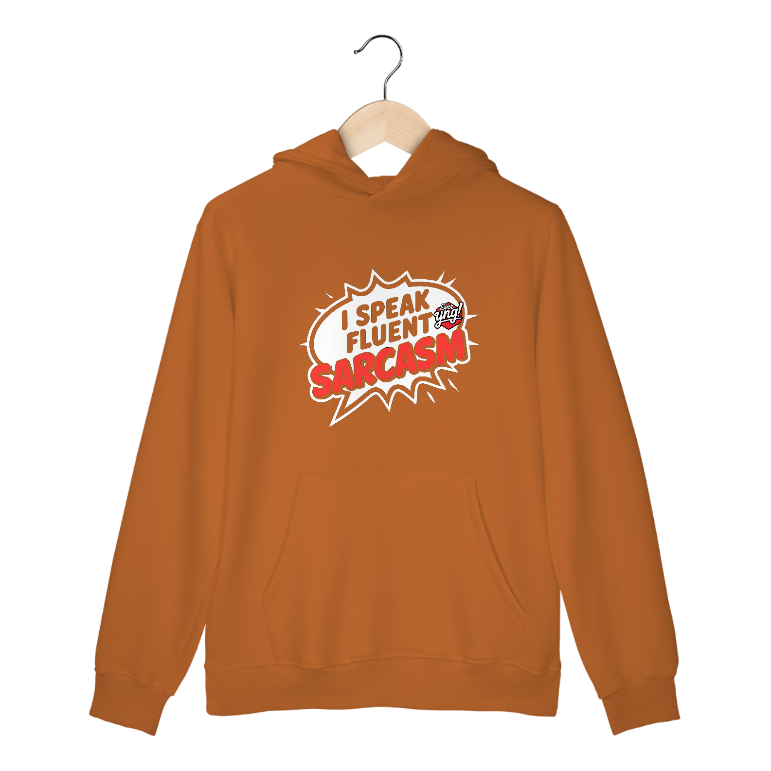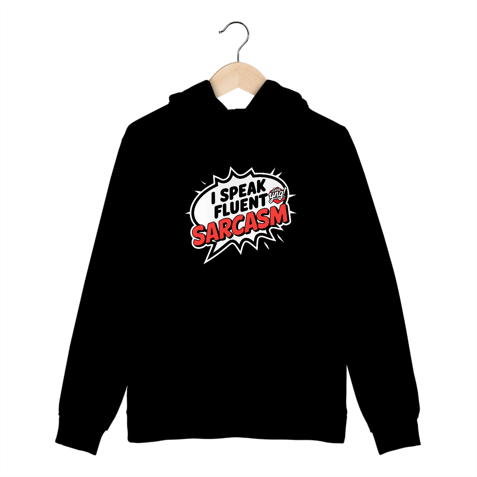 Este moletom é feita para os mestres da ironia. Com um balão de fala cômico em formato de estrela e a frase "EU FALO SARCASMO FLUENTE" em letras vermelhas, essa peça é uma afirmação de atitude e personalidade. O fundo escuro destaca o design simples e direto, tornando essa estampa uma escolha irreverente para quem adora o sarcasmo como forma de expressão. A Ever Yng! entrega novamente uma peça de alta qualidade com estilo jovem e criativo.