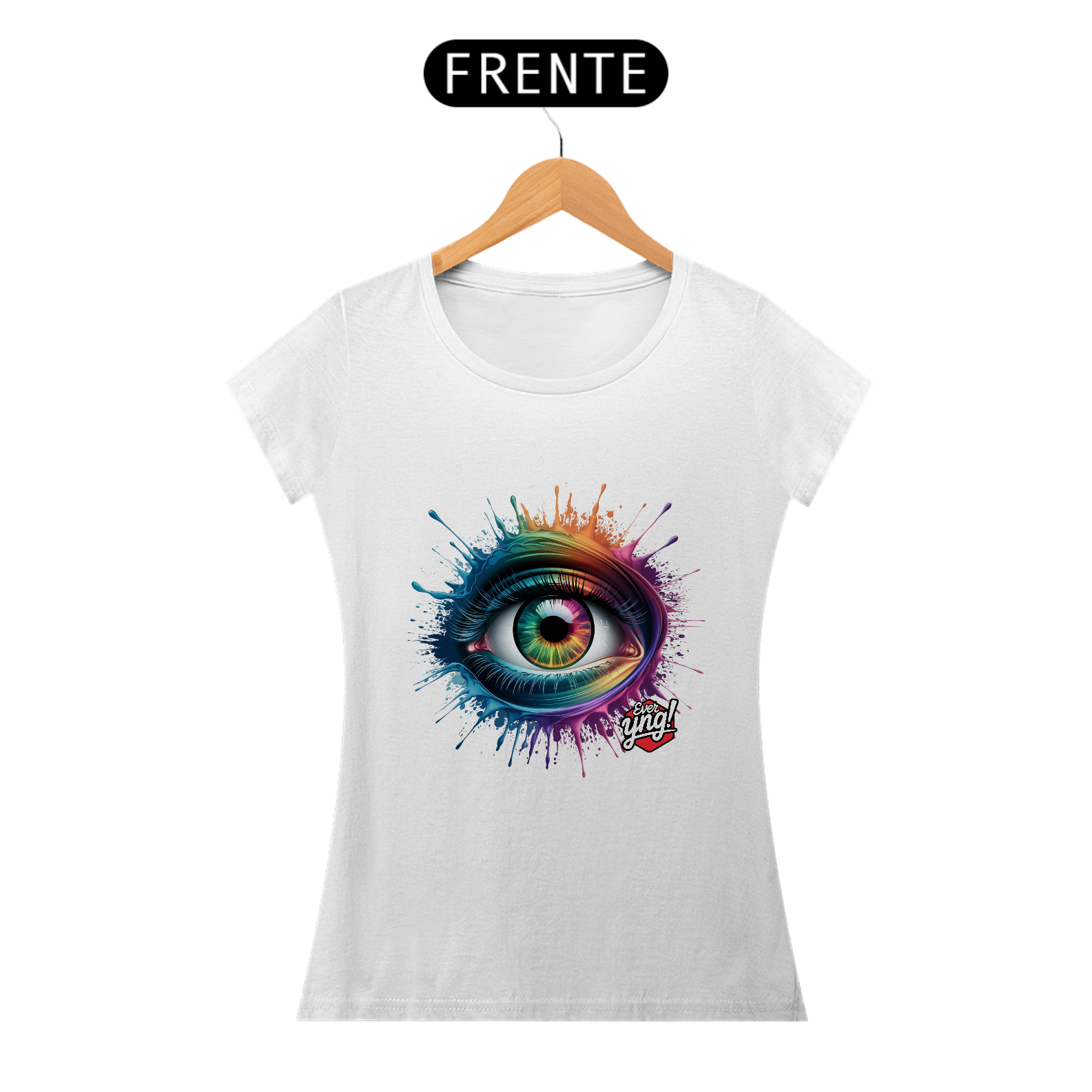 Entre em um mundo de cores e energia com a estampa "Explosão de Olhar". Um olho multicolorido cercado por respingos dinâmicos de tinta em um padrão radial traz uma sensação vibrante de movimento e expressão. Cada detalhe desta peça da Ever Yng! irradia juventude e vitalidade, lembrando que o estilo é eterno e, aqui, envelhecer é opcional. Use arte, use cor, use sua liberdade!