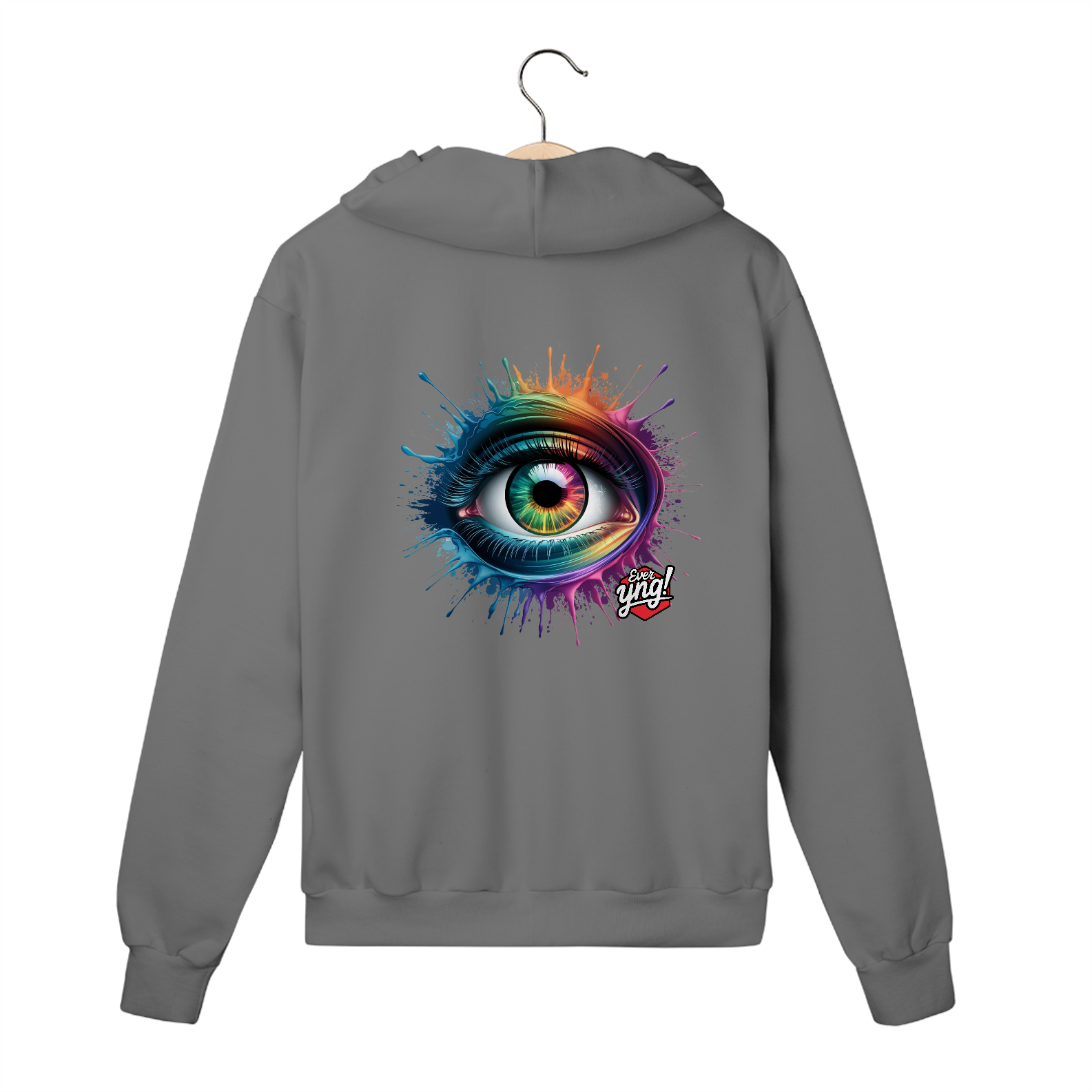 Entre em um mundo de cores e energia com a estampa "Explosão de Olhar". Um olho multicolorido cercado por respingos dinâmicos de tinta em um padrão radial traz uma sensação vibrante de movimento e expressão. Cada detalhe desta peça da Ever Yng! irradia juventude e vitalidade, lembrando que o estilo é eterno e, aqui, envelhecer é opcional. Use arte, use cor, use sua liberdade!