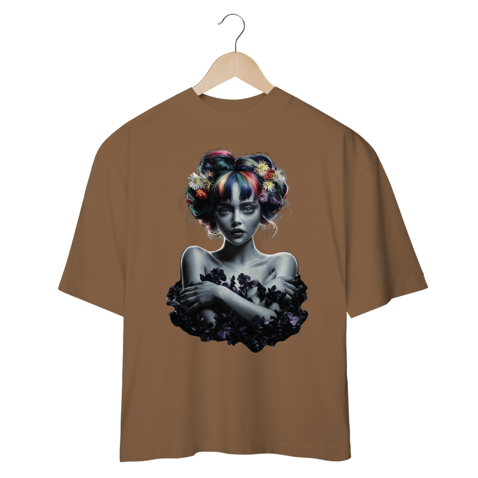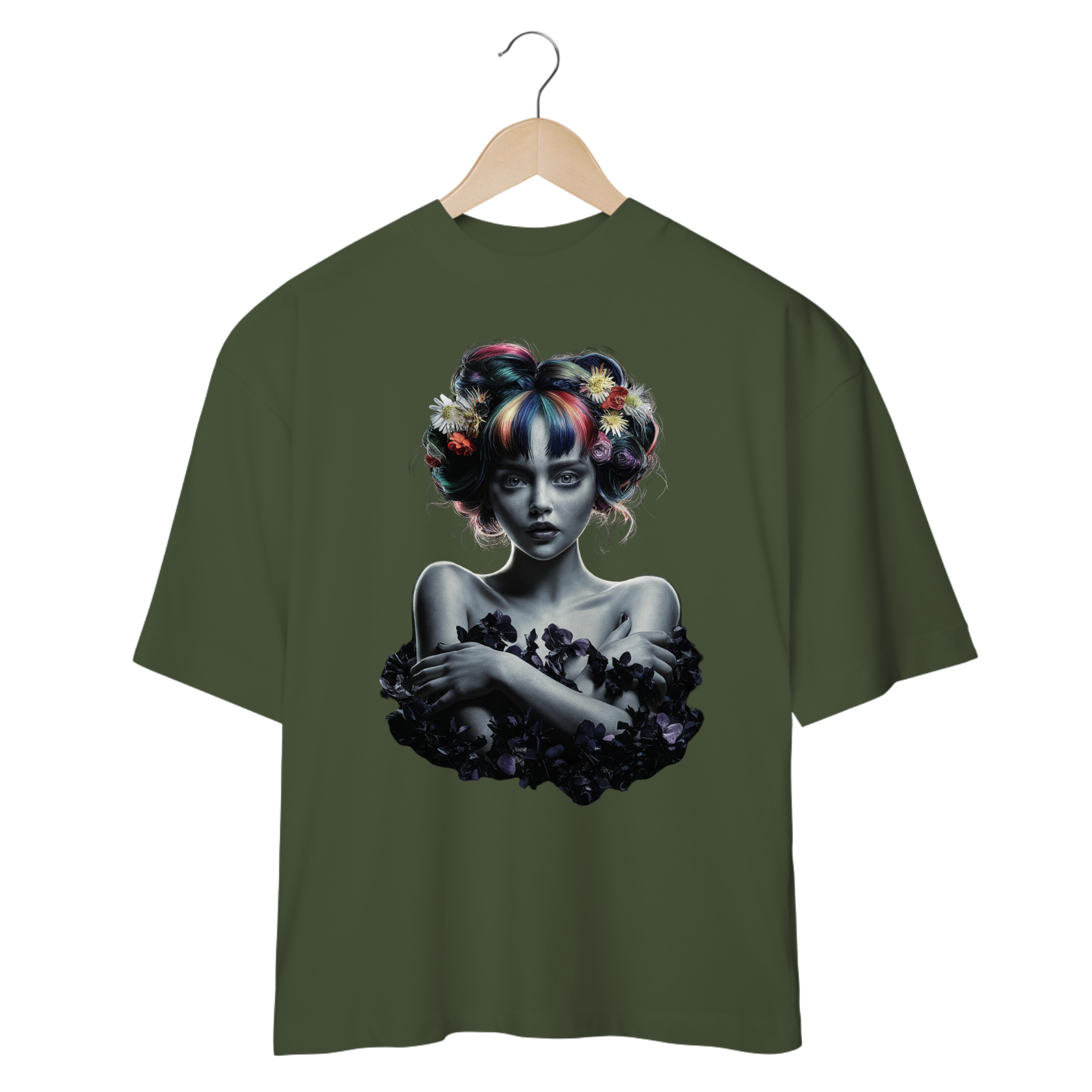 Uma explosão de cores e flores envolvem essa jovem de cabelos multicoloridos! A ever Yng! traz uma obra vibrante, com tons de azul, rosa, amarelo e verde que se destacam contra o fundo escuro. Essa peça é perfeita para quem ama um estilo ousado e criativo, onde cada detalhe faz parte de um visual deslumbrante e expressivo.