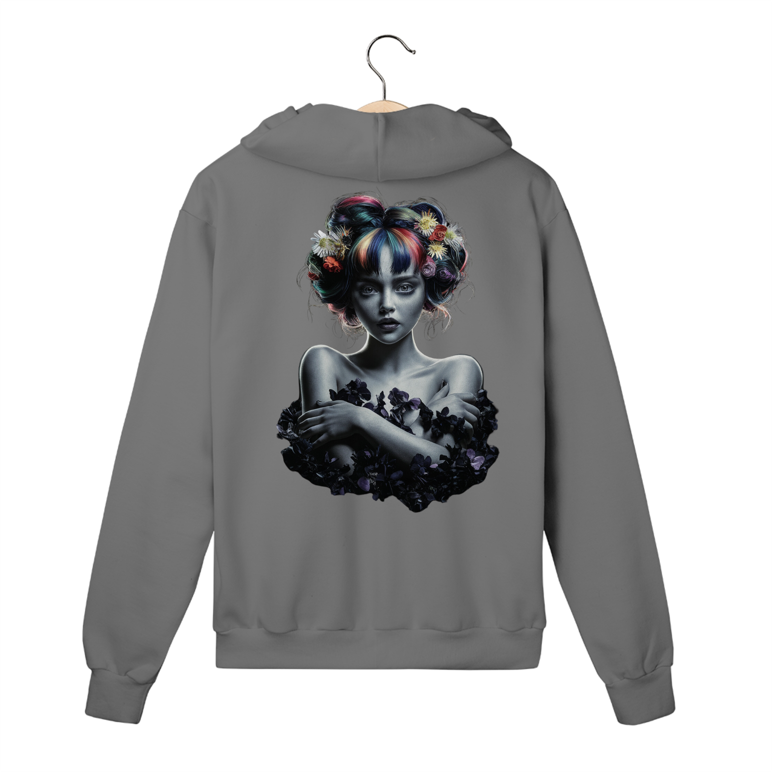 Uma explosão de cores e flores envolvem essa jovem de cabelos multicoloridos! A ever Yng! traz uma obra vibrante, com tons de azul, rosa, amarelo e verde que se destacam contra o fundo escuro. Essa peça é perfeita para quem ama um estilo ousado e criativo, onde cada detalhe faz parte de um visual deslumbrante e expressivo.