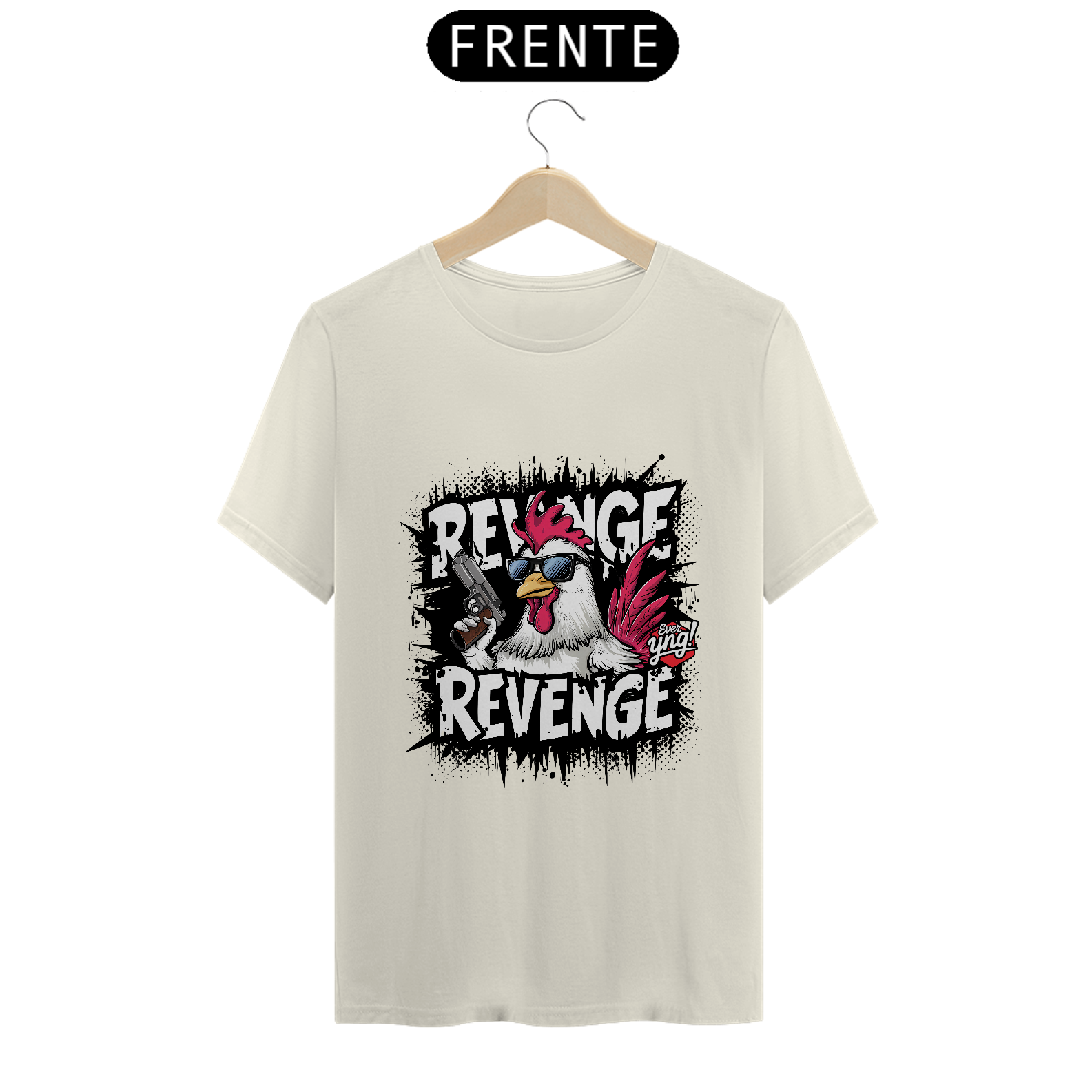 O galo mais feroz que você já viu está pronto para a vingança! Usando óculos escuros e segurando uma pistola, este galo traz uma atitude rebelde e desafiadora. A palavra "VINGANÇA" em letras grafitadas completa o visual ousado e cômico dessa estampa. Com um fundo preto respingado, a Ever Yng! entrega uma peça cheia de estilo, feita para aqueles que gostam de se destacar e mostrar que envelhecer é opcional.