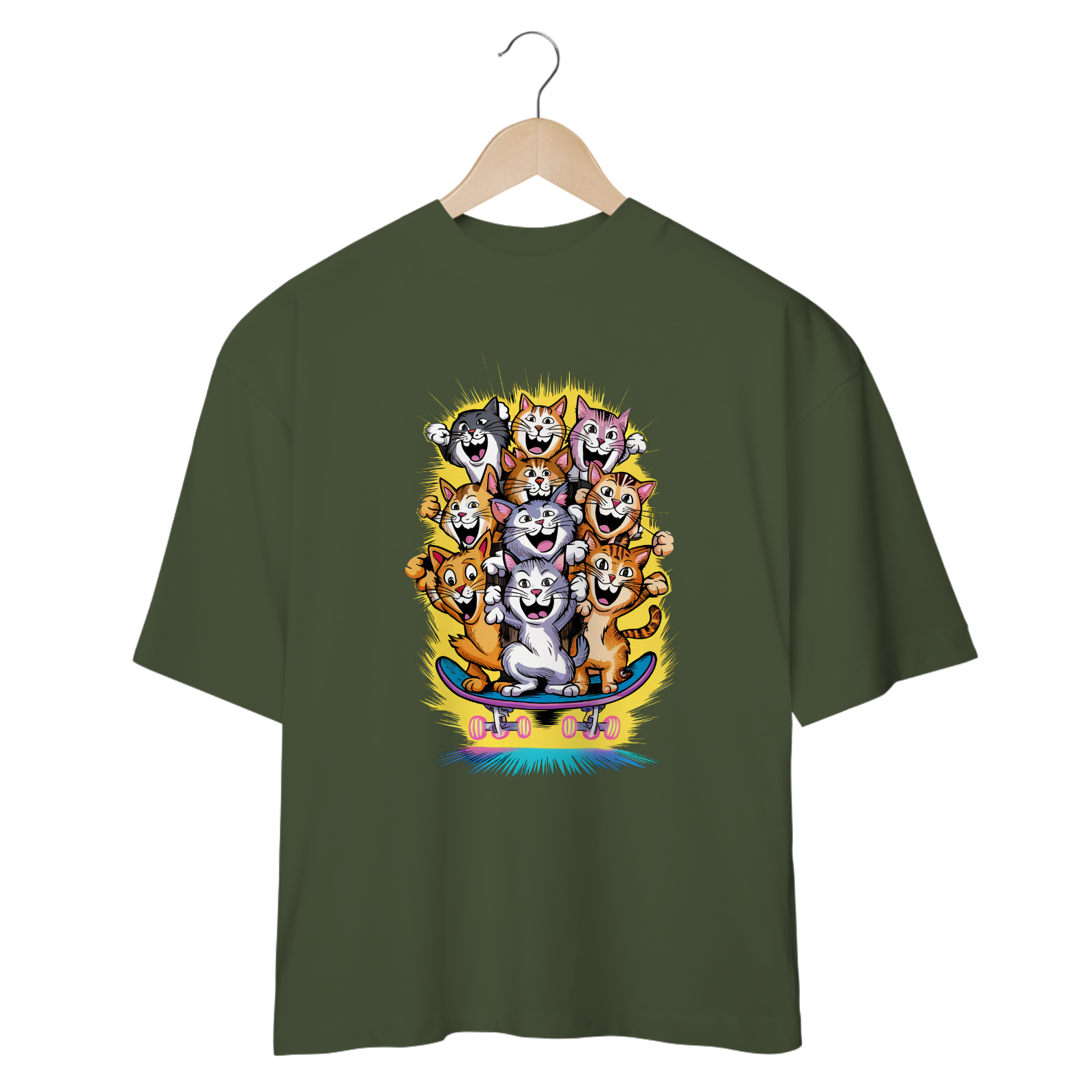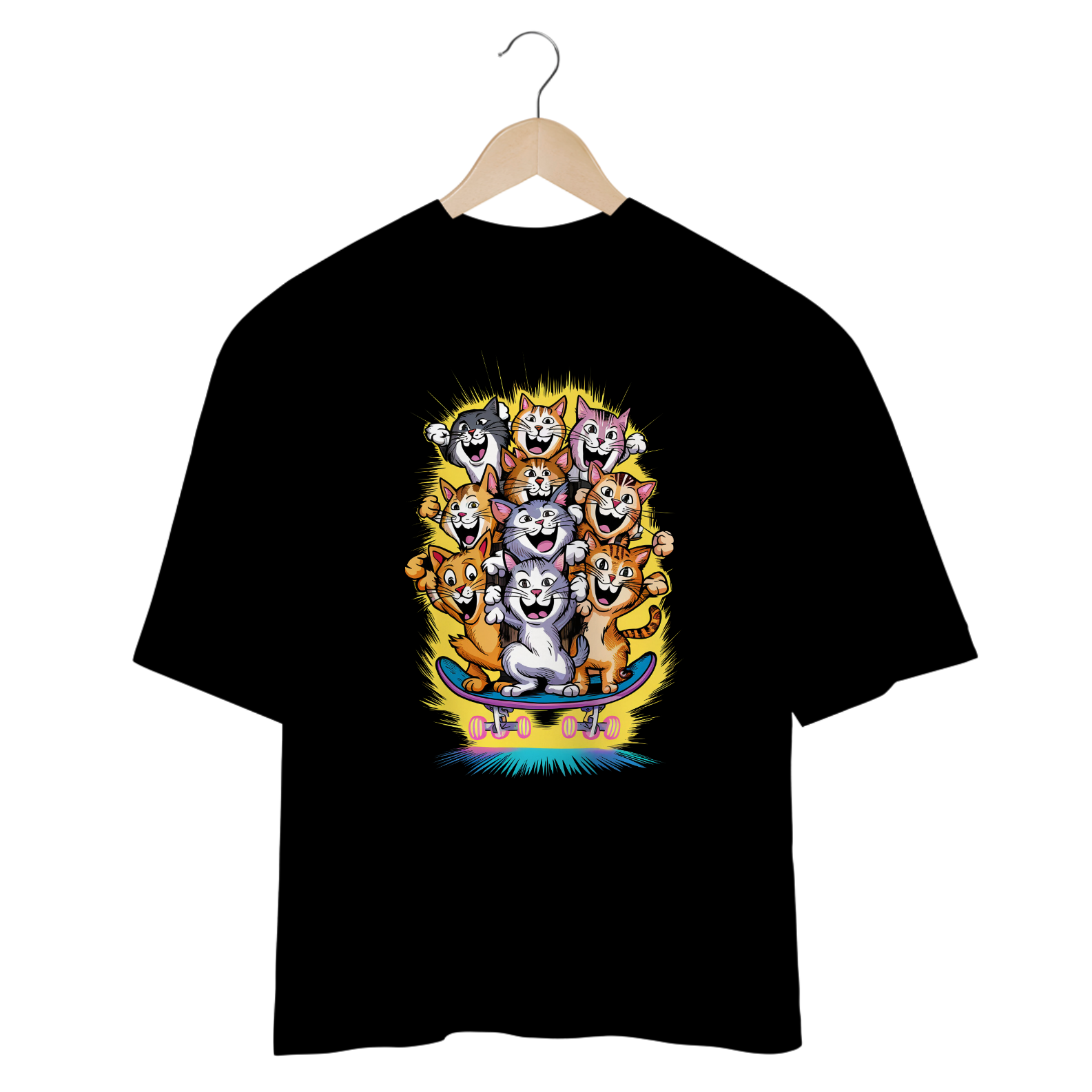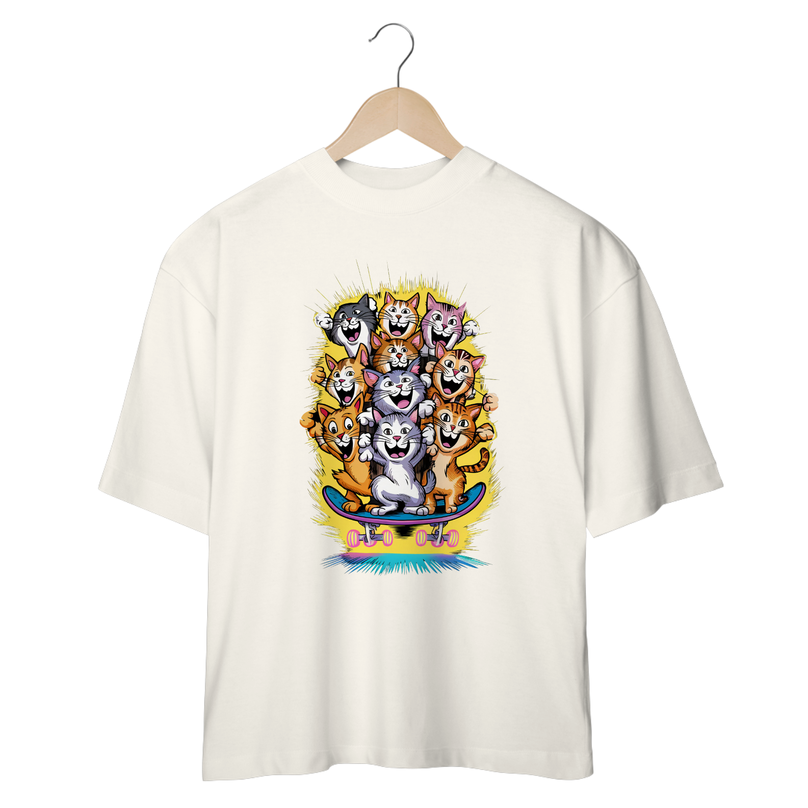 Liberte sua adrenalina e estilo com a estampa "Gatos Skatistas" da ever Yng!. Esta camiseta traz uma vibrante ilustração de gatos coloridos em plena ação, deslizando sobre um skate em um fundo amarelo radiante que reflete energia e diversão. Os gatos, cada um com cores únicas, representam a atitude ousada e descolada que você carrega. Se você é alguém que adora quebrar regras com estilo e viver cada momento com intensidade, essa estampa é a sua cara. Transforme seu look com um toque de aventura felina e mostre que sua vibe é jovem, energética e sem limites. Aging is optional, mas estilo é essencial!