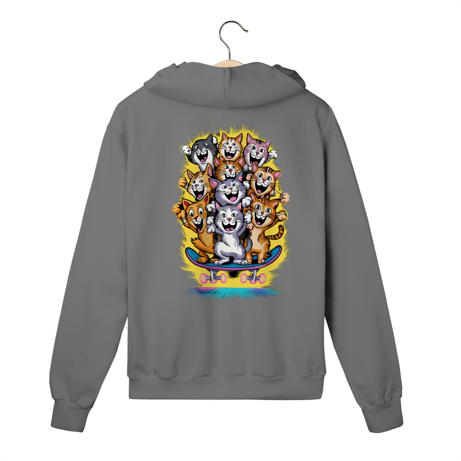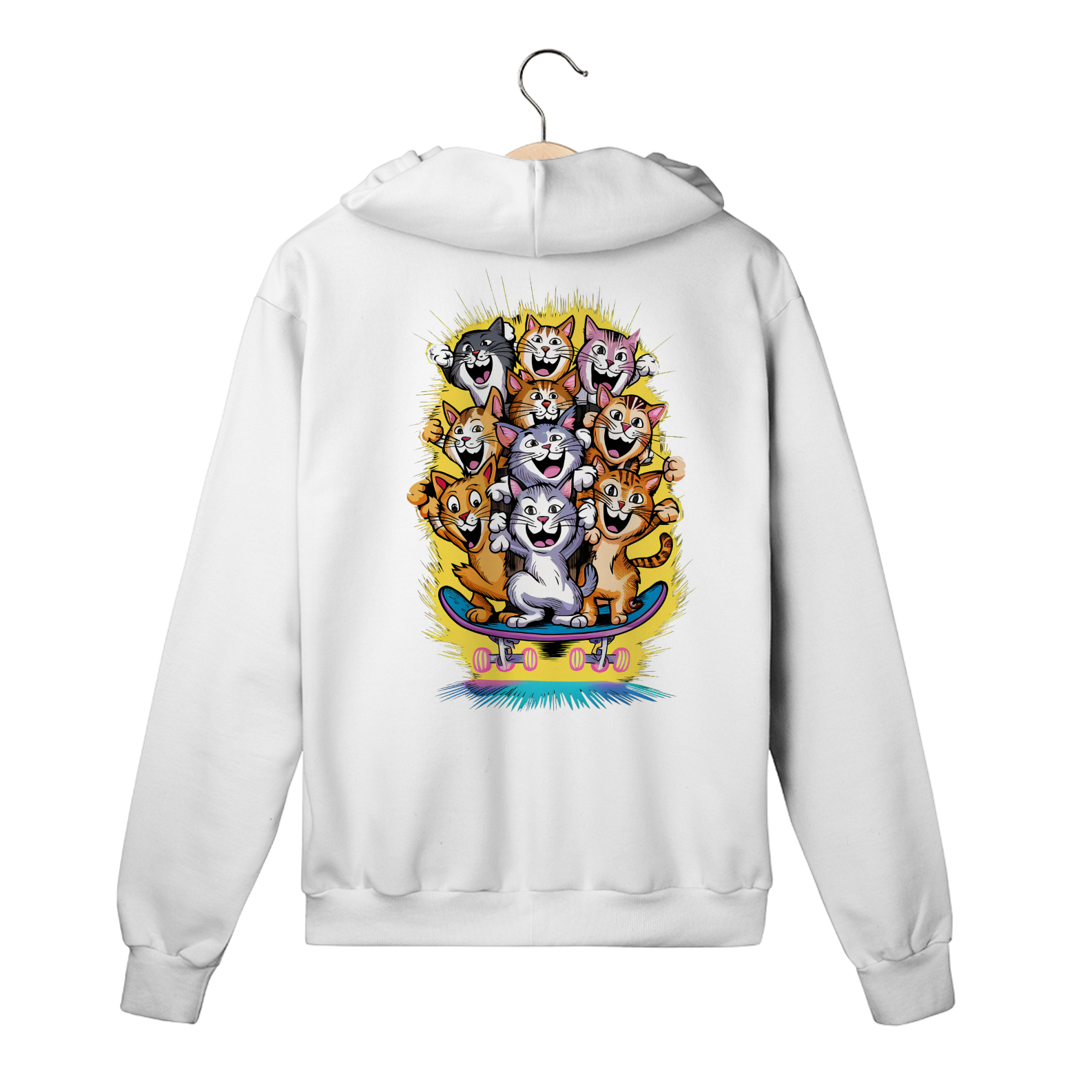 Liberte sua adrenalina e estilo com a estampa "Gatos Skatistas" da ever Yng!. Este Moletom traz uma vibrante ilustração de gatos coloridos em plena ação, deslizando sobre um skate em um fundo amarelo radiante que reflete energia e diversão. Os gatos, cada um com cores únicas, representam a atitude ousada e descolada que você carrega. Se você é alguém que adora quebrar regras com estilo e viver cada momento com intensidade, essa estampa é a sua cara. Transforme seu look com um toque de aventura felina e mostre que sua vibe é jovem, energética e sem limites. Aging is optional, mas estilo é essencial!