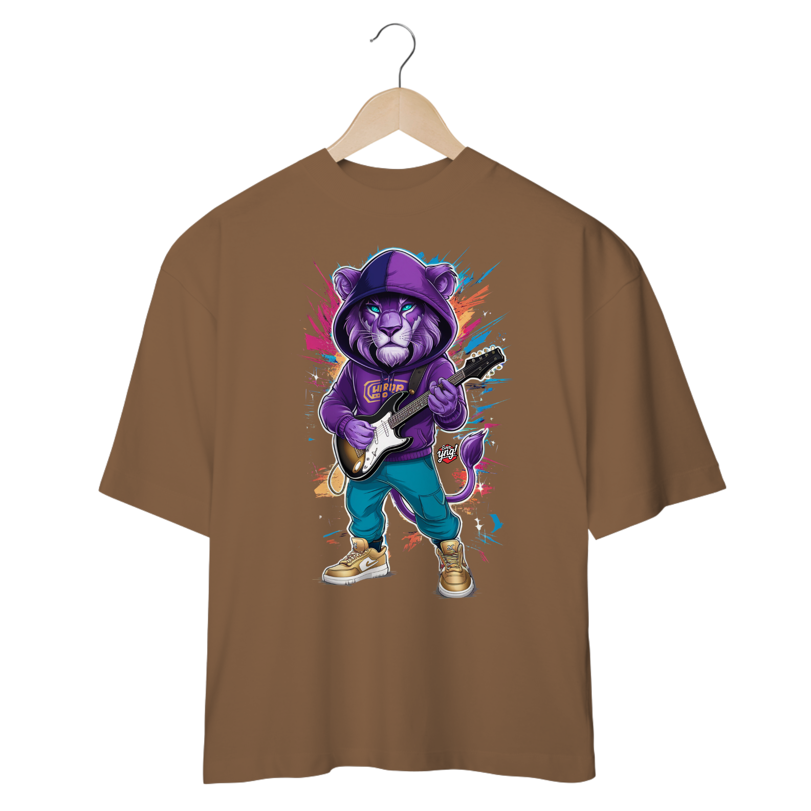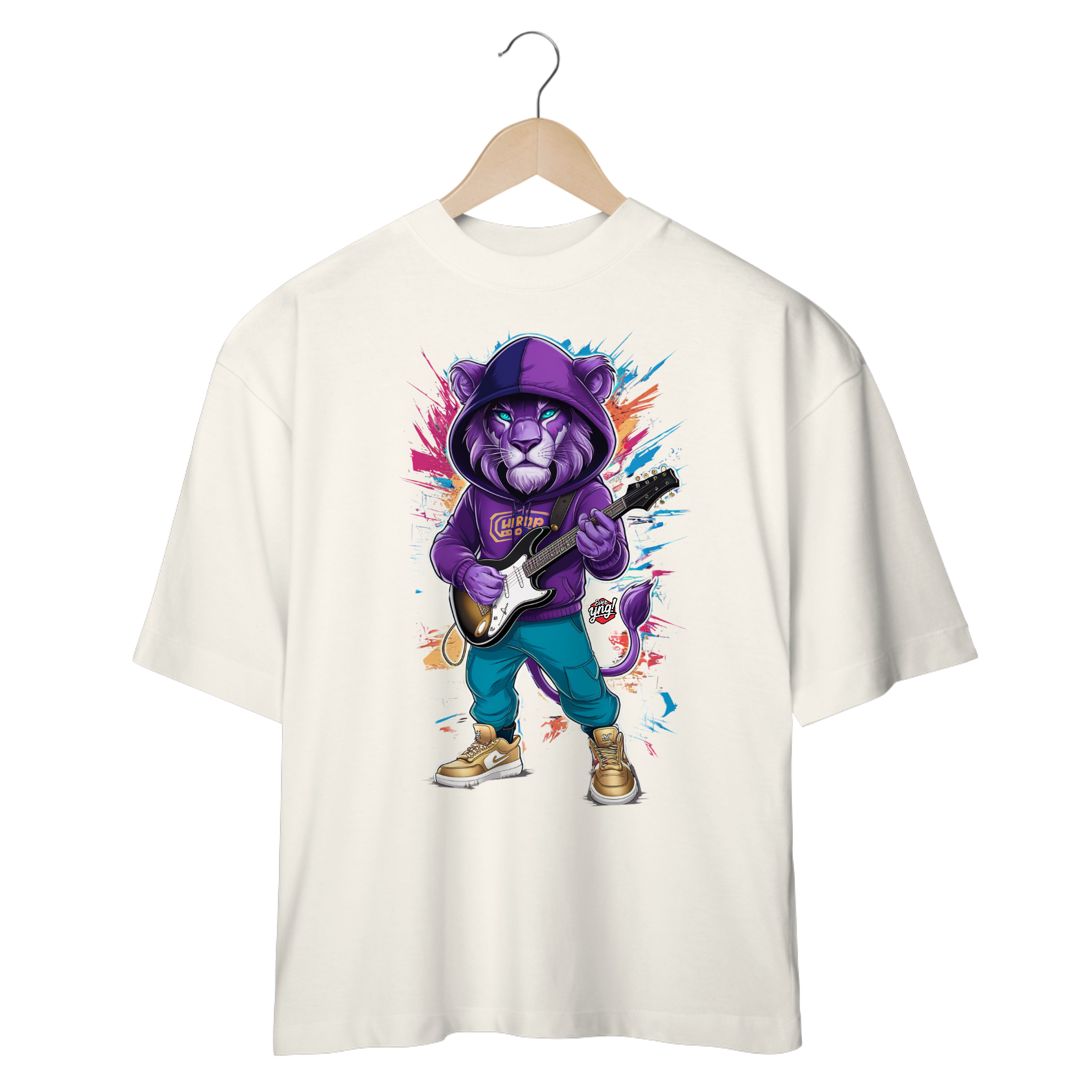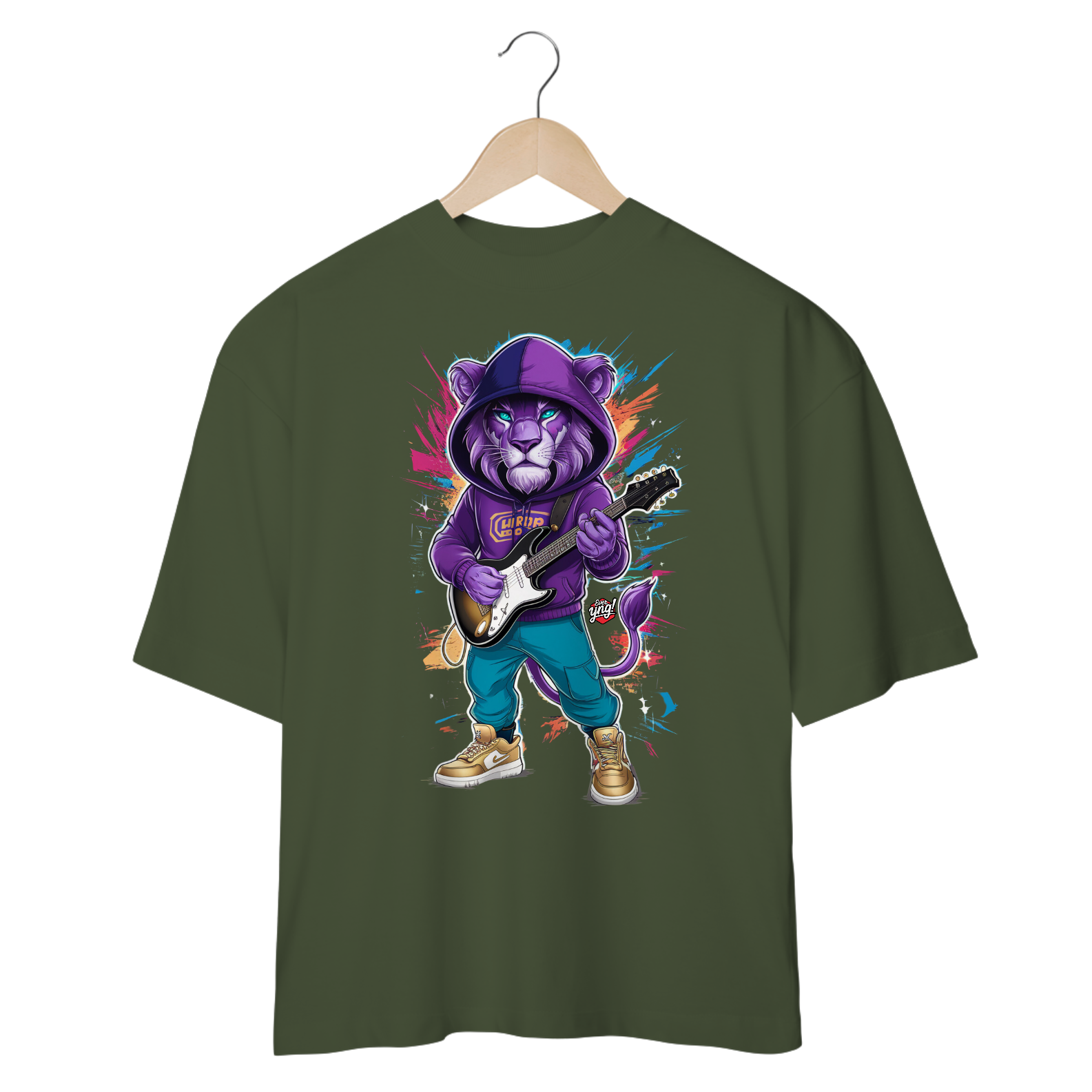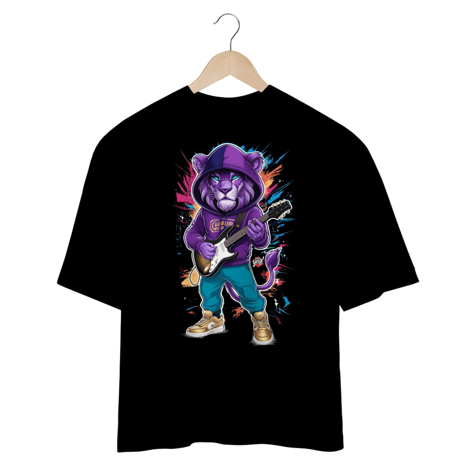 Aumente o volume com a estampa "Leão Rock Star", onde o rei da selva se transforma no rei do rock! Vestido com moletom roxo, calças azuis e tênis dourados, o leão empunha sua guitarra elétrica em um fundo cheio de explosão de cores, simbolizando a energia e a paixão da música. Esta é a camiseta para quem vive no ritmo do rock, com um estilo selvagem e destemido. Mostre que, no palco da vida, você é o verdadeiro rock star. ever Yng! é a marca para quem sabe que aging is optional, mas atitude e estilo são obrigatórios.