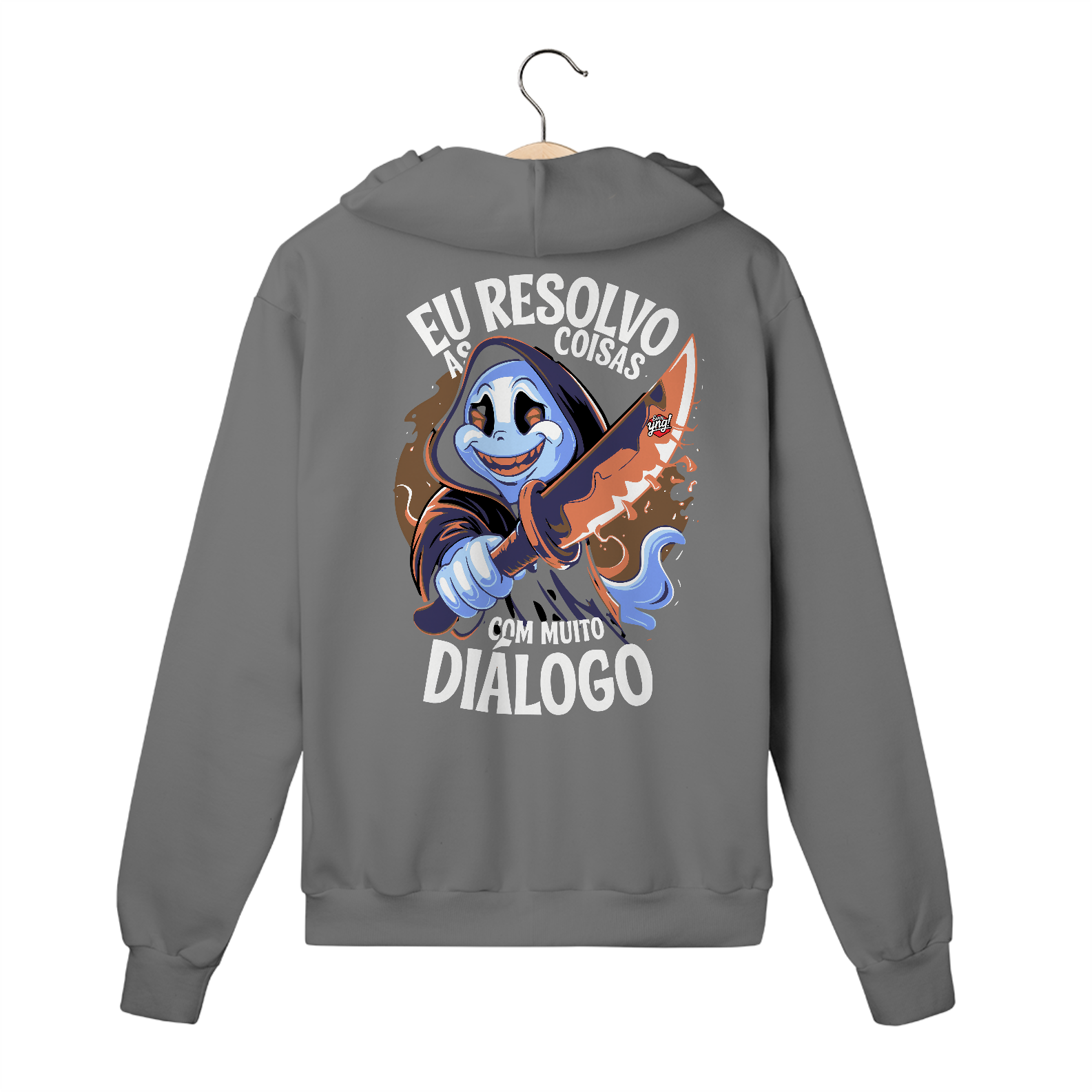 Quer dizer ao mundo que você não foge dos problemas... de um jeito criativo? Nosso moletom "Eu resolvo as coisas com muito diálogo" traz o equilíbrio perfeito entre humor ácido e estilo descolado. A estampa de um personagem engraçado segurando uma faca, acompanhada da frase irônica, é ideal para quem adora expressar sua personalidade de forma leve e irreverente. Com um toque de sarcasmo, essa peça é feita para quem não tem medo de dizer o que pensa, sempre com um sorriso no rosto. Combine com seu look casual e cause impacto por onde passar!