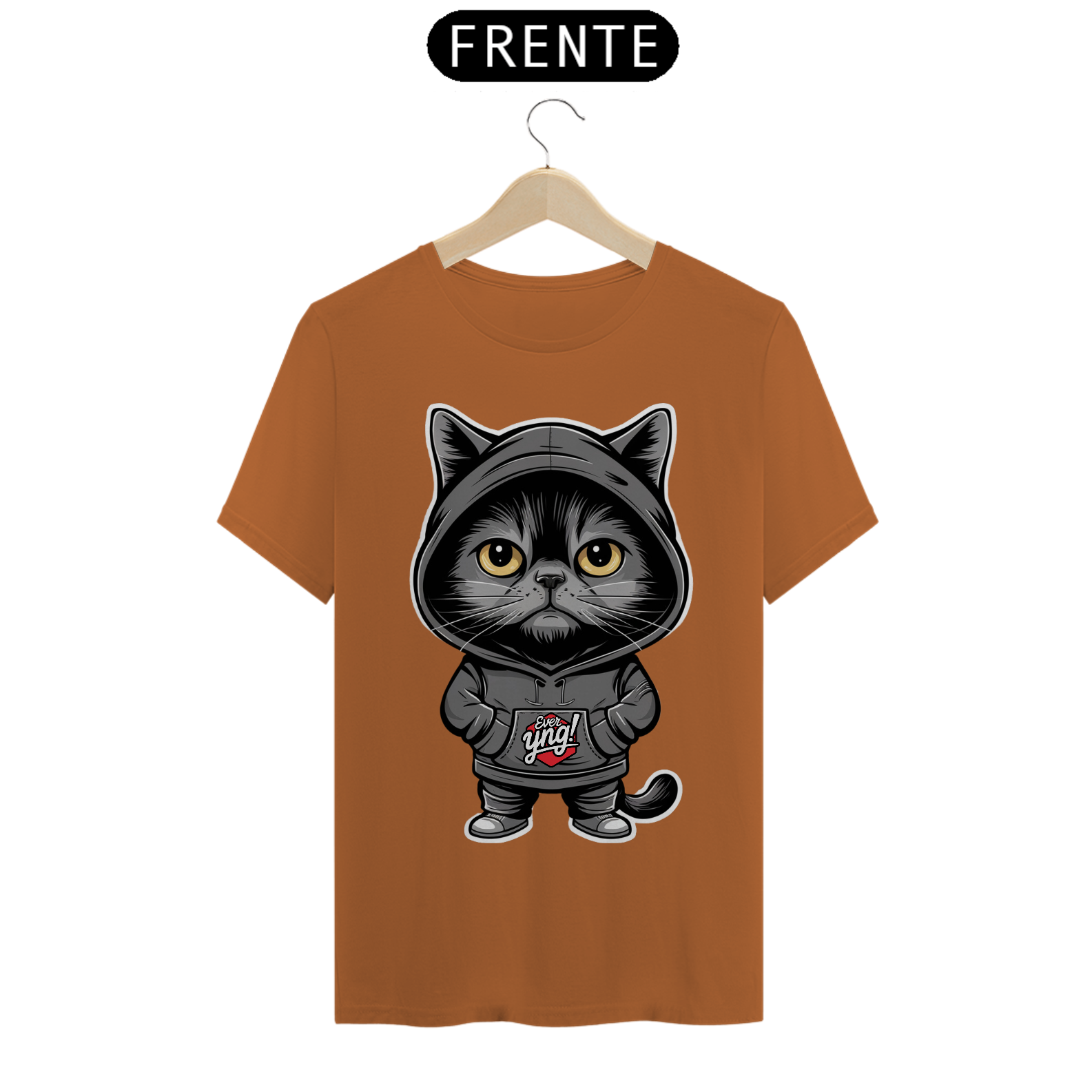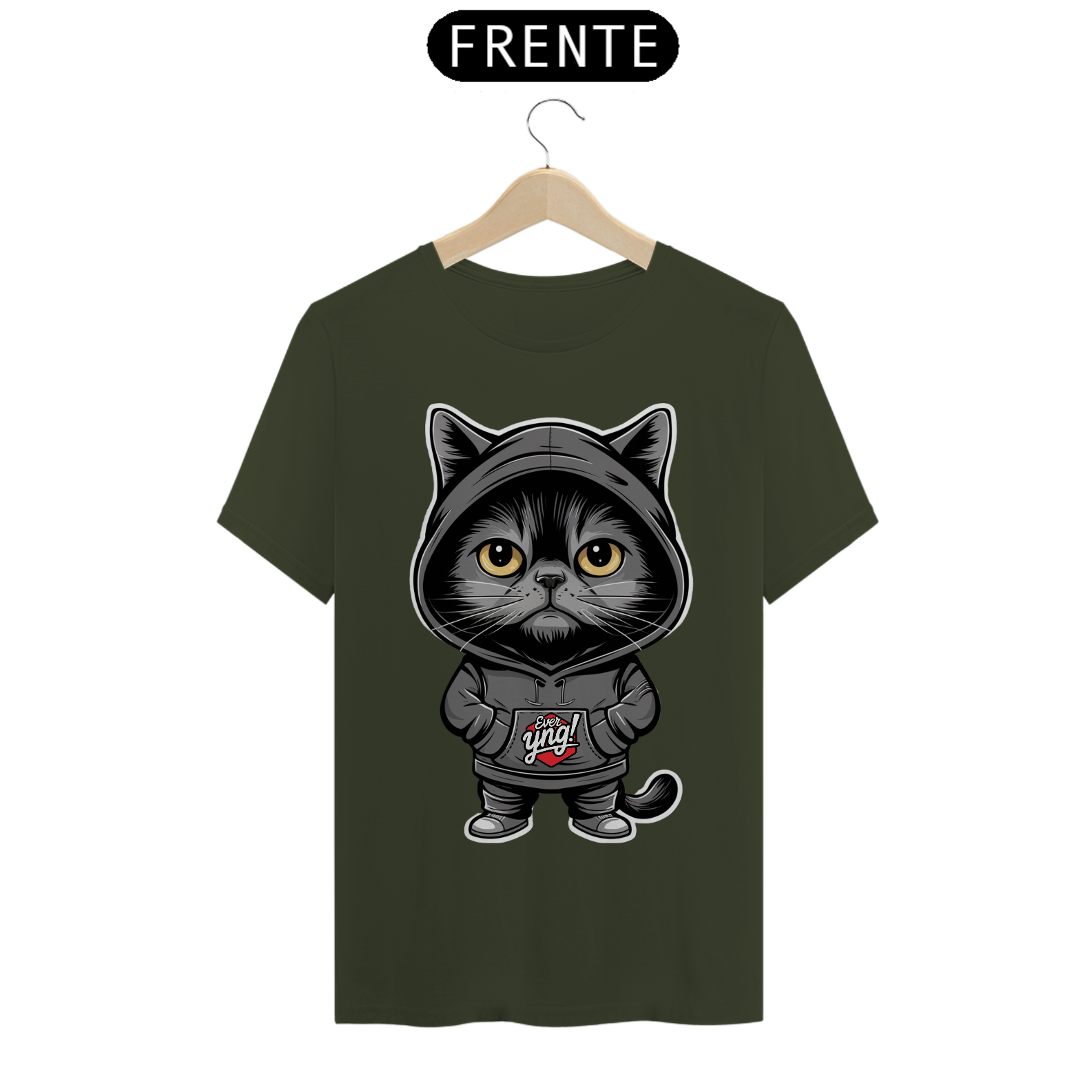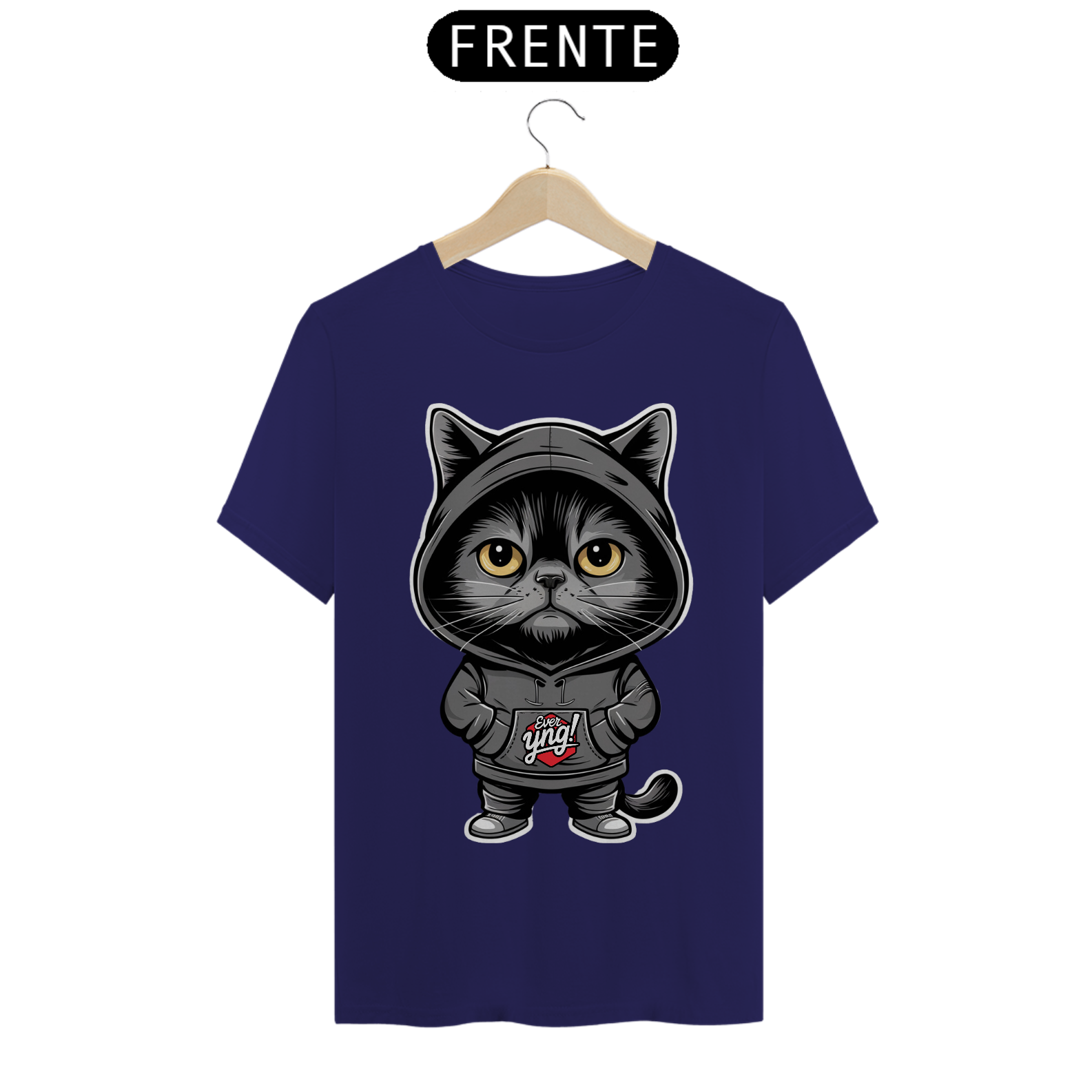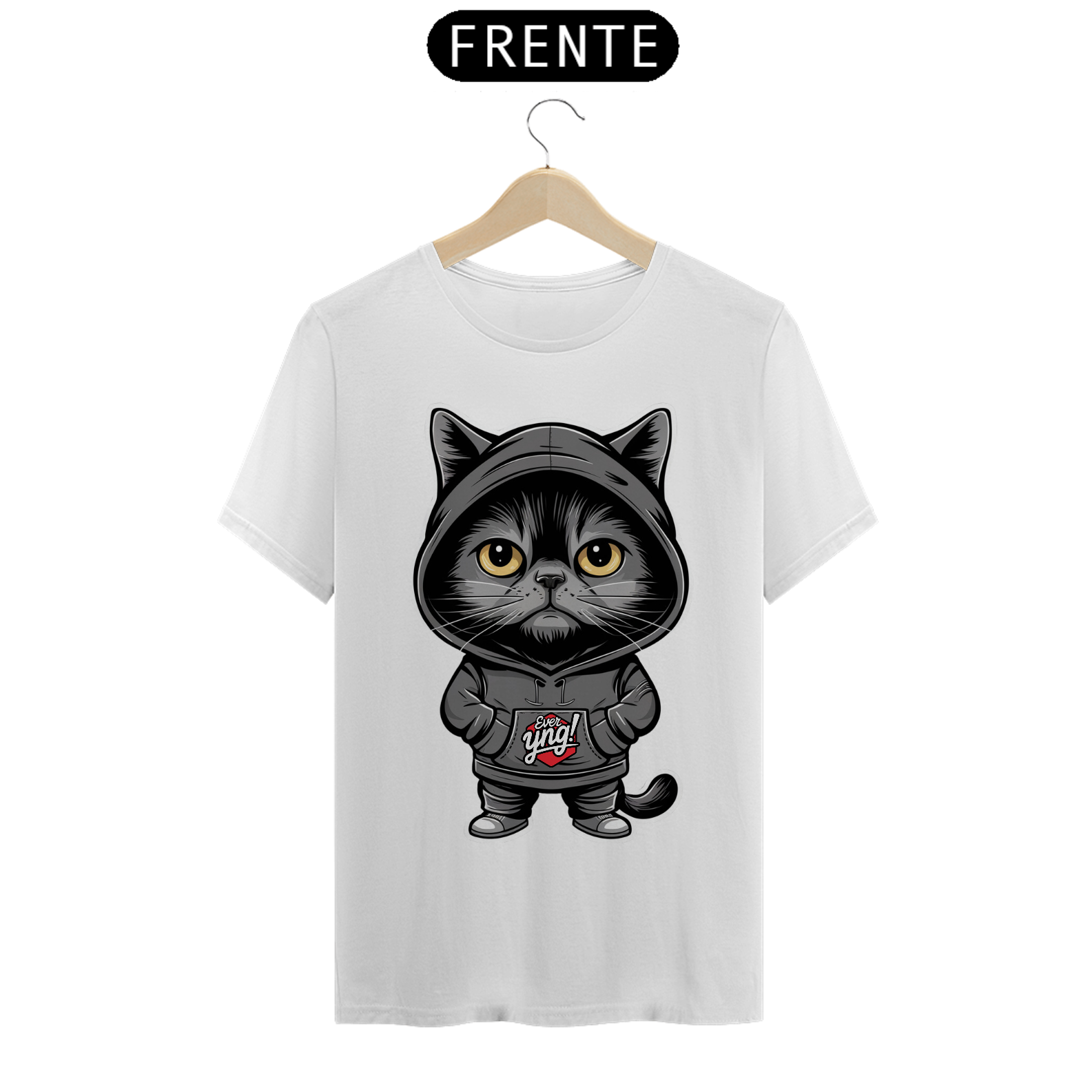 Seja o centro das atenções com a camisa "O Gato Enigmático" da ever Yng!. Este felino estilizado e misterioso não é apenas um gato qualquer. Com seus olhos grandes e amarelos e a expressão séria sob um capuz preto, ele emana um ar de mistério e confiança. Se você busca um estilo descolado e enigmático, esta estampa foi feita para você. Na ever Yng!, envelhecer é opcional, e o estilo é eterno!