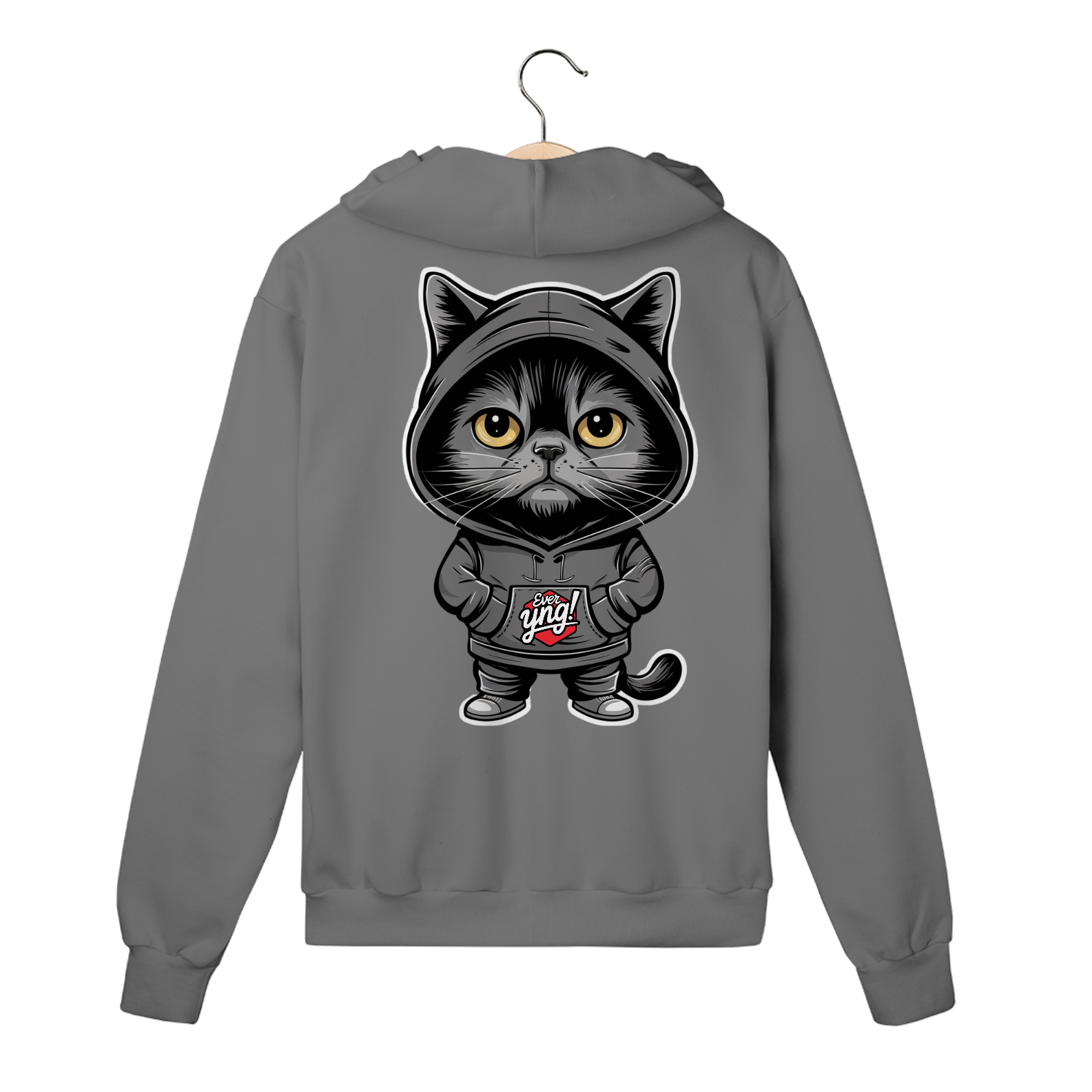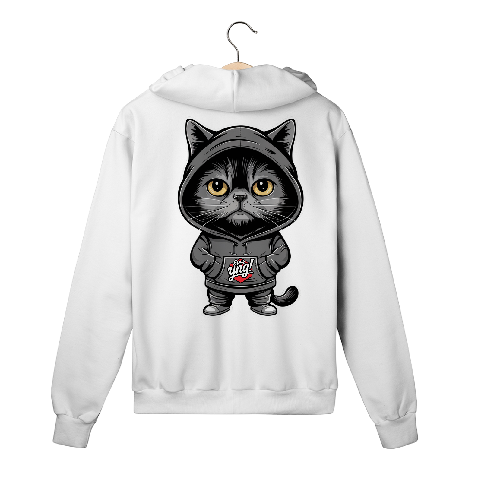 Seja o centro das atenções com a camisa "O Gato Enigmático" da ever Yng!. Este felino estilizado e misterioso não é apenas um gato qualquer. Com seus olhos grandes e amarelos e a expressão séria sob um capuz preto, ele emana um ar de mistério e confiança. Se você busca um estilo descolado e enigmático, esta estampa foi feita para você. Na ever Yng!, envelhecer é opcional, e o estilo é eterno!
