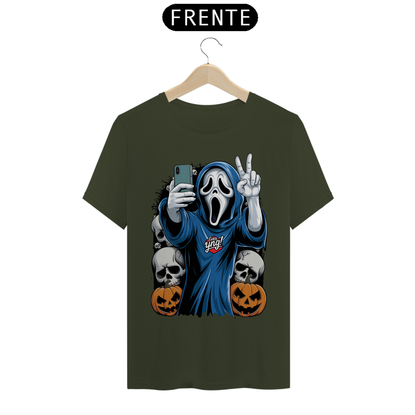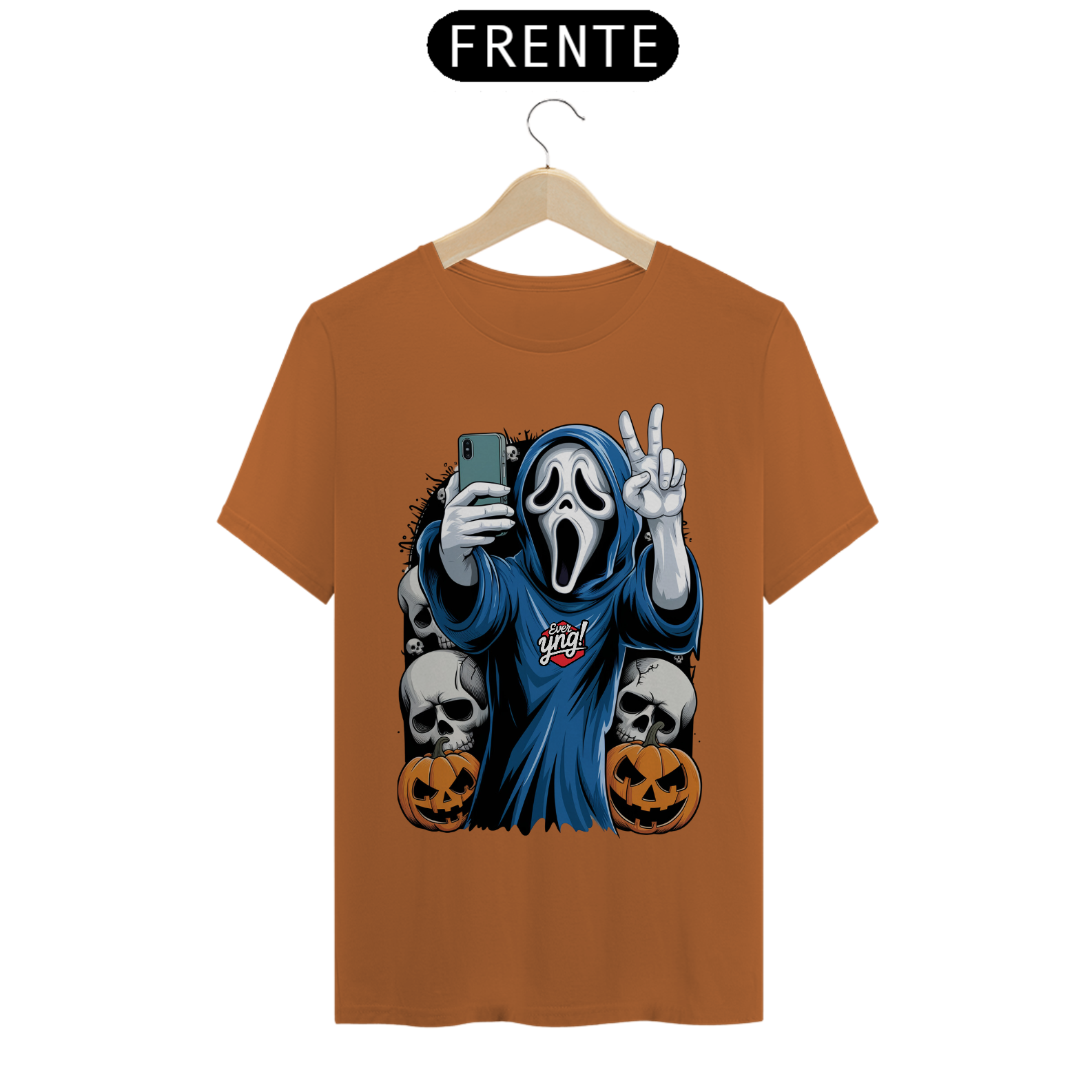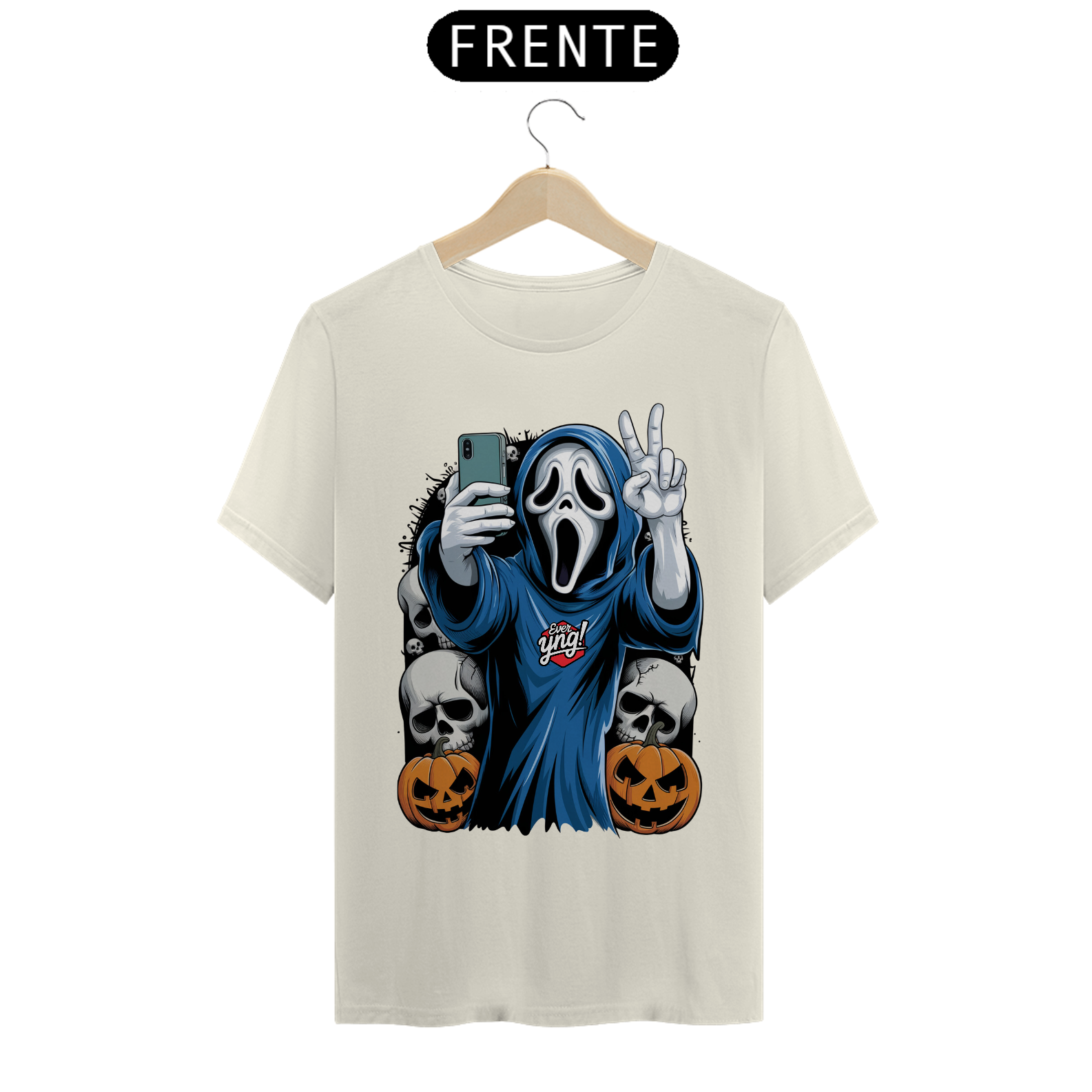 Fantasmagórica e cheia de atitude, a estampa "Peace & Ghosts" da ever Yng! traz o melhor do estilo jovem para o Halloween! Um fantasma moderno, envolto em sua capa azul, segura um smartphone e faz um sinal de paz, misturando o mundo dos mortos com a cultura digital. Ao redor dele, crânios sinistros e abóboras esculpidas fazem desta estampa o toque perfeito para quem adora o clima assustador com uma pitada de irreverência. O fundo suave em tons de bege destaca o visual misterioso, sendo a peça ideal para entrar no espírito das festas de Halloween!