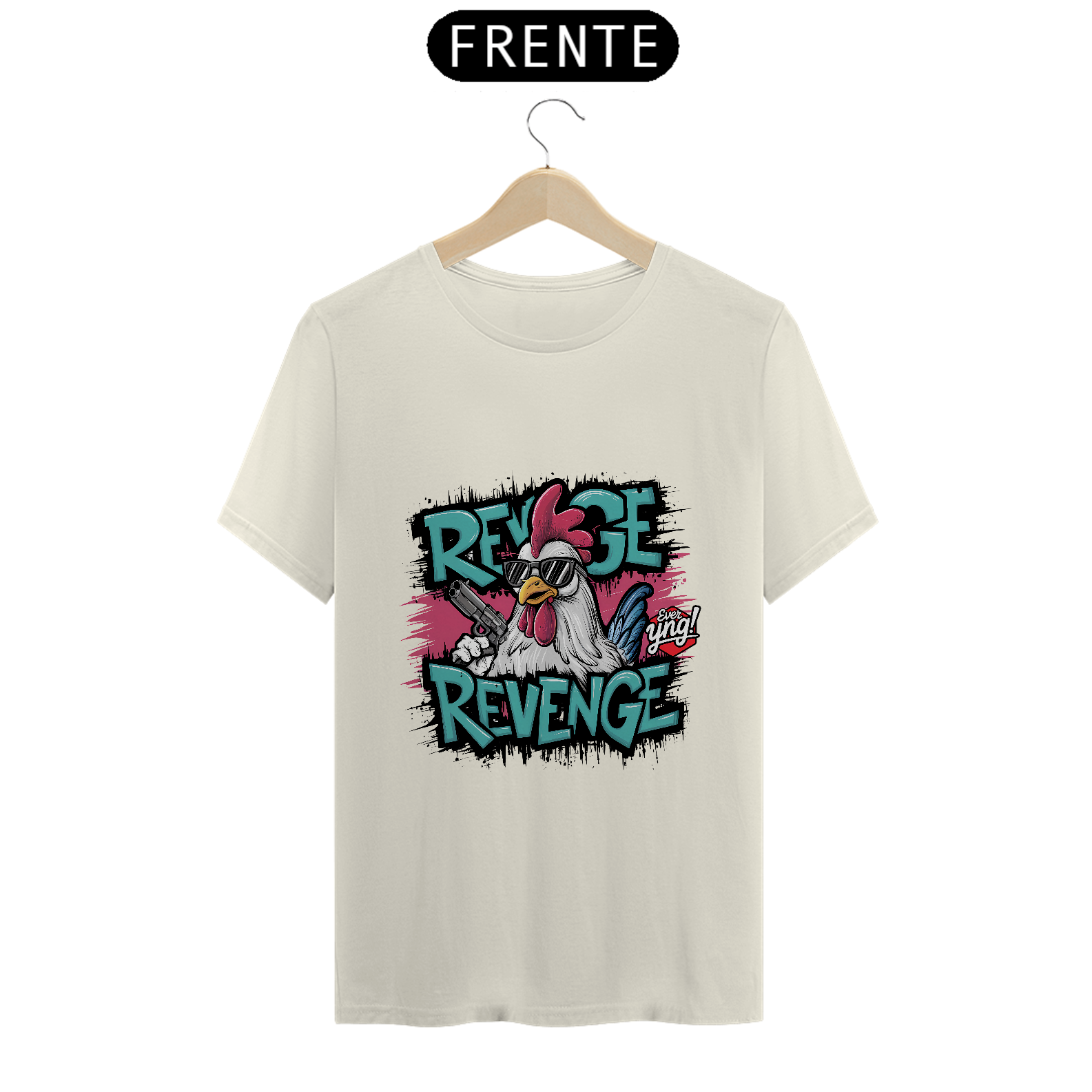 A "Ever Yng!" traz um galo vibrante e cheio de atitude nesta estampa explosiva! O personagem principal, um galo com óculos escuros e uma pistola em mãos, domina o centro da imagem. Com letras grafitadas "REVENGE REVENGE" ao redor, essa peça exala energia e força. O fundo rosa e branco adiciona ainda mais dinamismo, criando um visual moderno e irreverente. Esta peça é para aqueles que não têm medo de se destacar e mostrar atitude com estilo!