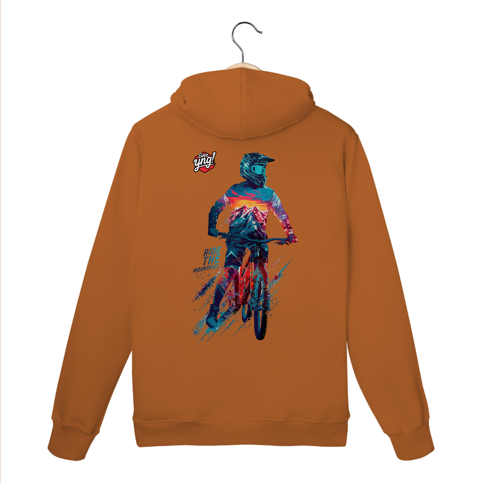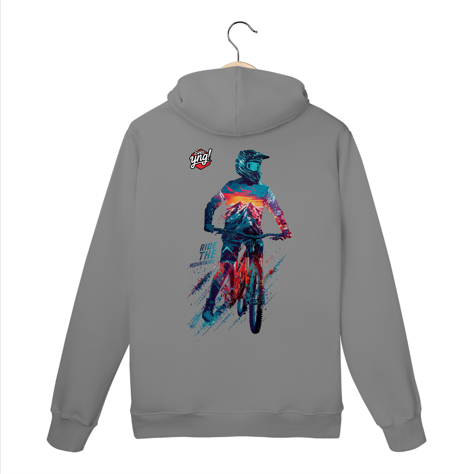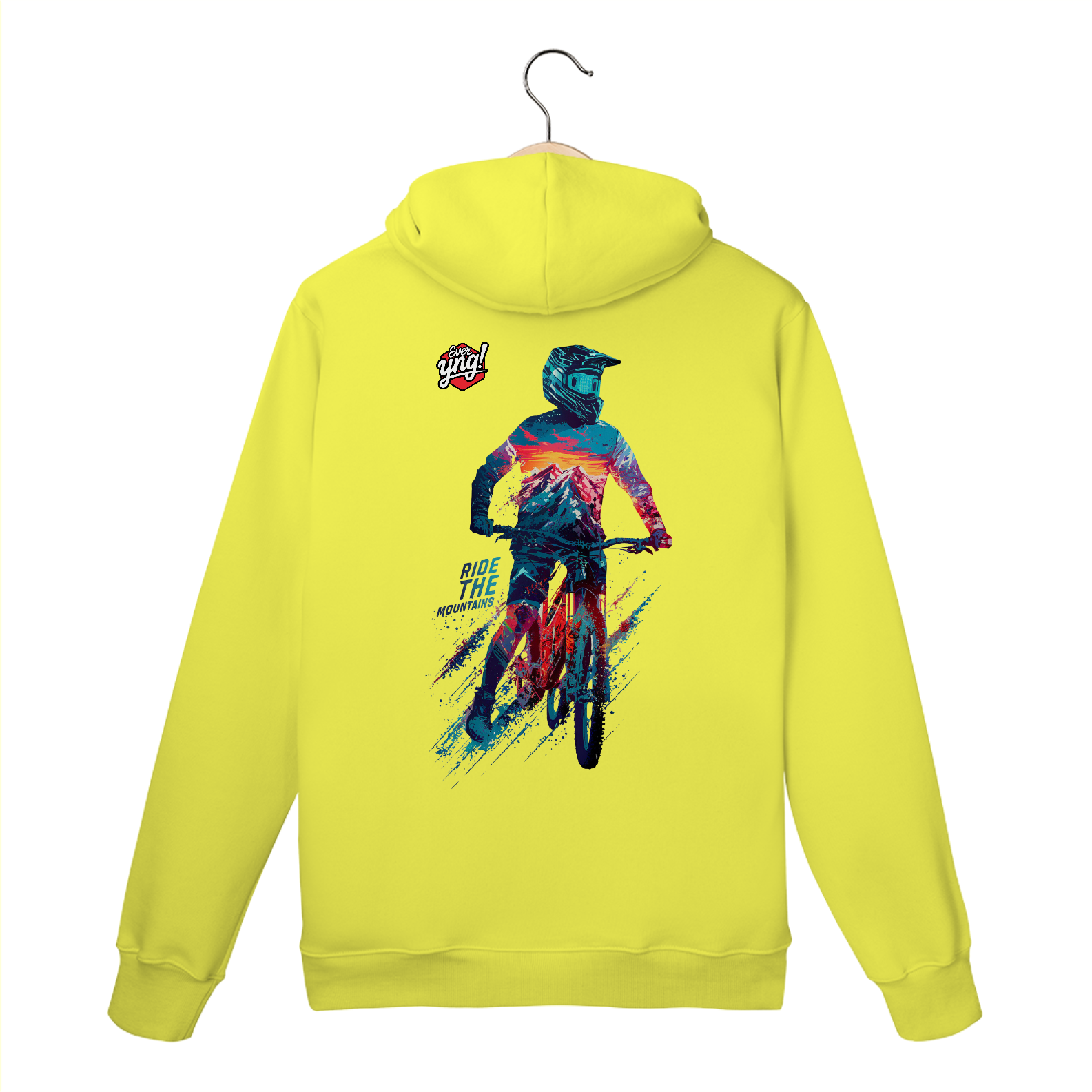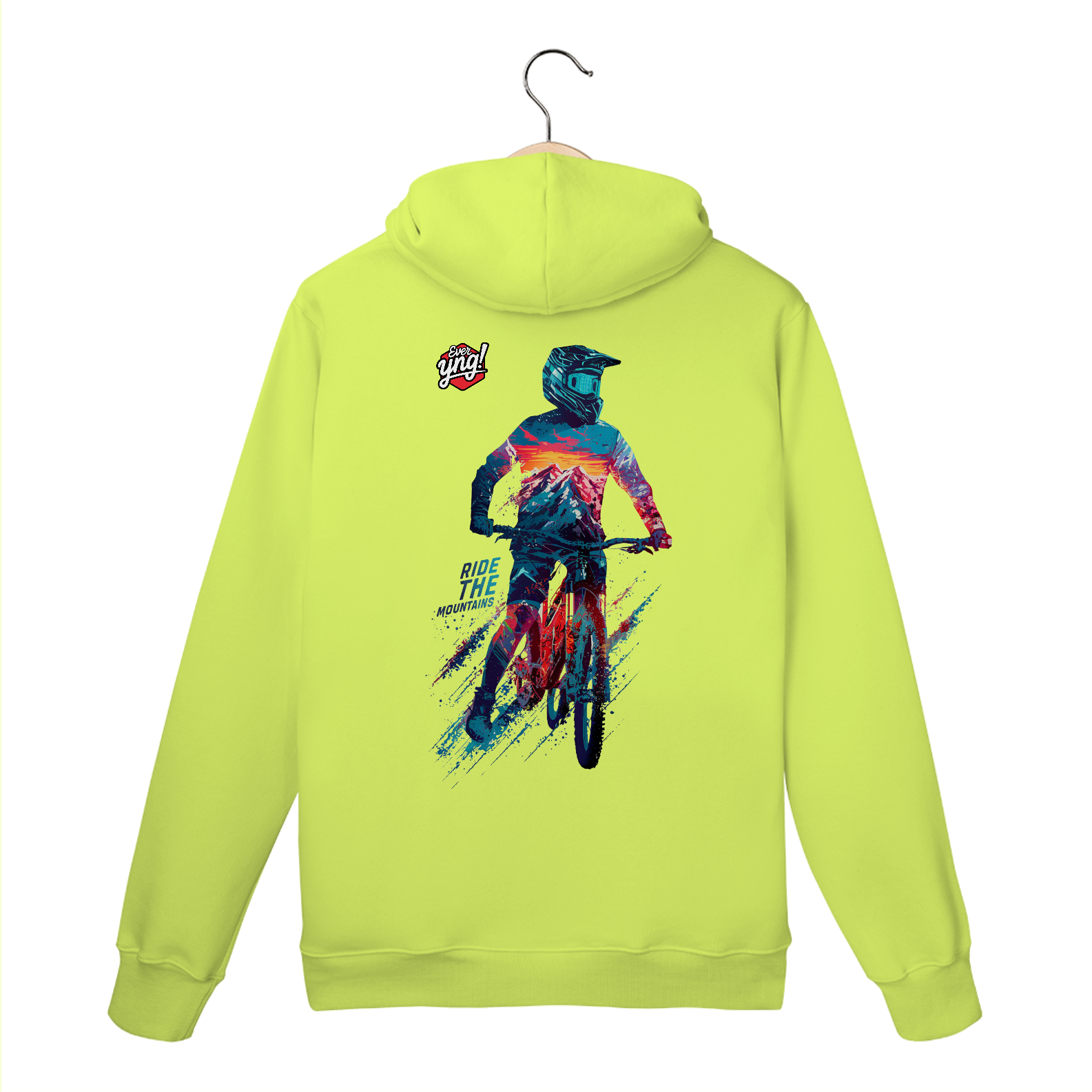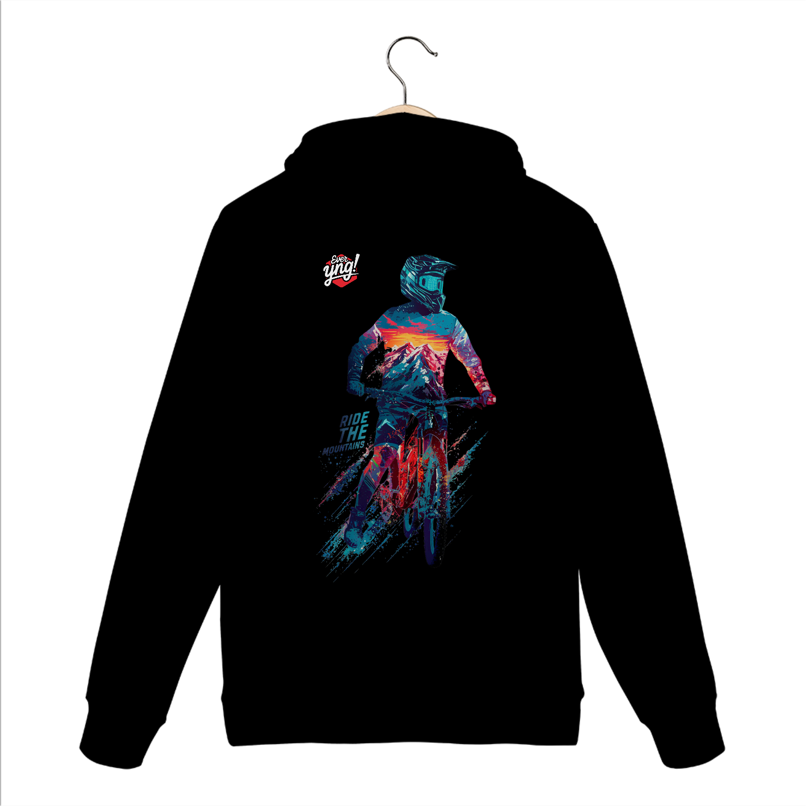 Aventure-se com estilo com a estampa "Ride the Mountains" da ever Yng!. Um ciclista de montanha em uma pose dinâmica, totalmente equipado e vibrante, desbrava as cores intensas do pôr do sol nas montanhas. O fundo, com tons vívidos de azul, vermelho e branco, cria uma atmosfera eletrizante, ideal para quem busca ação e movimento. A frase "RIDE THE MOUNTAINS" na parte inferior intensifica o espírito de liberdade e adrenalina. Esta estampa captura a essência de quem ama viver no limite das aventuras.