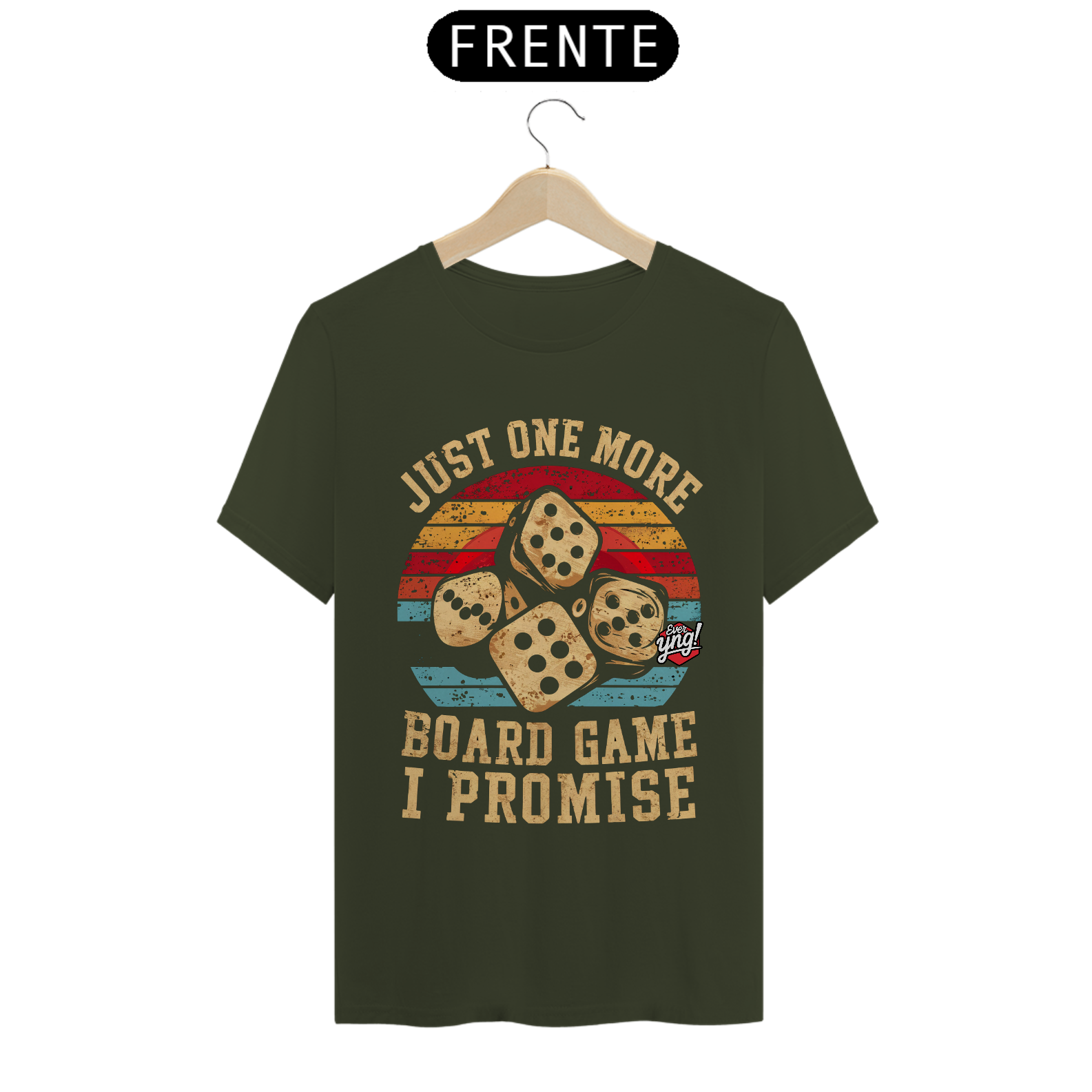 Reviva a nostalgia dos jogos de tabuleiro com este design exclusivo da ever Yng!! Três dados estilizados flutuam contra um nascer ou pôr do sol de cores intensas. O visual vintage dá o tom perfeito de diversão e desafio, com o texto "SÓ MAIS UM" e "JOGO DE TABULEIRO, EU PROMETO" transmitindo aquela sensação familiar de "só mais uma rodada". As cores vibrantes de fundo escuro com tons de vermelho, laranja e azul criam uma atmosfera retrô perfeita para quem ama uma boa jogatina.