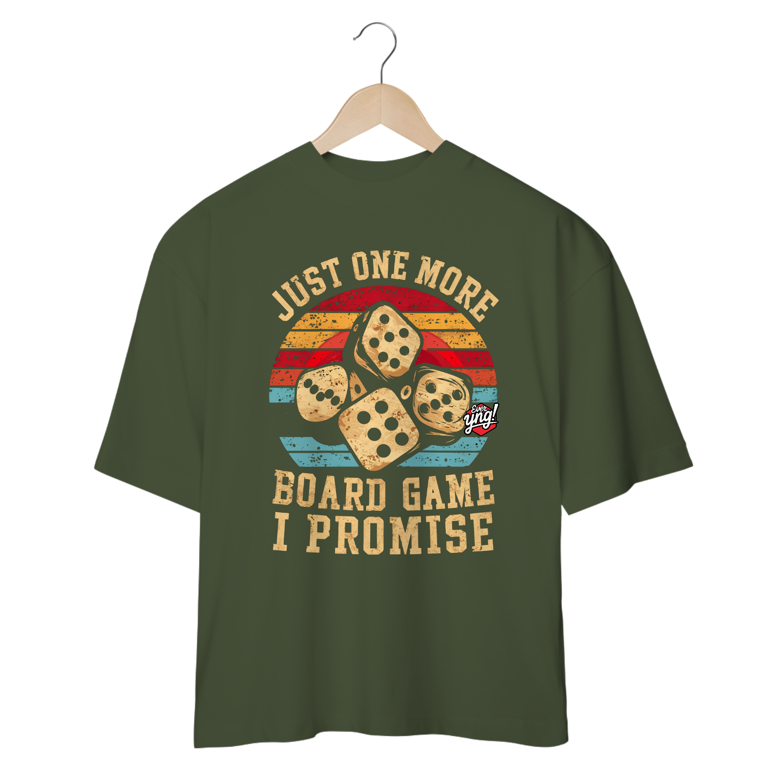 Reviva a nostalgia dos jogos de tabuleiro com este design exclusivo da ever Yng!! Três dados estilizados flutuam contra um nascer ou pôr do sol de cores intensas. O visual vintage dá o tom perfeito de diversão e desafio, com o texto "SÓ MAIS UM" e "JOGO DE TABULEIRO, EU PROMETO" transmitindo aquela sensação familiar de "só mais uma rodada". As cores vibrantes de fundo escuro com tons de vermelho, laranja e azul criam uma atmosfera retrô perfeita para quem ama uma boa jogatina.