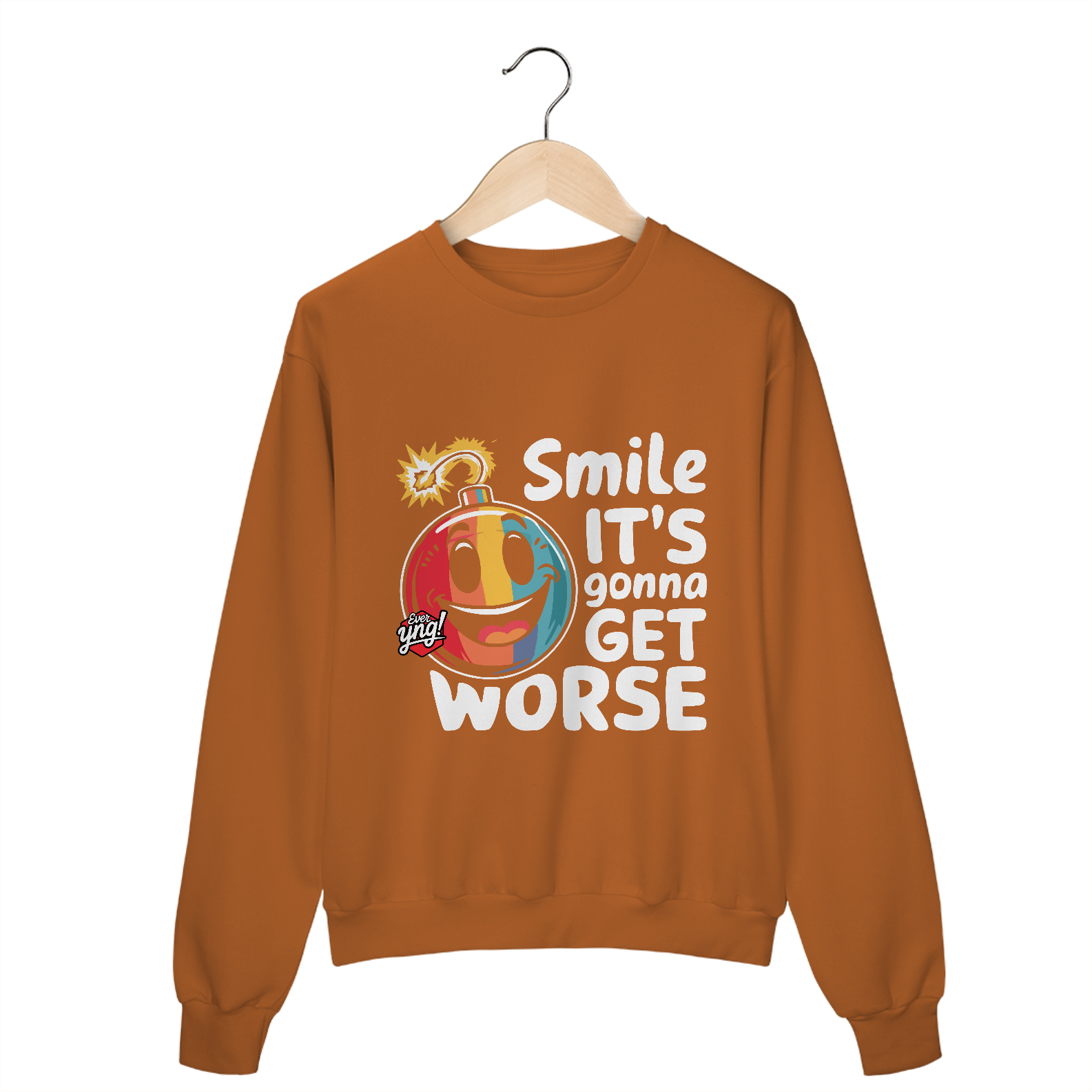 Explosiva e irreverente, a ever Yng! apresenta este personagem bomba colorido e vibrante, com o pavio prestes a detonar! As cores do arco-íris trazem uma energia inclusiva, e o fundo escuro realça o contraste, tornando a estampa ainda mais impactante. O texto "Sorria, vai piorar" completa o toque sarcástico e divertido. Para quem gosta de expressar seu estilo com humor e atitude, essa é a peça perfeita!