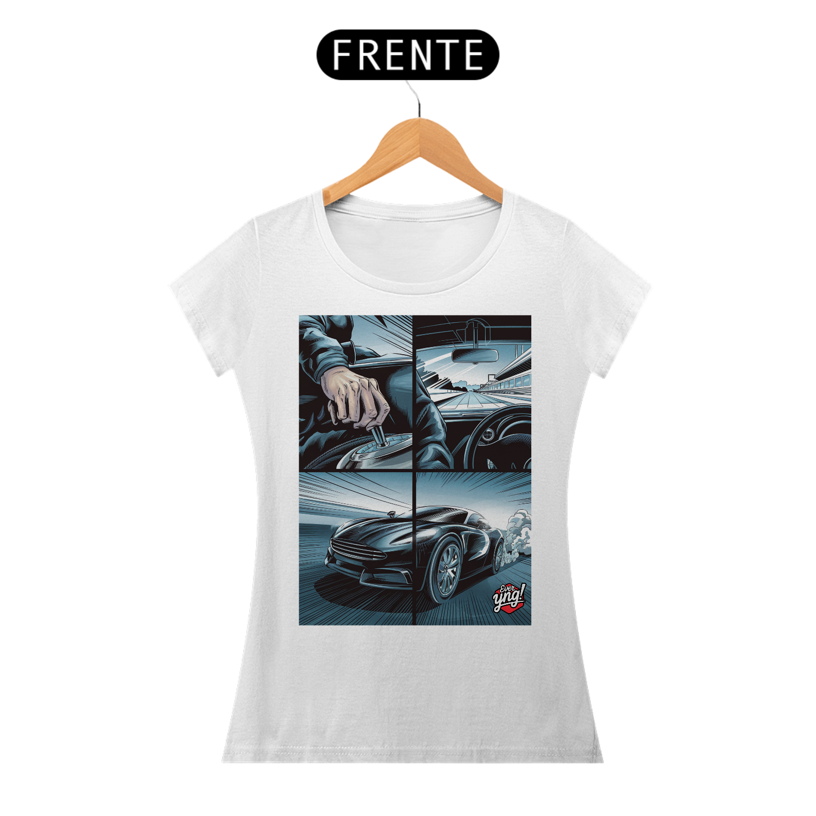 Para os amantes da adrenalina e da sensação de liberdade ao volante, a camisa *ever Yng!* "Velocidade em 4 Painéis" captura o dinamismo das estradas com um toque de quadrinhos. A estampa dividida em quatro partes retrata cada detalhe de uma viagem emocionante: desde a visão do volante até a estrada aberta e o carro em plena aceleração. Com linhas que sugerem movimento e velocidade, essa peça é perfeita para quem vive a vida no limite.