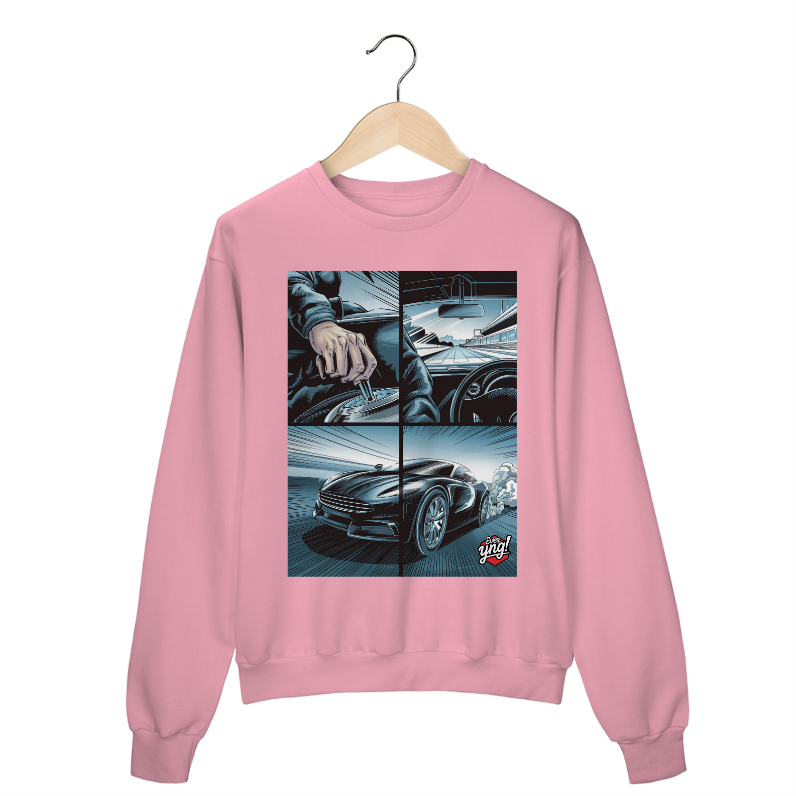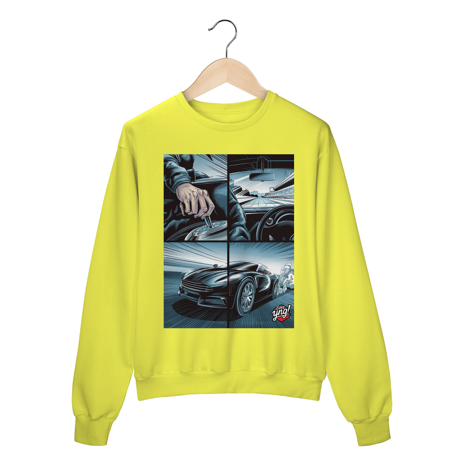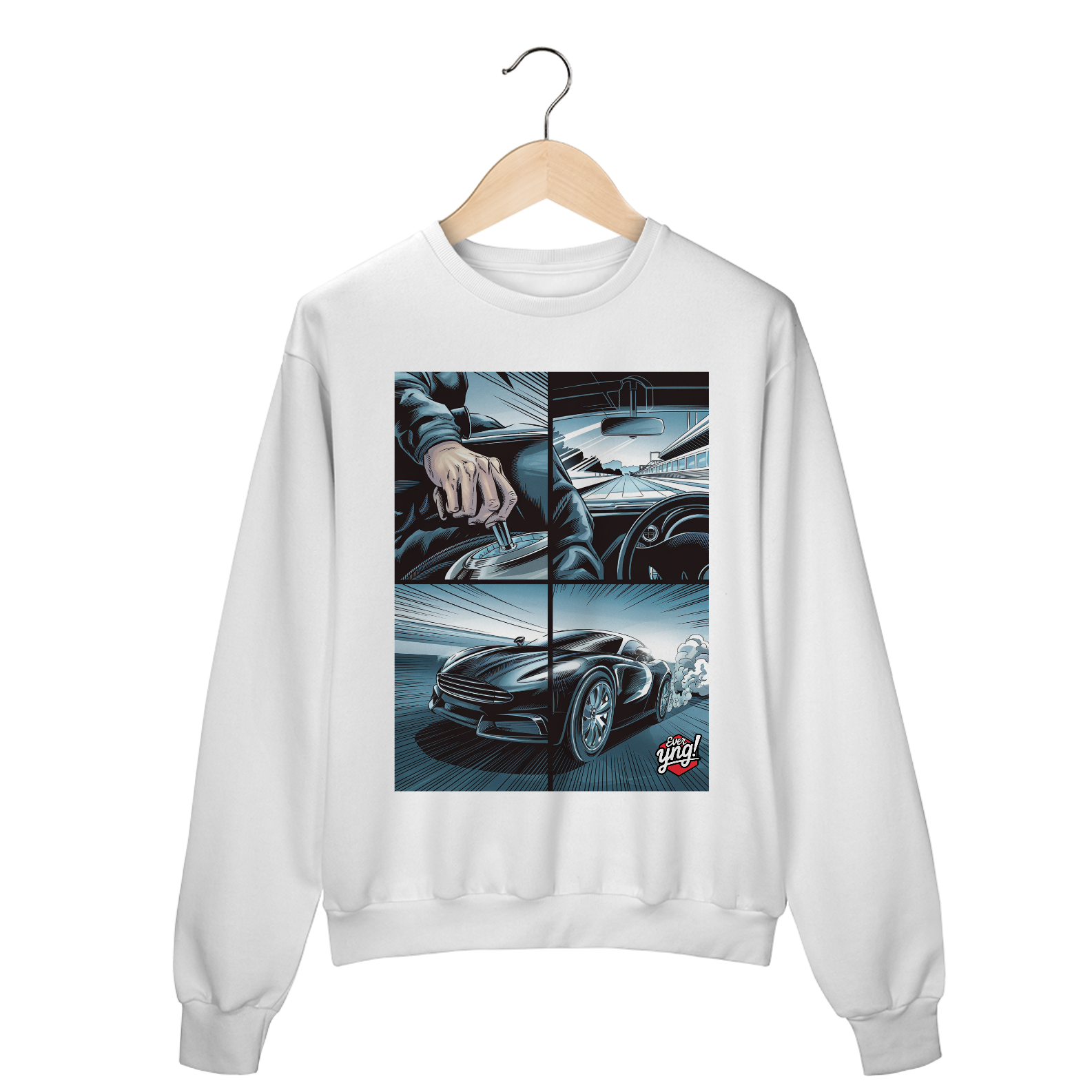 Para os amantes da adrenalina e da sensação de liberdade ao volante, o moletom *ever Yng!* "Velocidade em 4 Painéis" captura o dinamismo das estradas com um toque de quadrinhos. A estampa dividida em quatro partes retrata cada detalhe de uma viagem emocionante: desde a visão do volante até a estrada aberta e o carro em plena aceleração. Com linhas que sugerem movimento e velocidade, essa peça é perfeita para quem vive a vida no limite.
