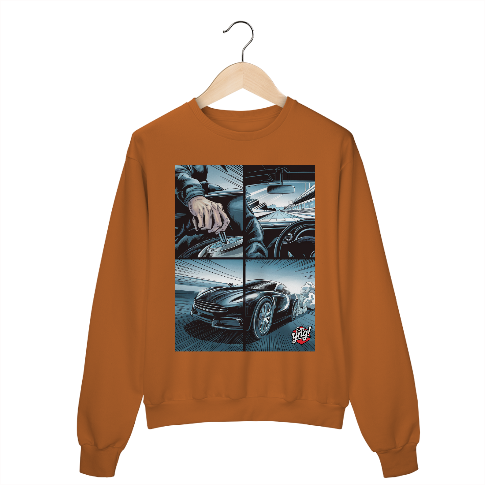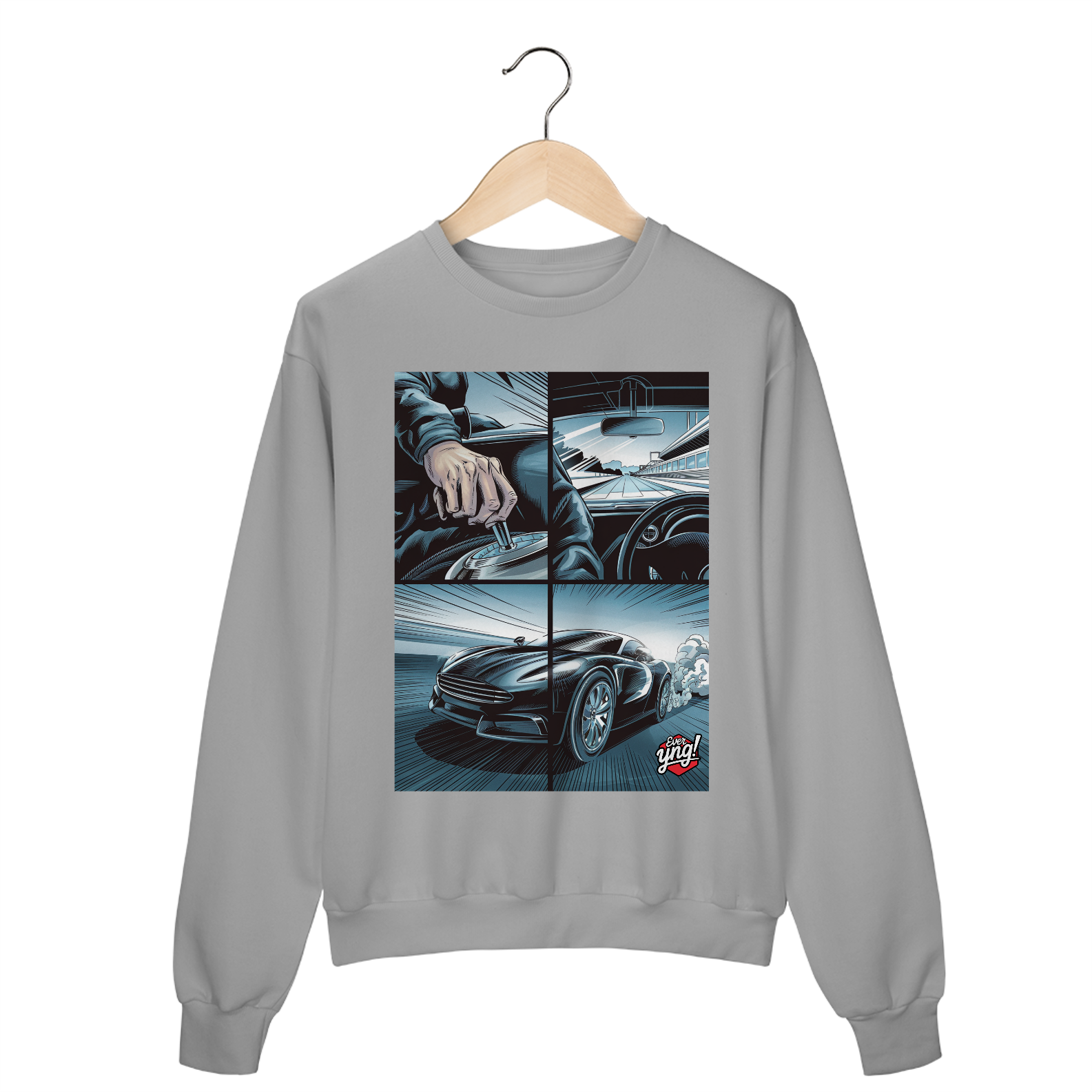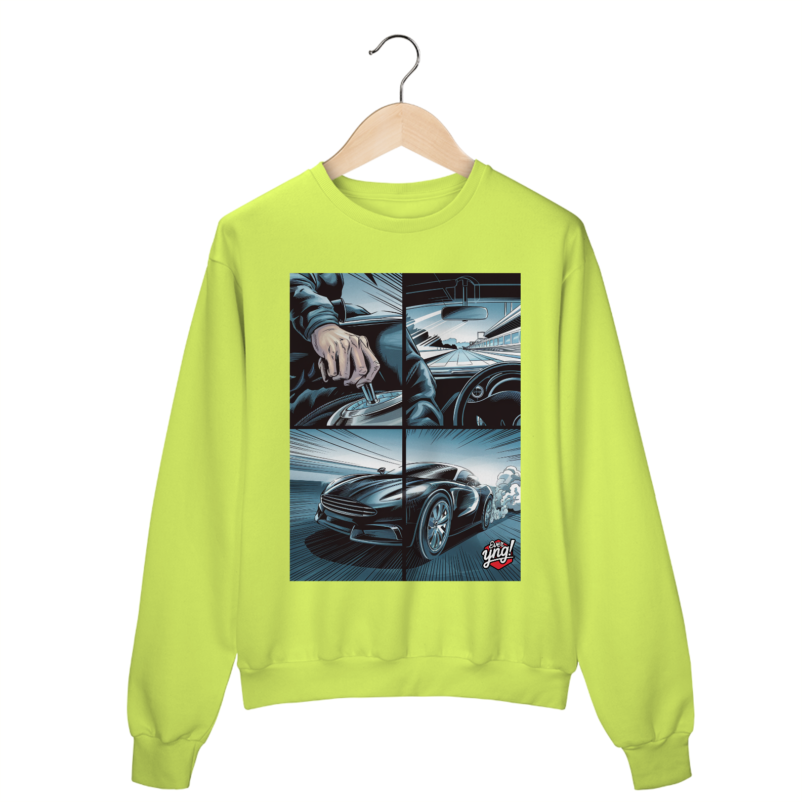 Para os amantes da adrenalina e da sensação de liberdade ao volante, o moletom *ever Yng!* "Velocidade em 4 Painéis" captura o dinamismo das estradas com um toque de quadrinhos. A estampa dividida em quatro partes retrata cada detalhe de uma viagem emocionante: desde a visão do volante até a estrada aberta e o carro em plena aceleração. Com linhas que sugerem movimento e velocidade, essa peça é perfeita para quem vive a vida no limite.