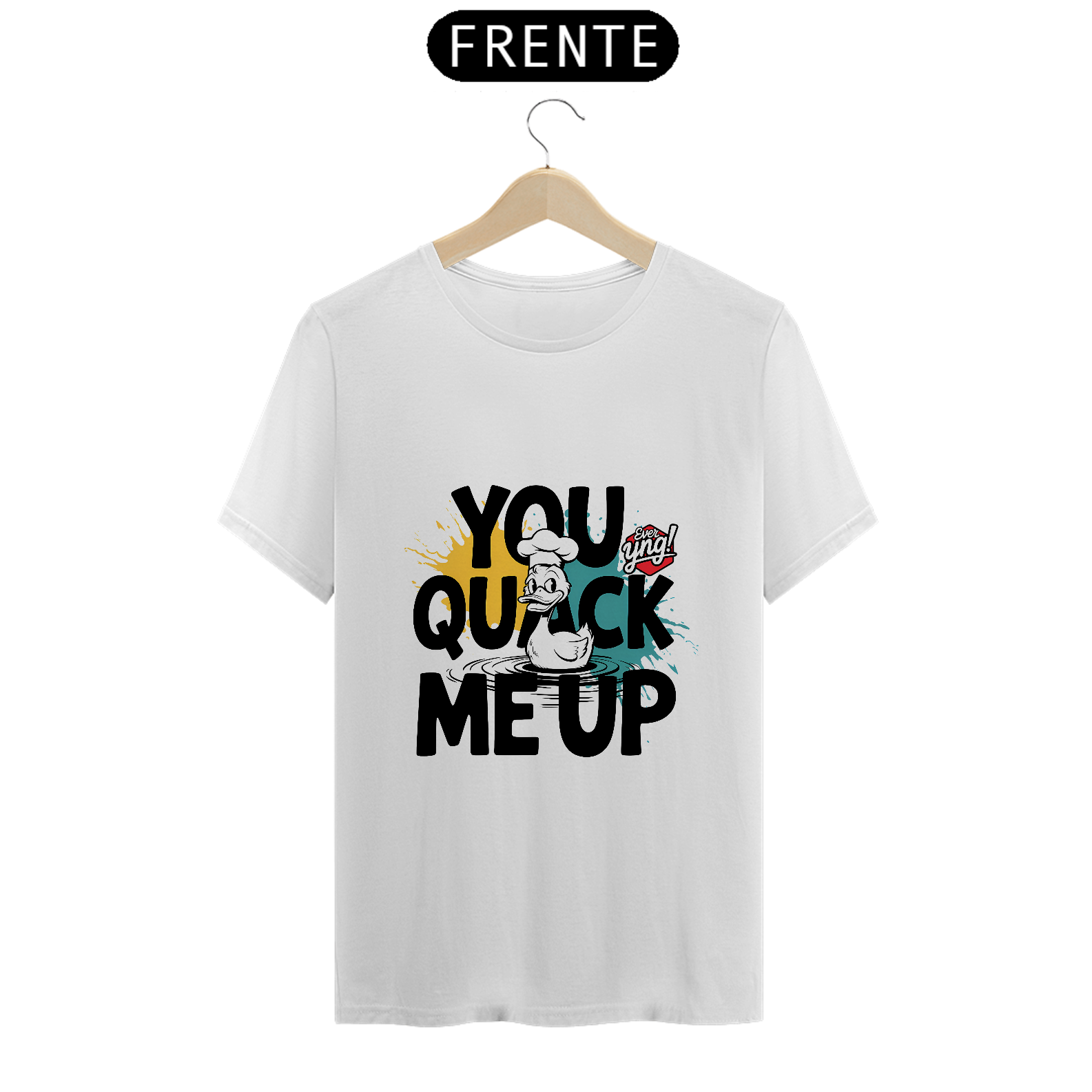 Um pato chef? Sim, por favor! Com um chapéu de chef e cercado por ondulações de água, este pato bem-humorado ganha vida com o texto "YOU QUACK ME UP". Um design divertido e lúdico, perfeito para quem adora exibir o bom humor com estilo. A Ever Yng! traz essa estampa cheia de charme, que mistura qualidade e jovialidade para mostrar que envelhecer é uma escolha!