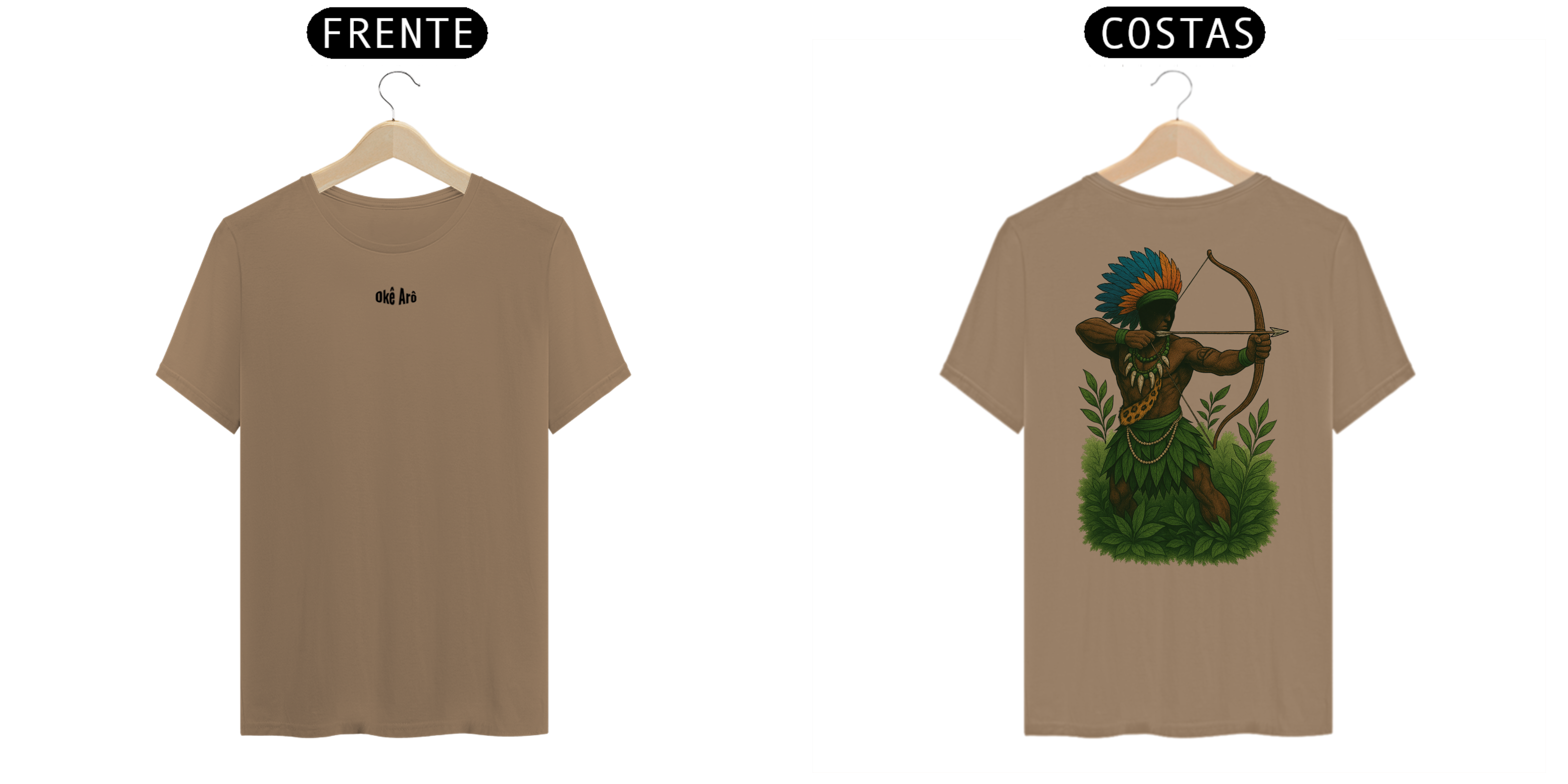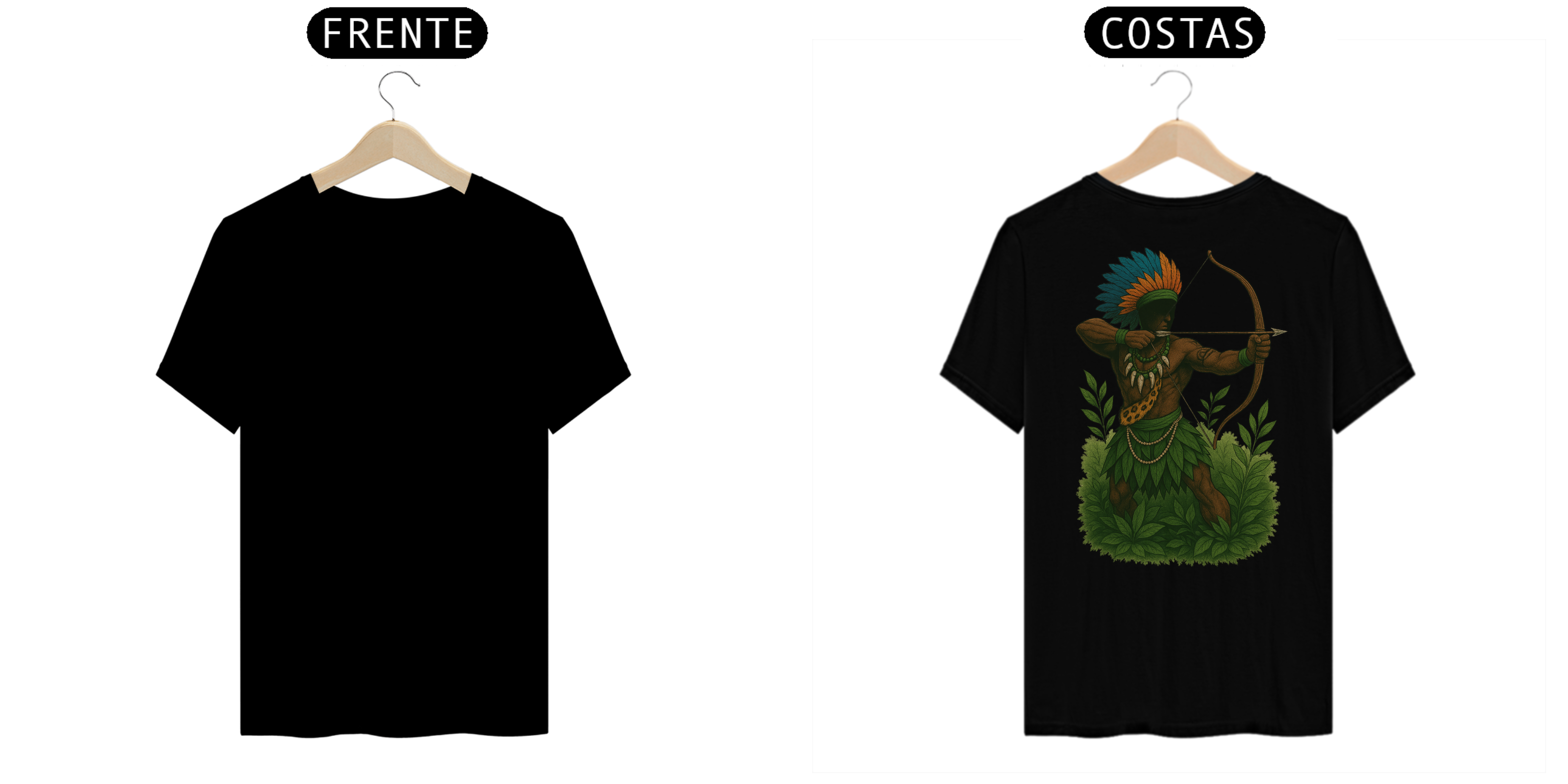 Estampa Costas: Arte detalhada de Oxóssi em postura de caça, trajando seu cocar vibrante, adornos tradicionais e elementos que remetem à conexão com a natureza. A composição traz força e mistério, transmitindo o espírito do caçador em harmonia com a floresta.