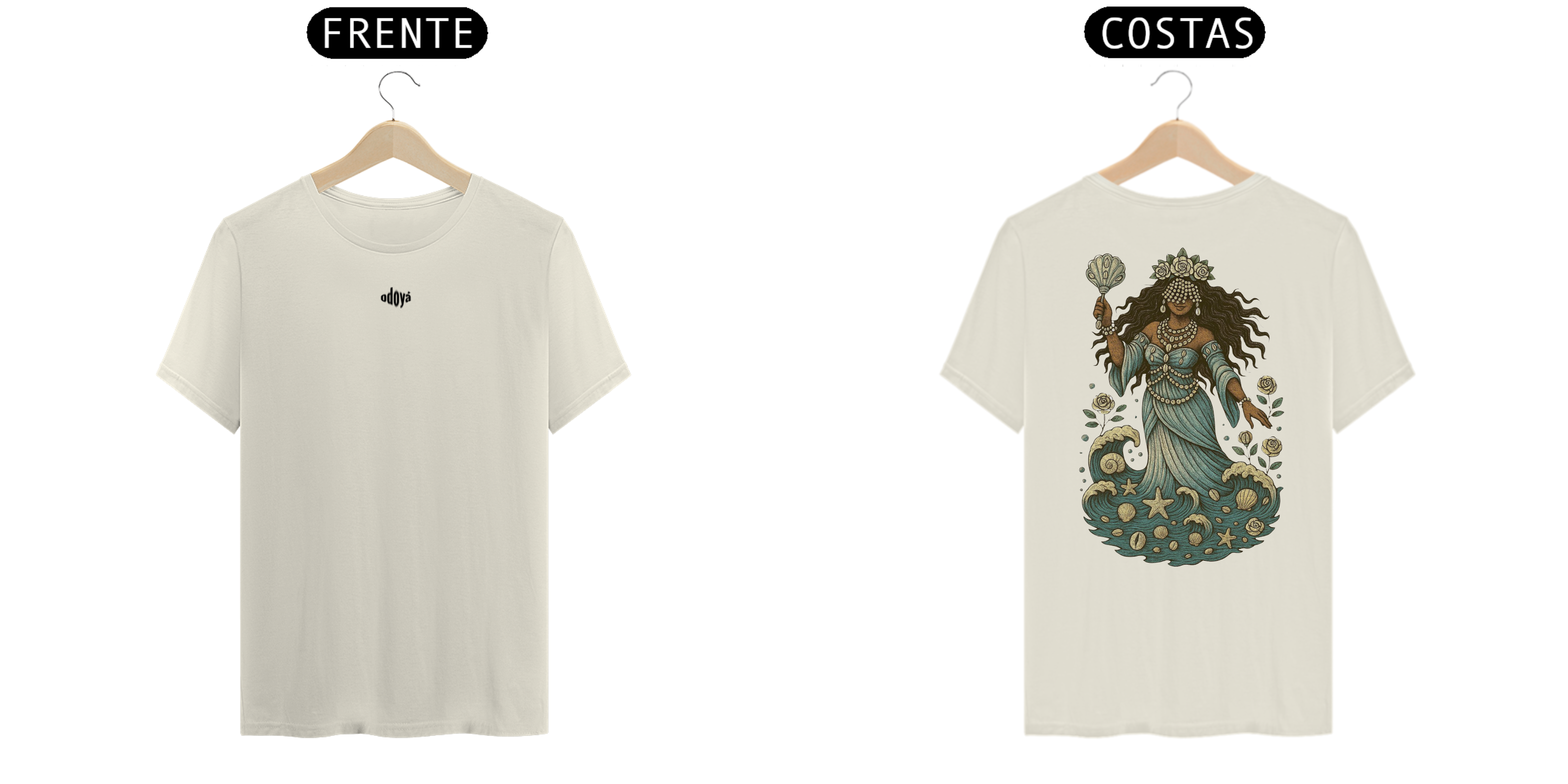 Estampa Frente: A saudação “Odoyá” é estampada com leveza e reverência, como um chamado de bênçãos que ecoa pelas ondas do mar.