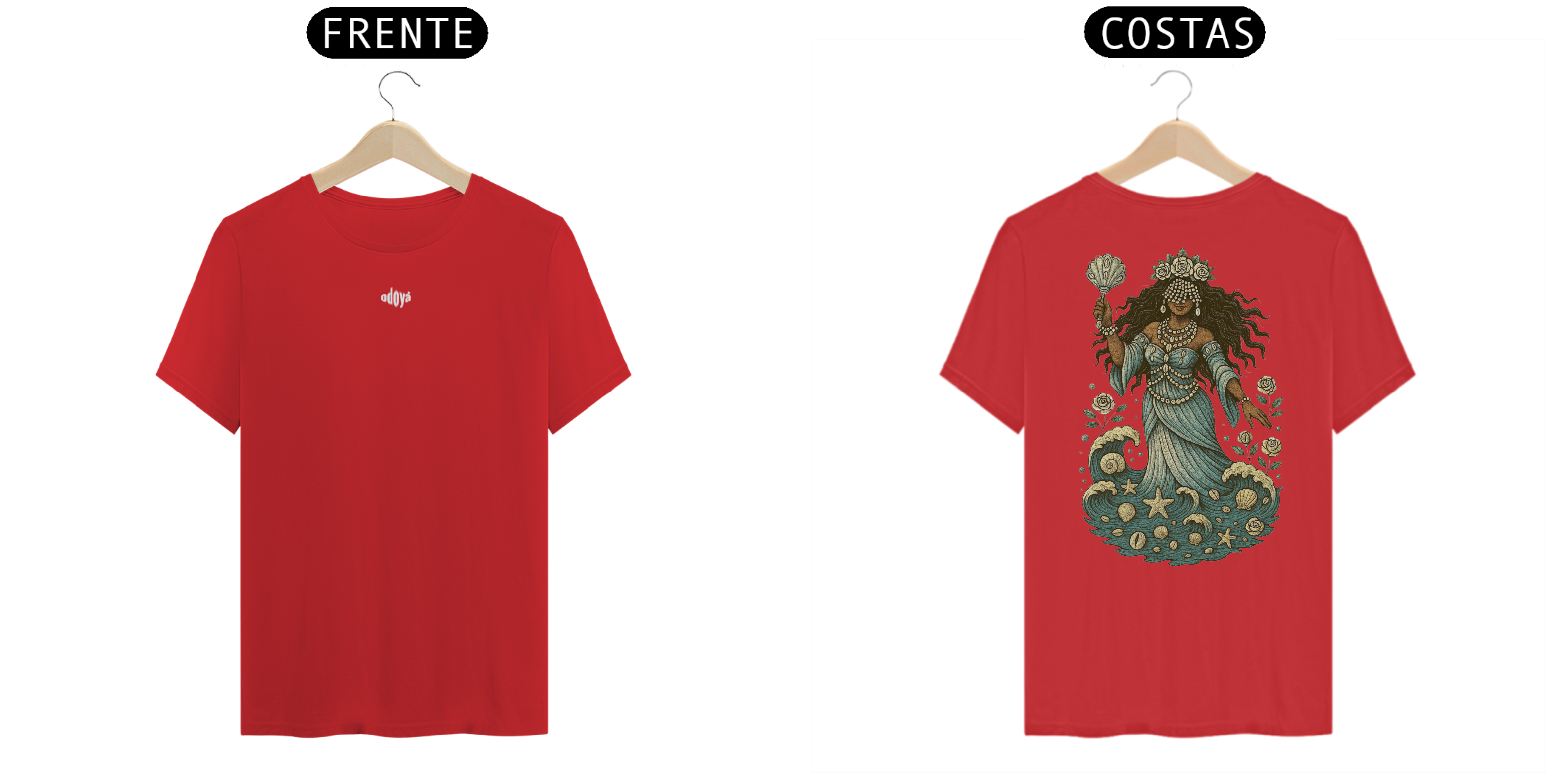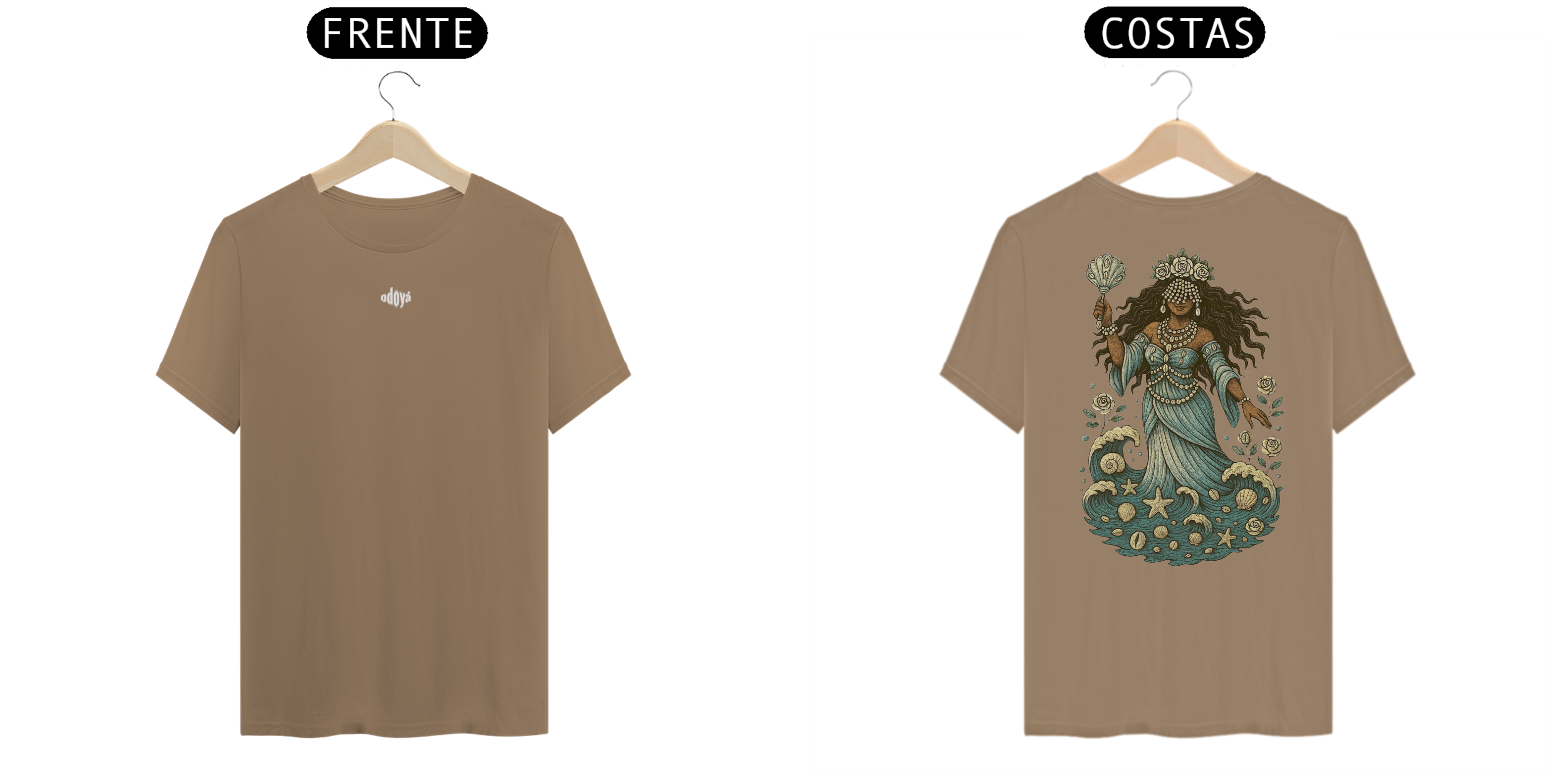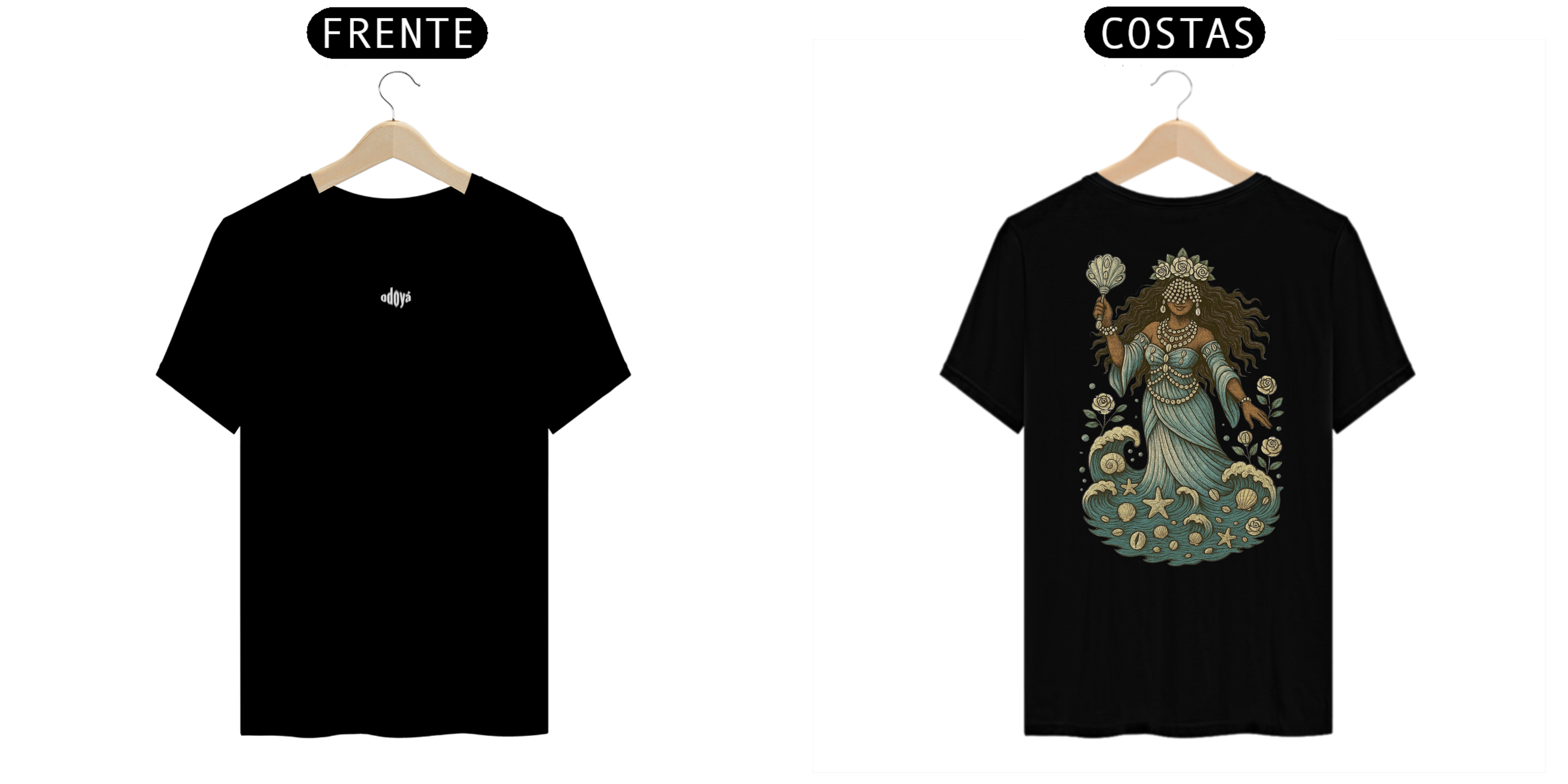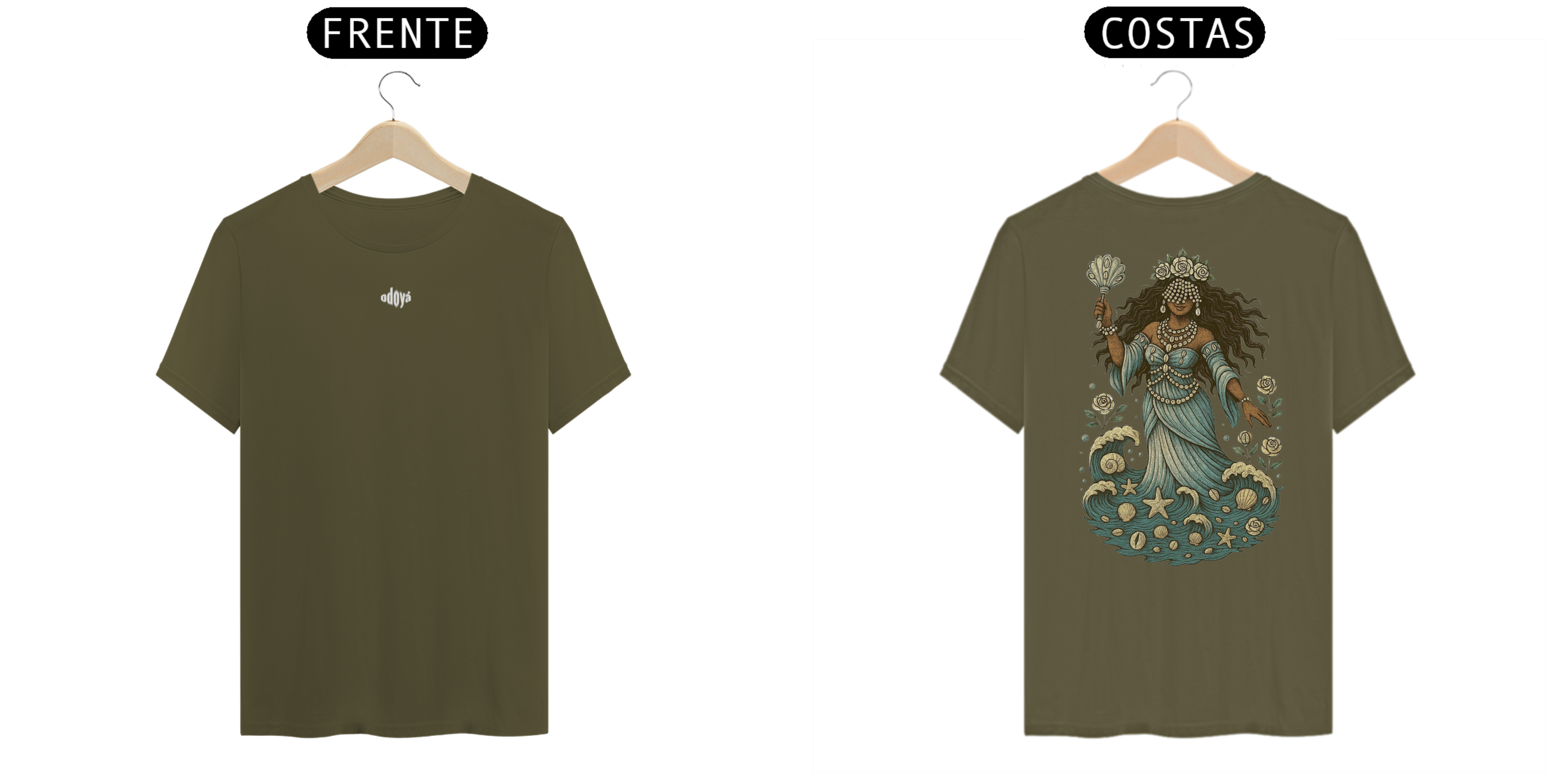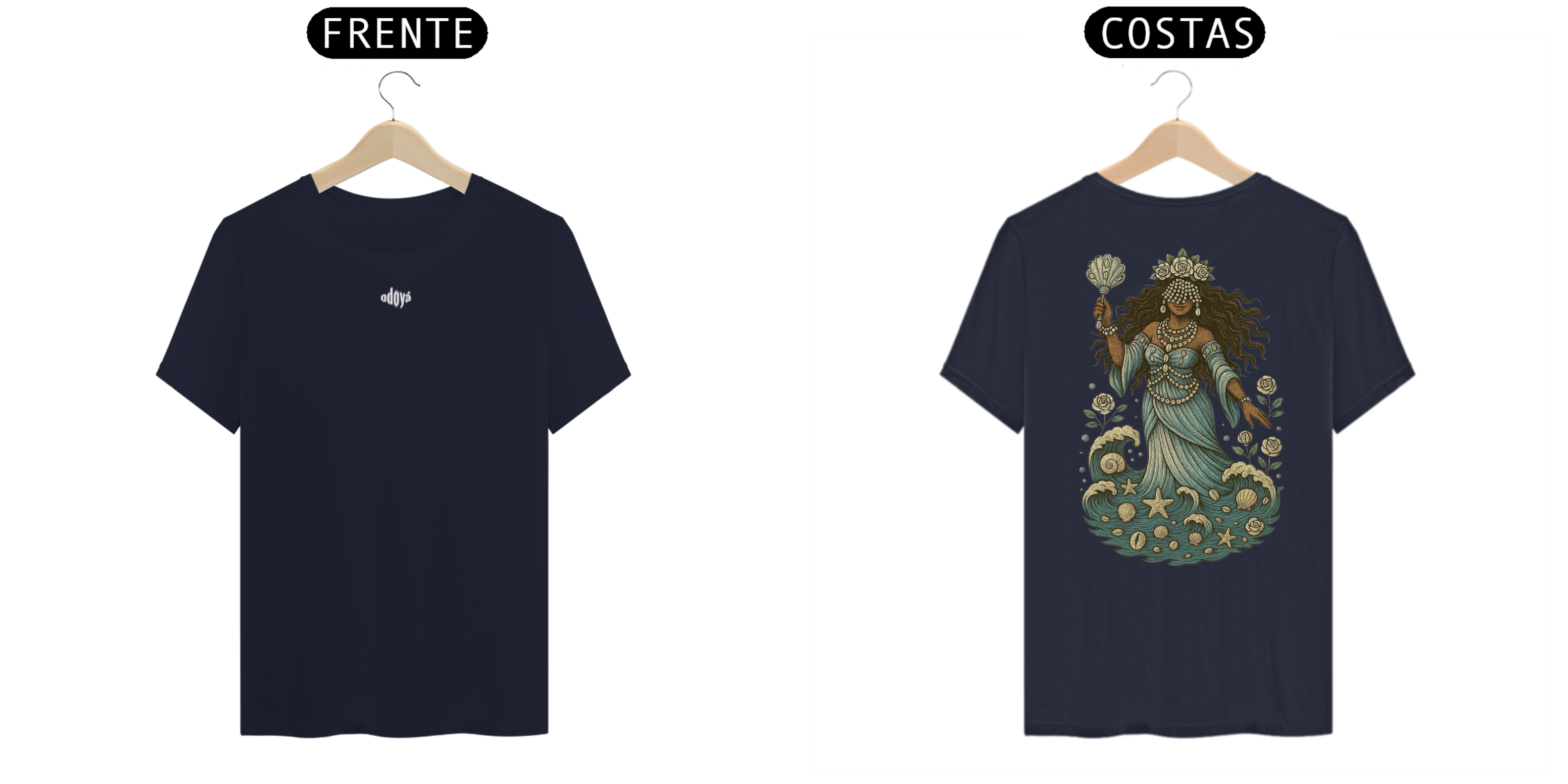 Estampa Frente: A saudação “Odoyá” é estampada com leveza e reverência, como um chamado de bênçãos que ecoa pelas ondas do mar.
