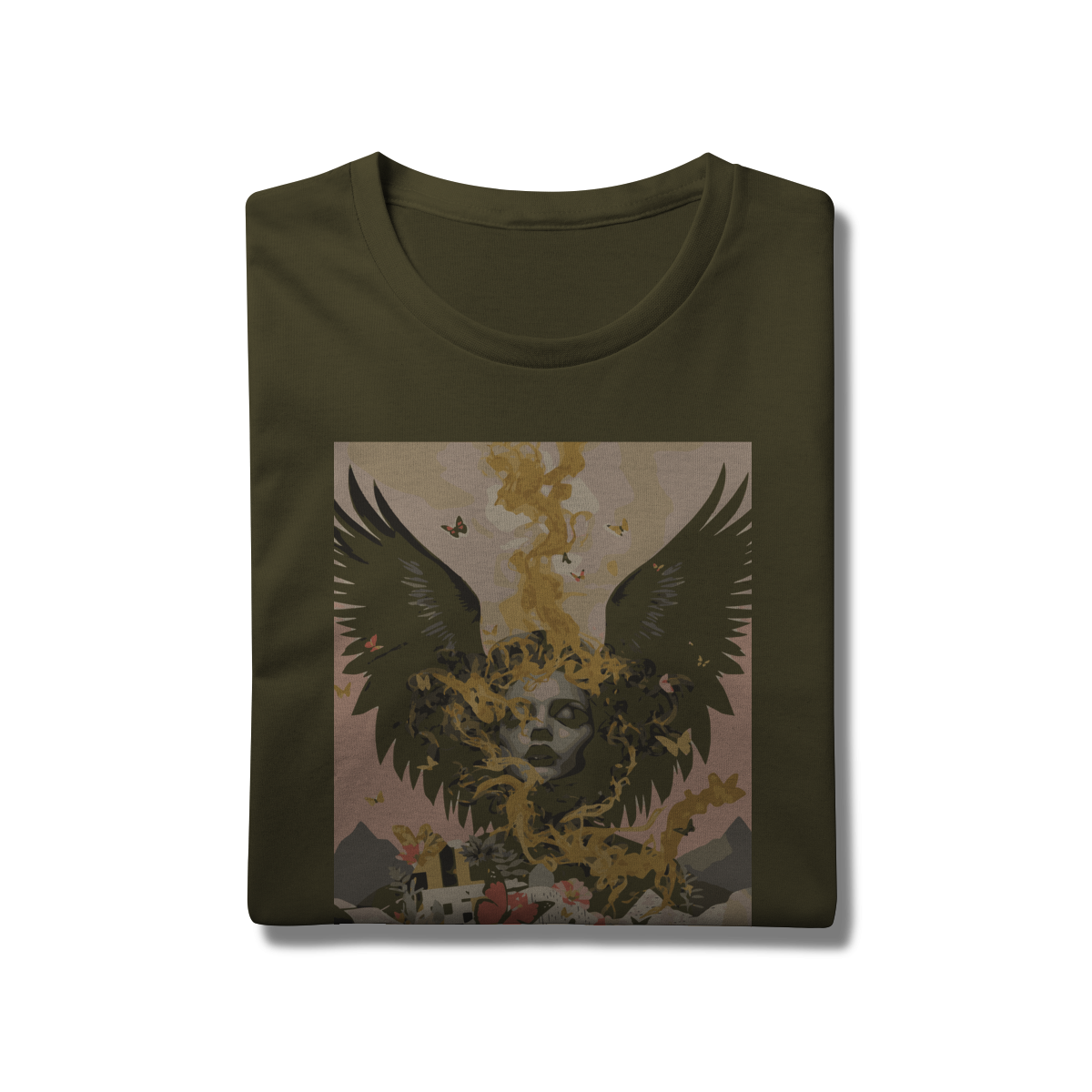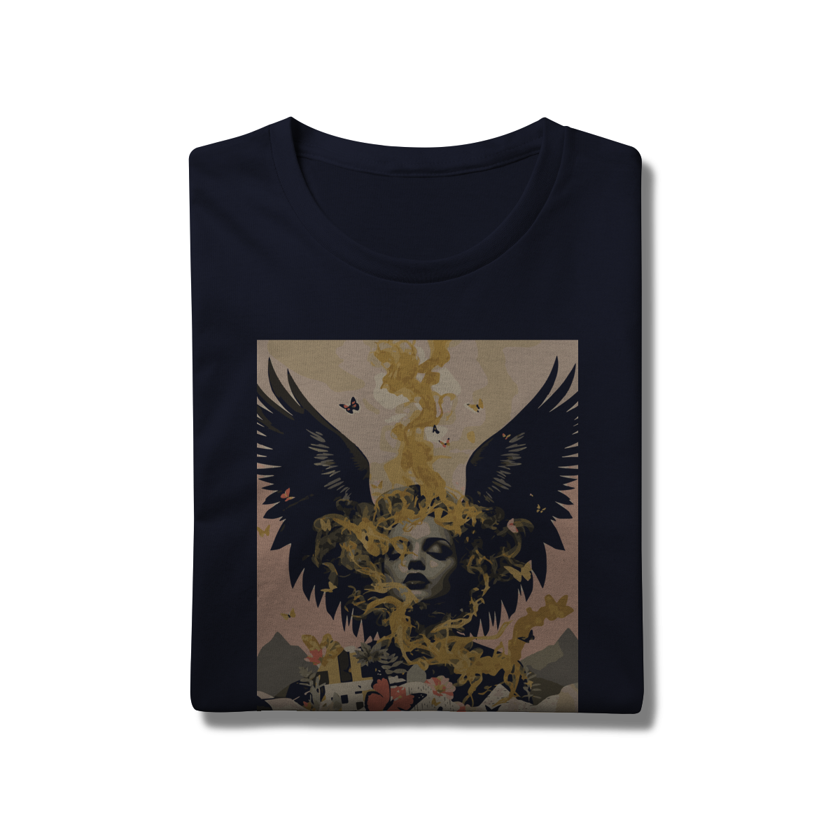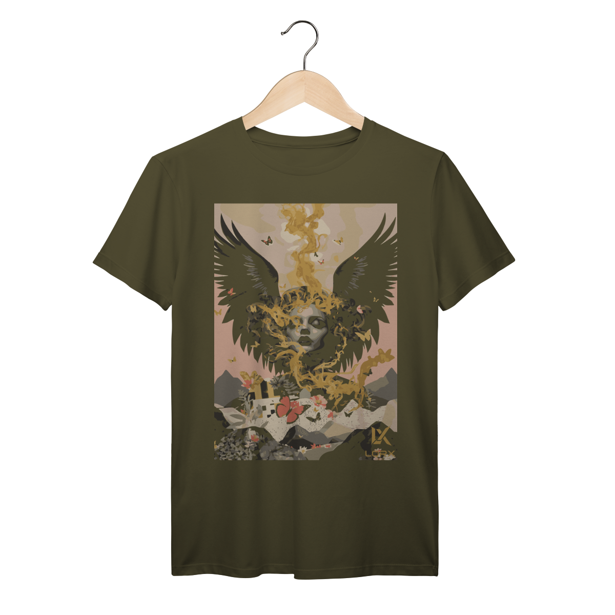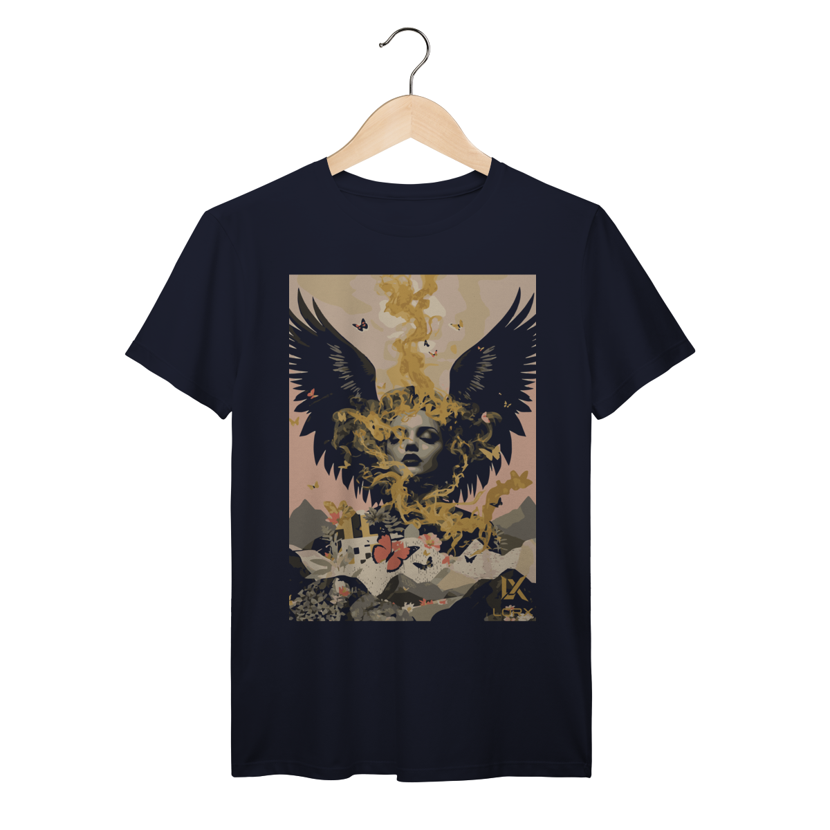 "Alma Alada – LORX Ethereal Bloom" é uma estampa que transcende o visual comum e mergulha em uma narrativa surrealista de introspecção, beleza e força simbólica. No centro da composição, uma figura feminina de olhos fechados emerge entre fumaça dourada e asas negras, evocando um estado de contemplação e poder interior. Borboletas coloridas flutuam ao redor, enquanto uma paisagem de montanhas, flores e construções se desenha abaixo — conectando o espiritual ao terreno, o sonho à realidade.