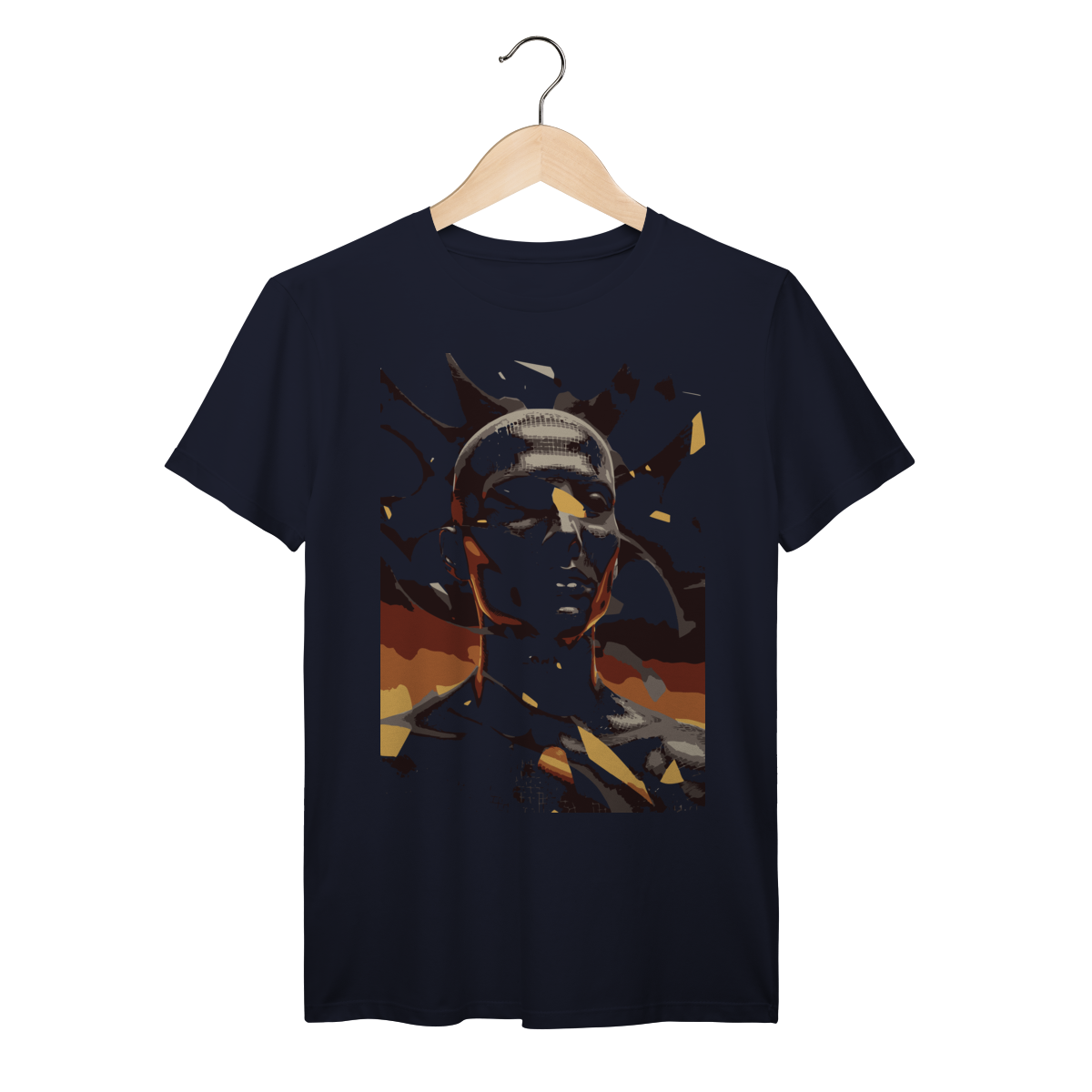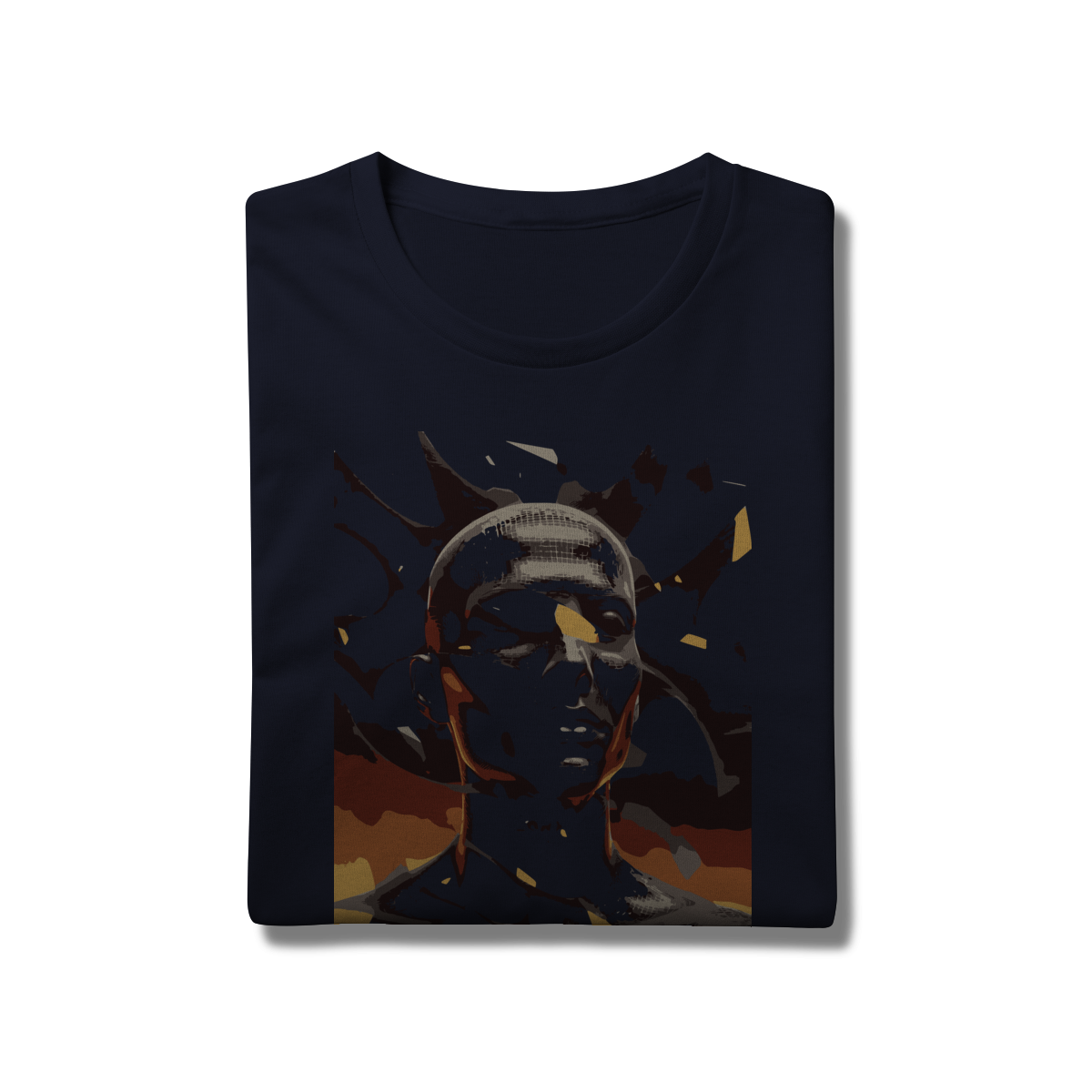 A estampa "Android Fragmentado: Luz e Ruptura" é uma obra de arte digital que mergulha no universo da tecnologia e da identidade pós-humana. Com uma figura humanoide de superfície reflexiva e padrão geométrico na cabeça, essa composição evoca a fusão entre o orgânico e o artificial. Fragmentos em tons vibrantes de laranja e amarelo explodem ao redor do personagem, contrastando com o fundo escuro e angular que sugere movimento, energia e colapso.