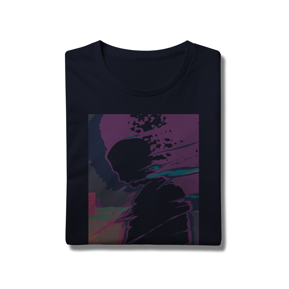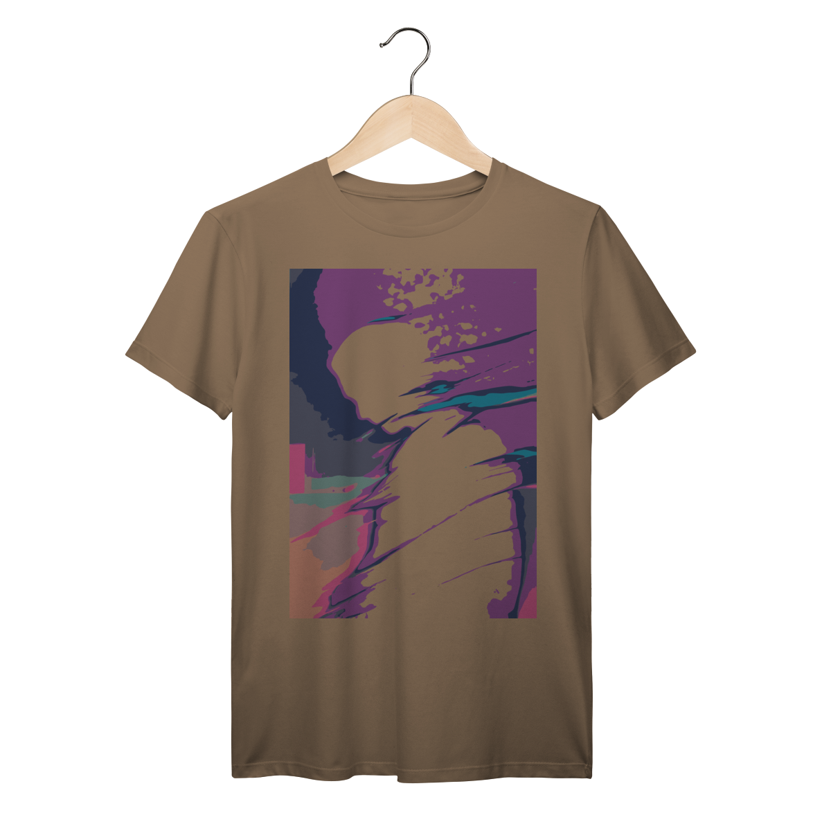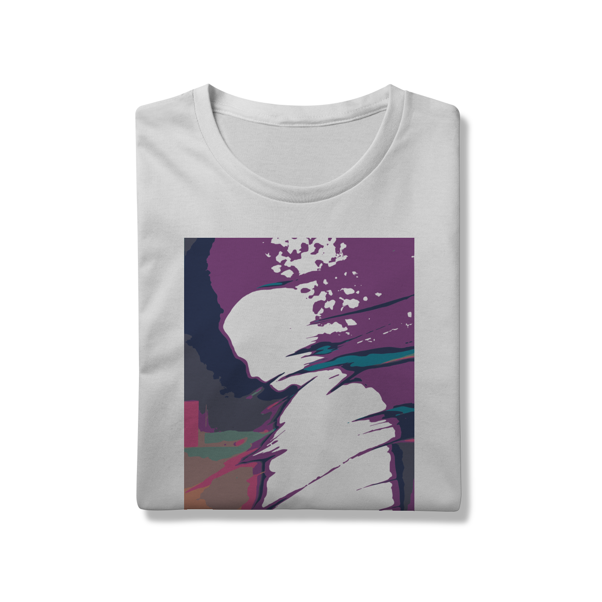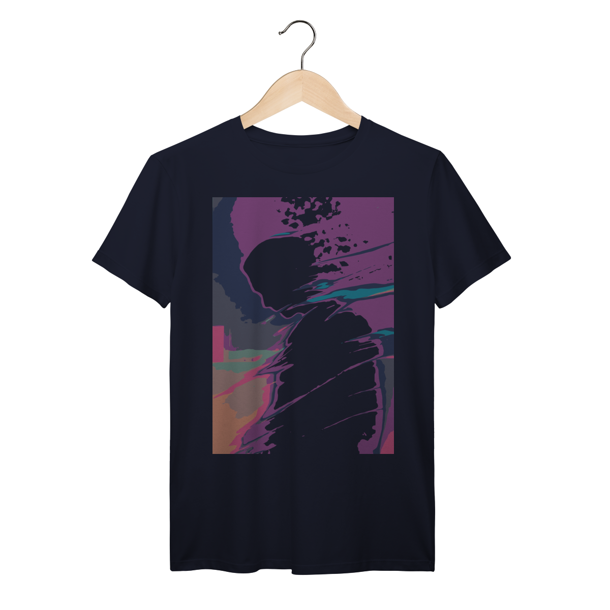 A estampa "Desintegração Luminosa: Perfil em Transição" é uma explosão de cor e emoção que captura o instante em que identidade e energia se fundem. Com uma silhueta humana em perfil, envolta por faixas vibrantes de roxo, azul, laranja e rosa, essa arte transmite a sensação de movimento, fragmentação e metamorfose. As formas granuladas e os gradientes intensos criam uma atmosfera dinâmica e introspectiva, como se o pensamento estivesse se dissolvendo em luz.
