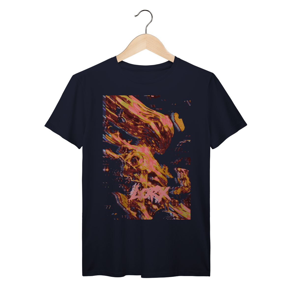 A estampa "LORX em Chamas: Crânio em Chamas" é uma explosão visual que mistura surrealismo, intensidade emocional e estética digital. No centro da composição, um crânio estilizado emerge em meio a formas flamejantes e fragmentadas, com tons vibrantes de laranja, rosa, amarelo e azul contrastando com o fundo preto profundo. A palavra LORX, escrita em pinceladas ousadas de rosa, reforça o caráter provocativo e urbano da arte.