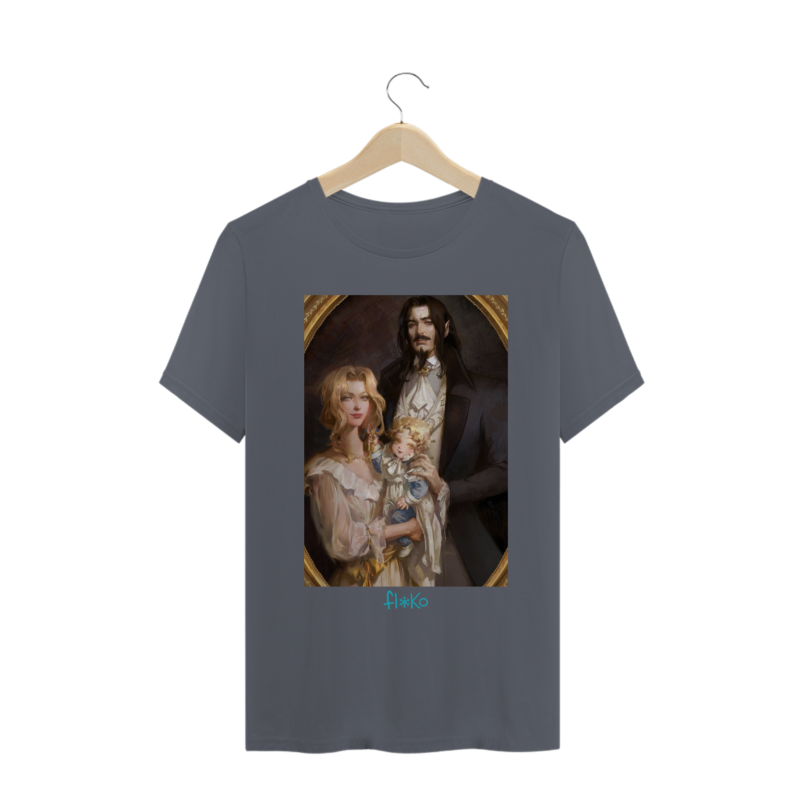 Uma tragédia pode ter o seu início com uma linda e incomum família, como é o caso de Drácula, sua esposa Lisa e seu filho Alucard. A história de Castlevania cresceu através de vários jogos pelas últimas décadas, ganhando até uma super animação desenvolvida pela Netflix, que é de onde o quadro estampado nessa camisa foi retirado.