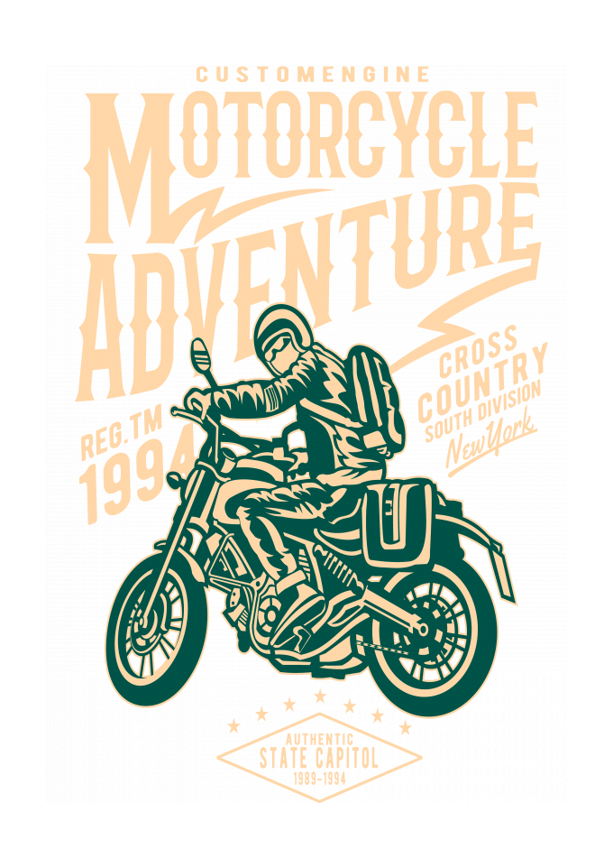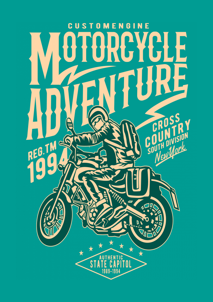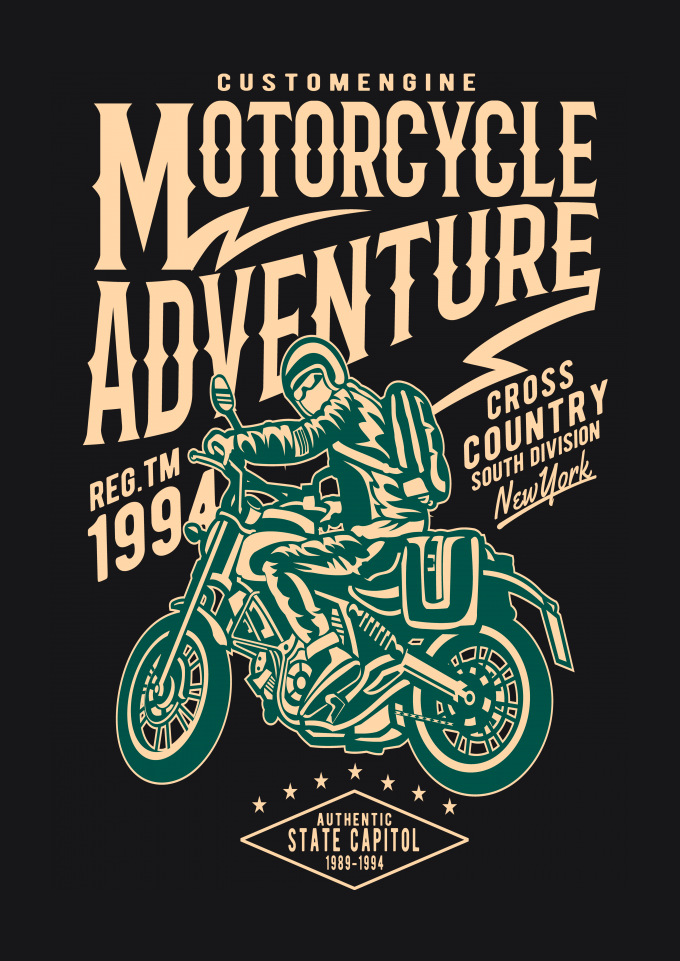 O tema da estampa é motociclista aventureiro.