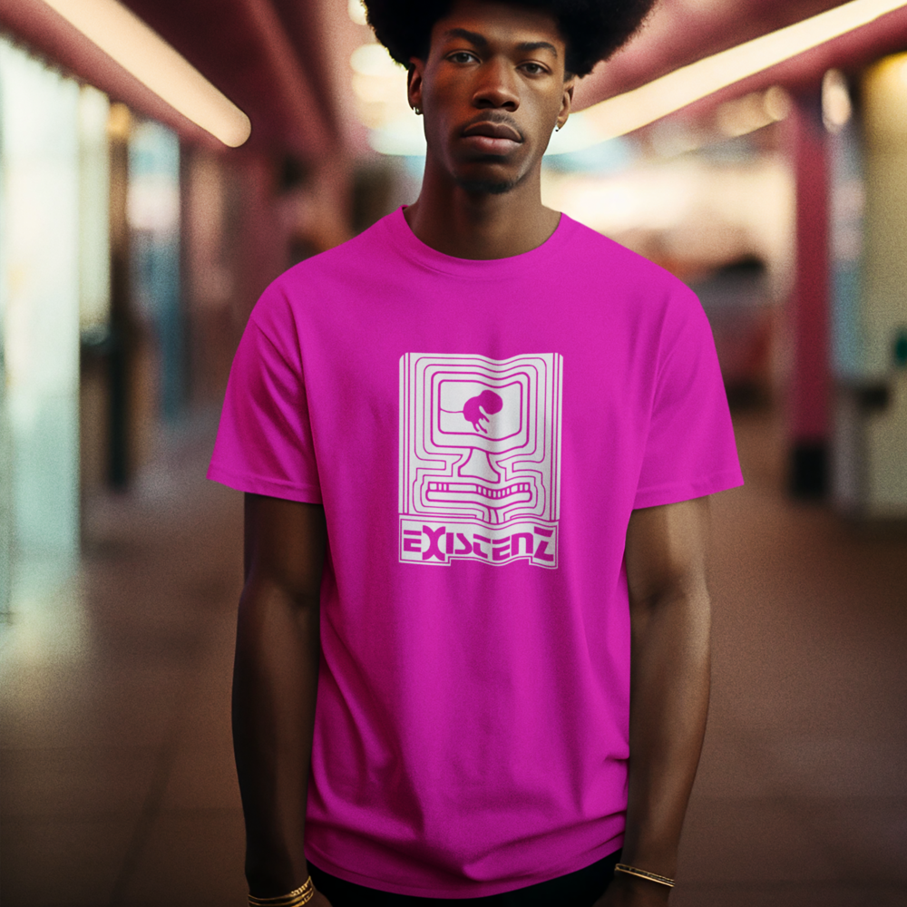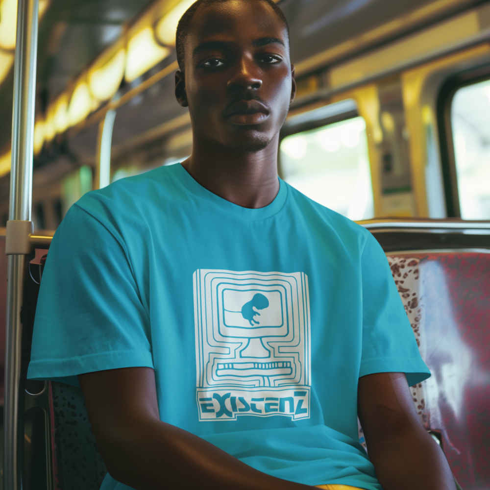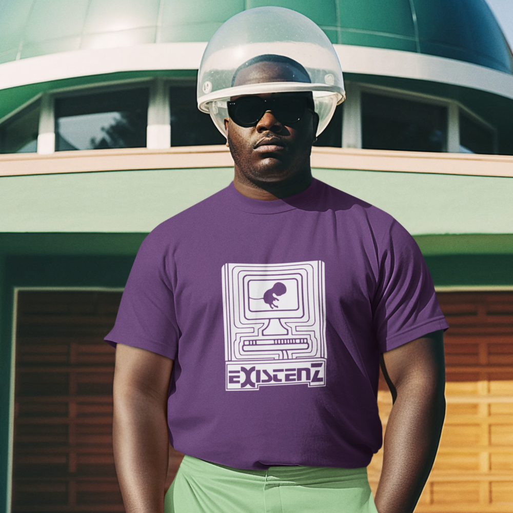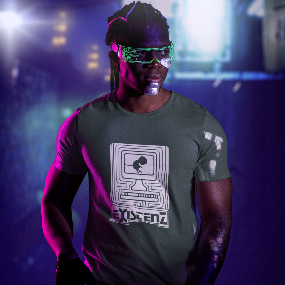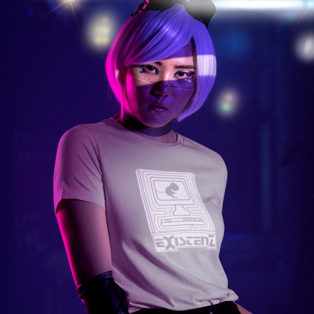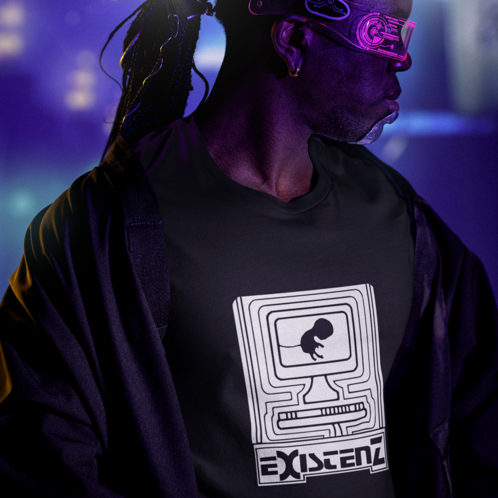 Um feto, conectado ao mundo digital por seu cordão umbilical, nos convida a questionar os limites entre a vida real e a realidade virtual. Inspirada no filme cult Existenz (1999), de David Cronenberg, esta camiseta estampa questões existenciais sobre a natureza da realidade, a fluidez da identidade e o controle da mente em um futuro distópico.