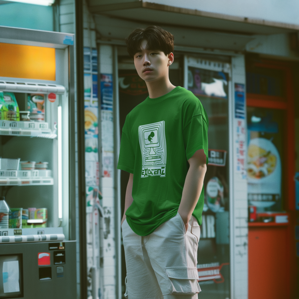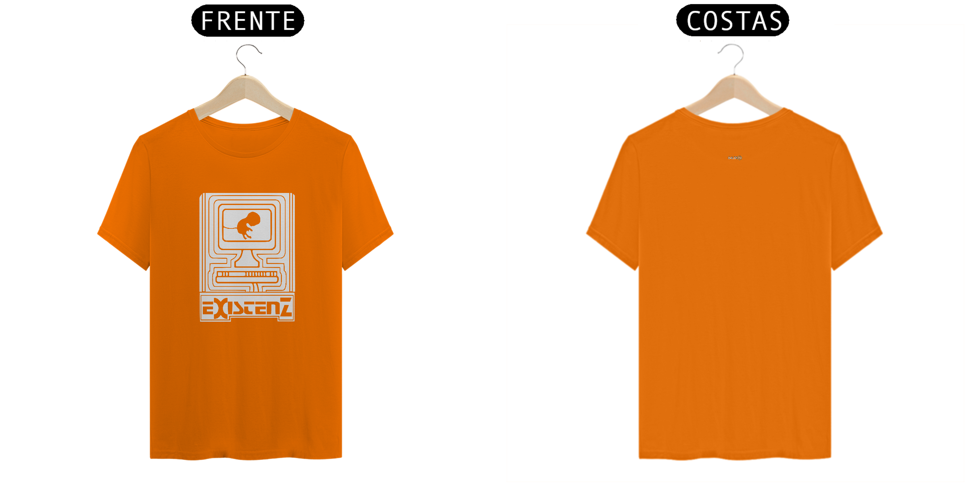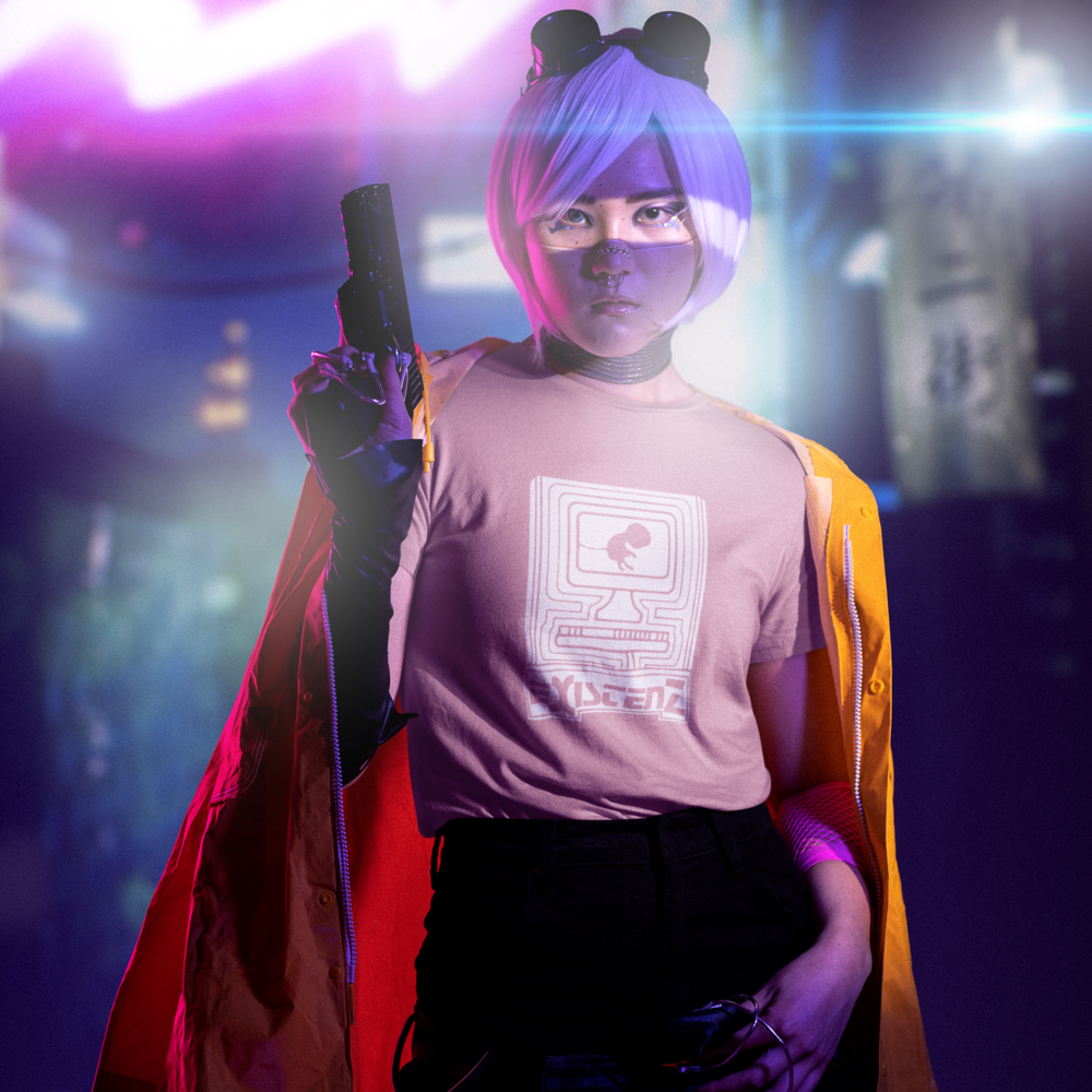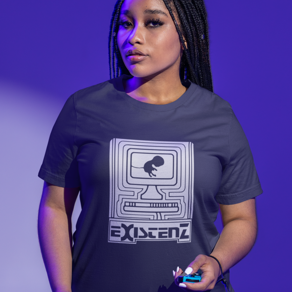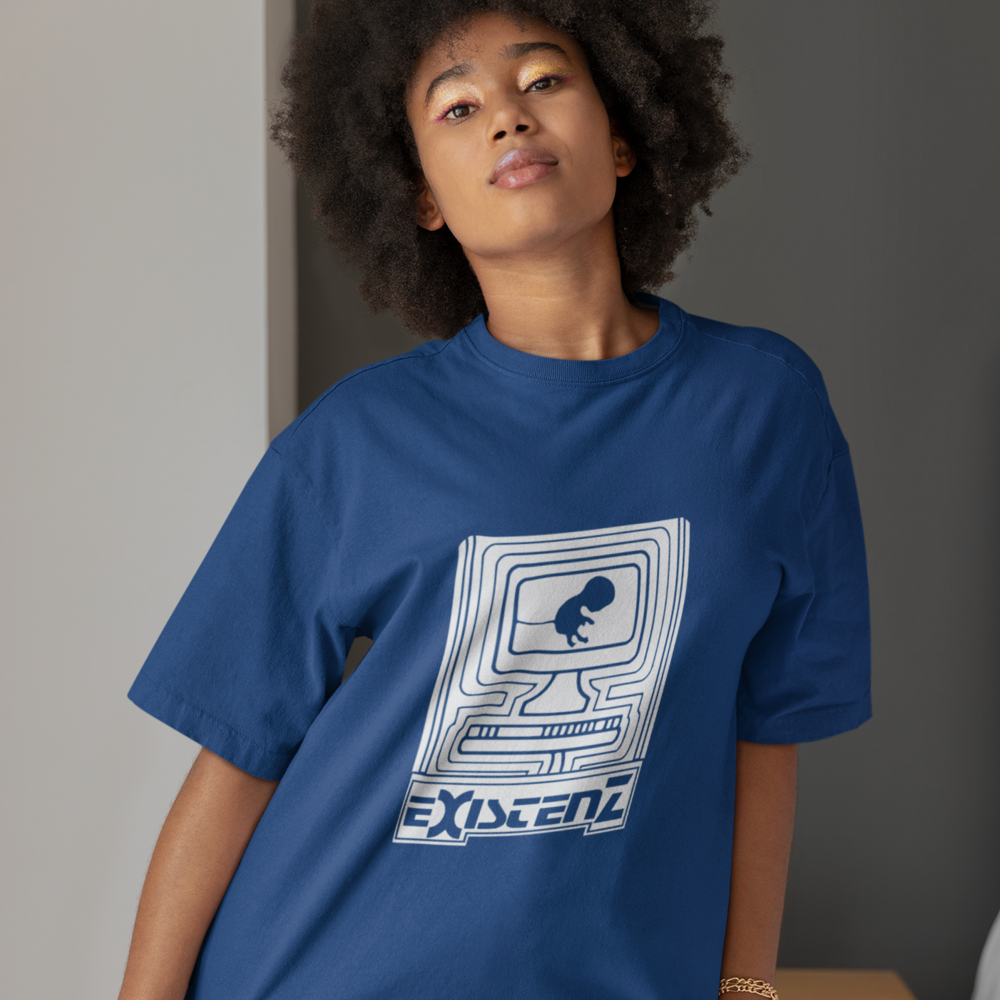 Um feto, conectado ao mundo digital por seu cordão umbilical, nos convida a questionar os limites entre a vida real e a realidade virtual. Inspirada no filme cult Existenz (1999), de David Cronenberg, esta camiseta estampa questões existenciais sobre a natureza da realidade, a fluidez da identidade e o controle da mente em um futuro distópico.