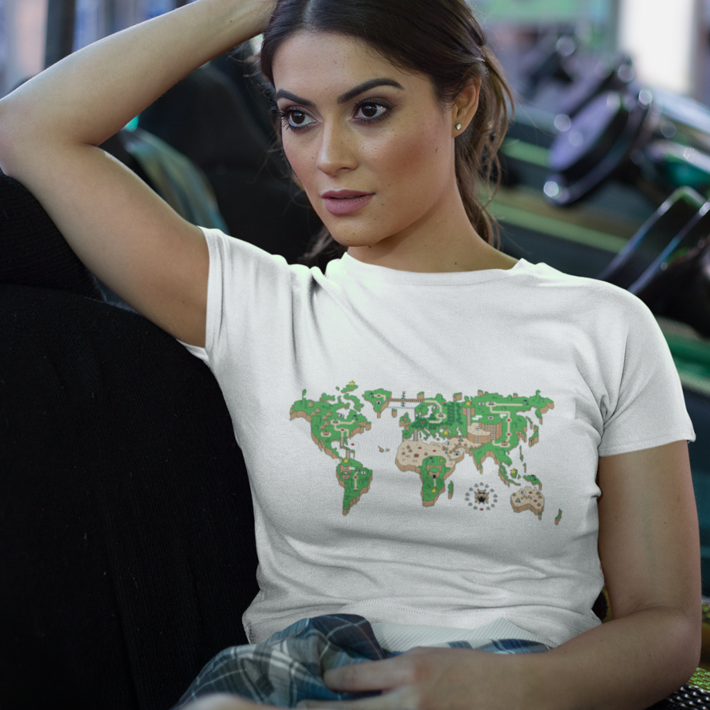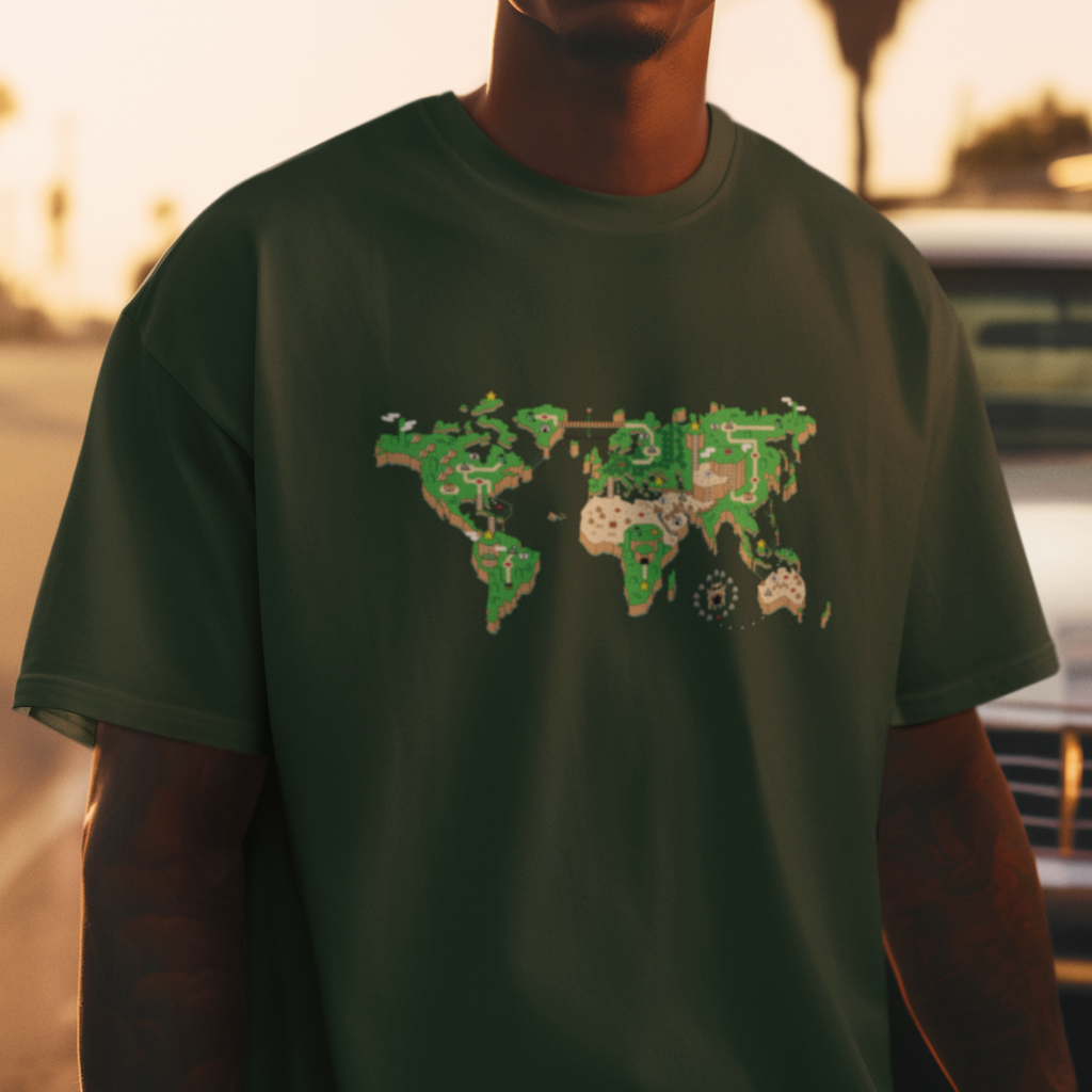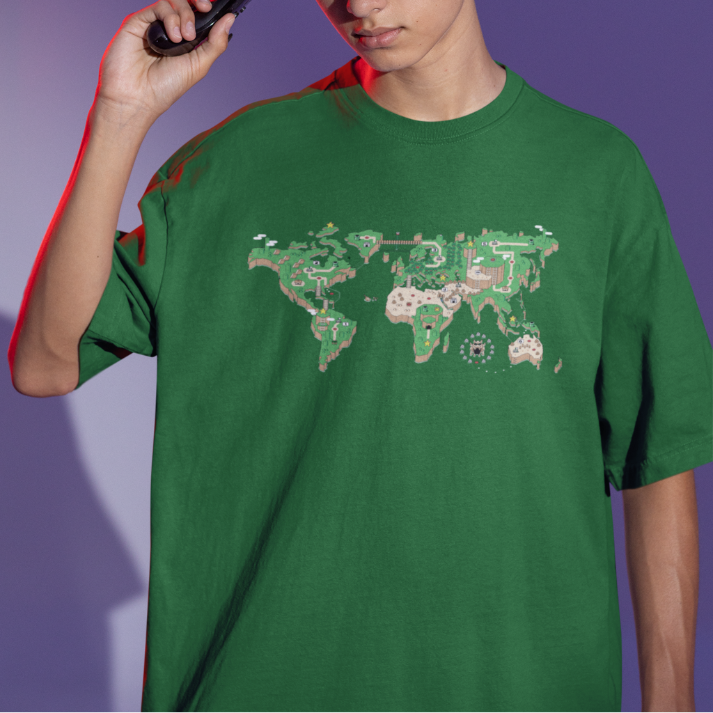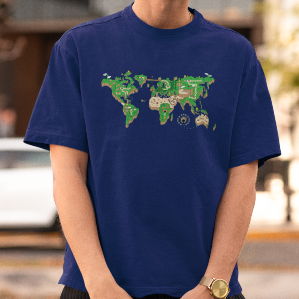 O mundo é um tabuleiro! Esta camiseta é uma janela para um planeta onde os cenários do Super Mário World se transformam em continentes e oceanos. Mario salta entre plataformas e encara inimigos familiares em cada canto do planeta, enquanto a nostalgia se entrelaça com a geografia global.