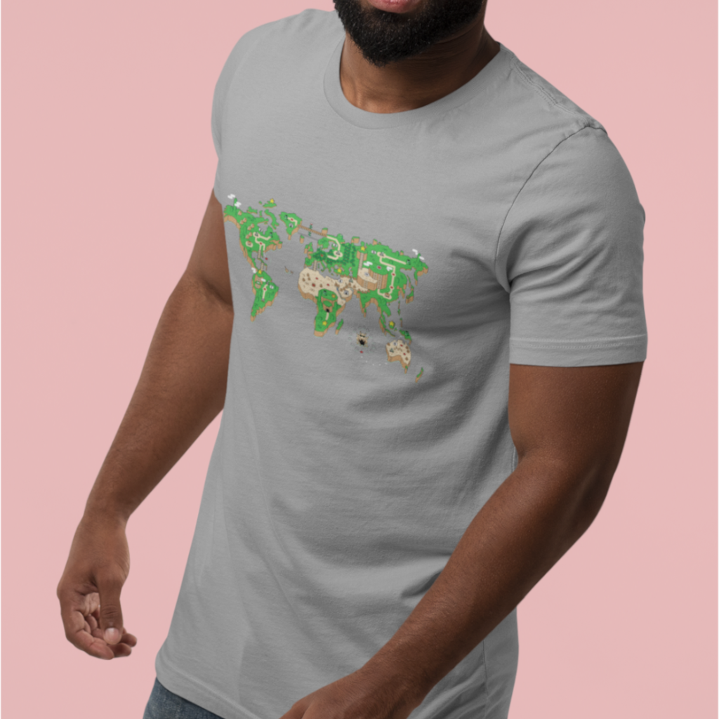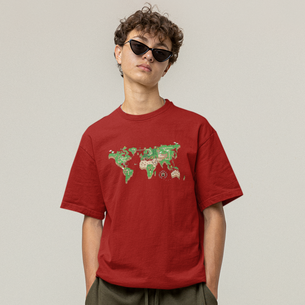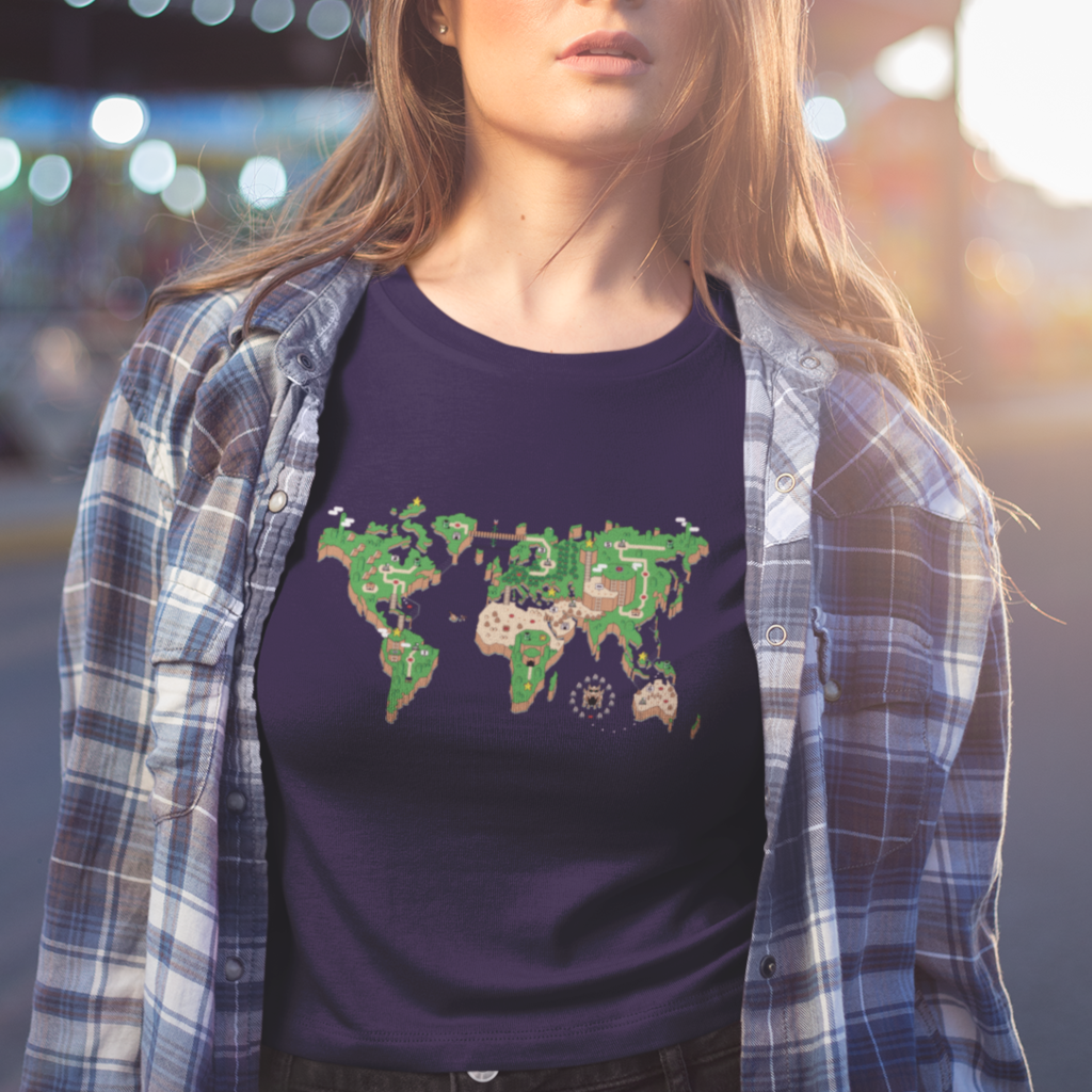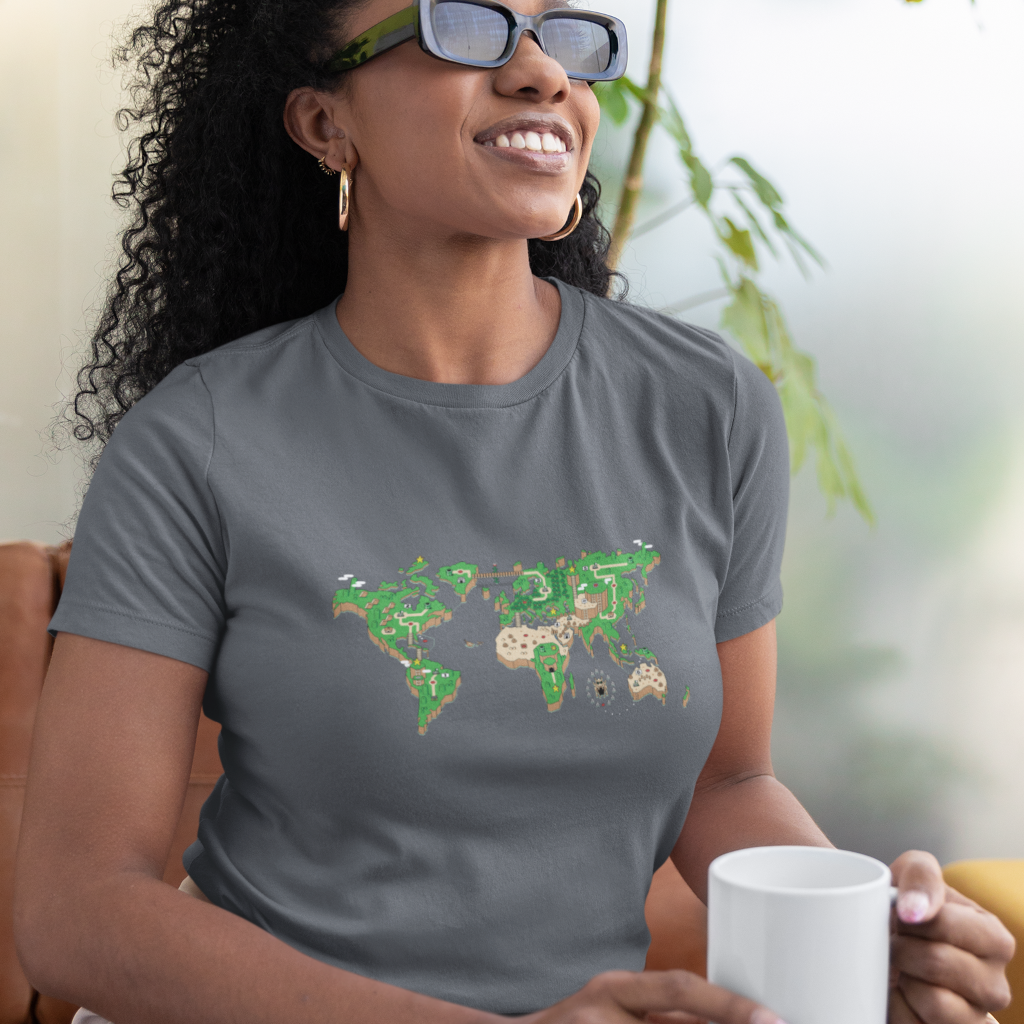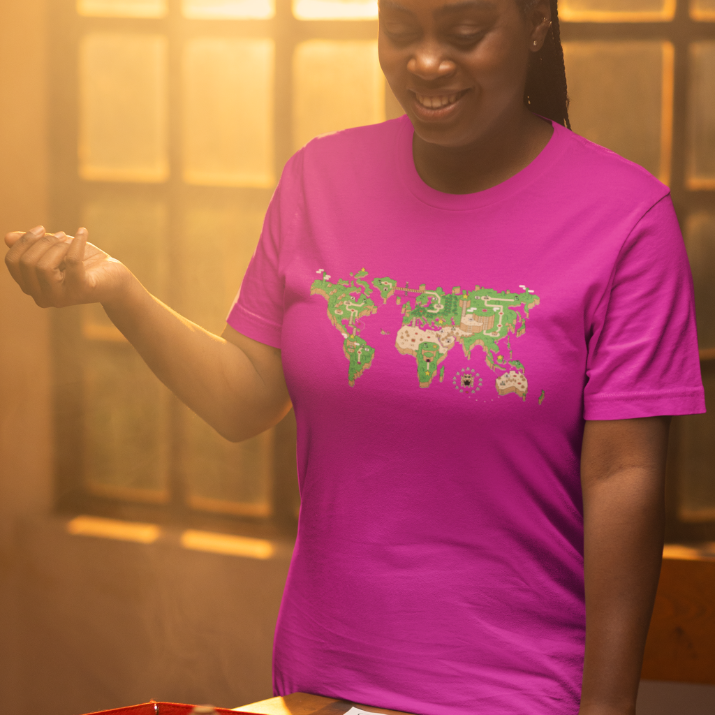 O mundo é um tabuleiro! Esta camiseta é uma janela para um planeta onde os cenários do Super Mário World se transformam em continentes e oceanos. Mario salta entre plataformas e encara inimigos familiares em cada canto do planeta, enquanto a nostalgia se entrelaça com a geografia global.