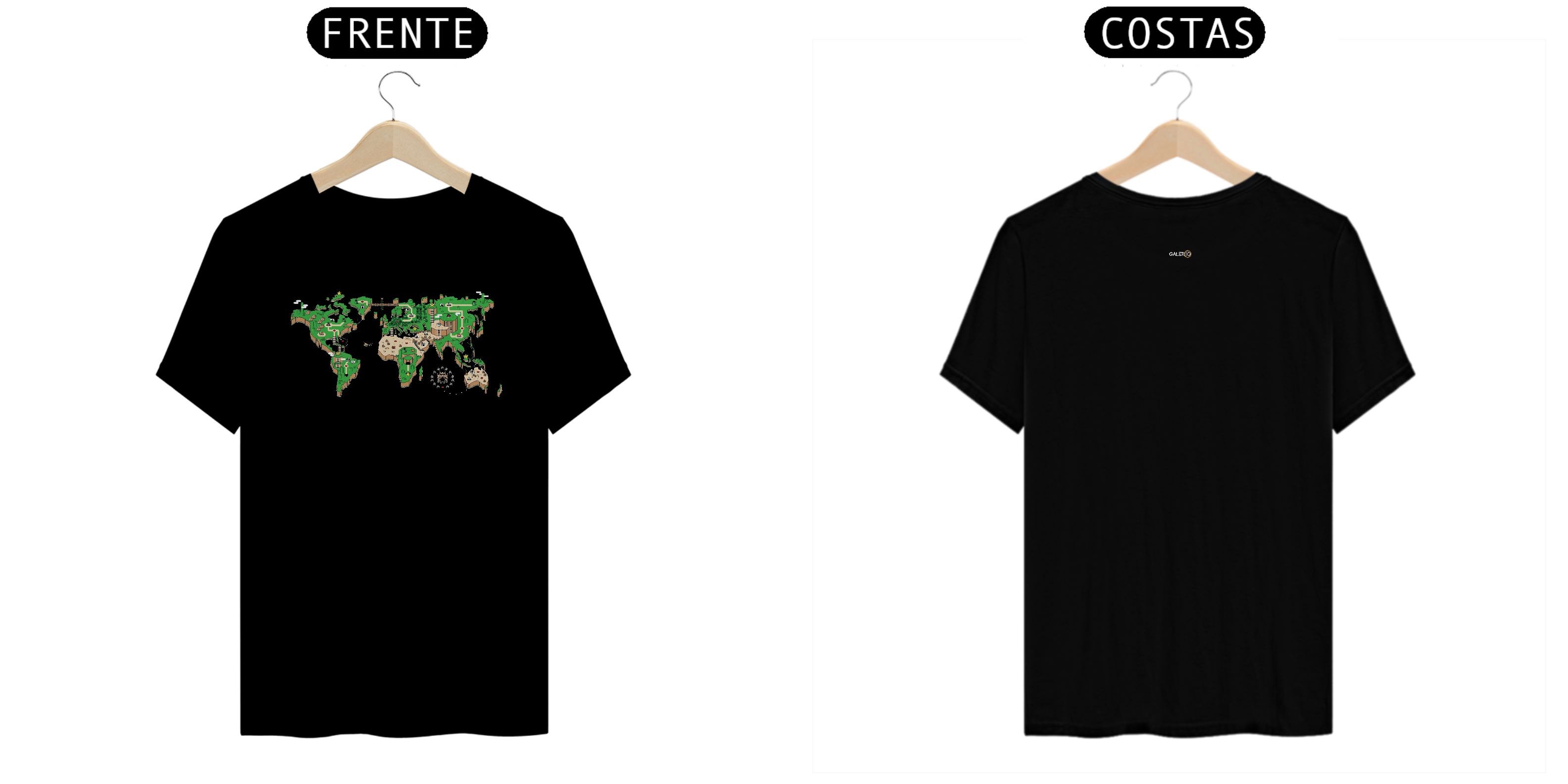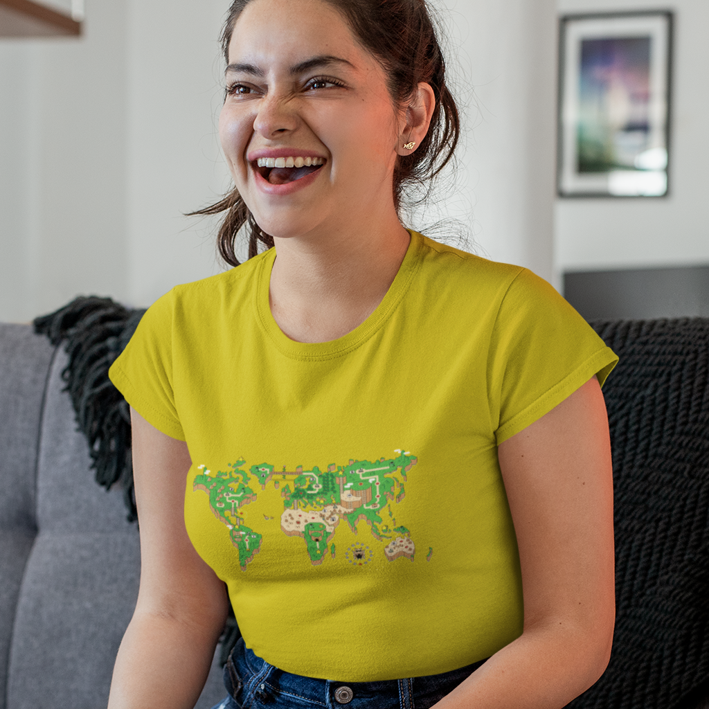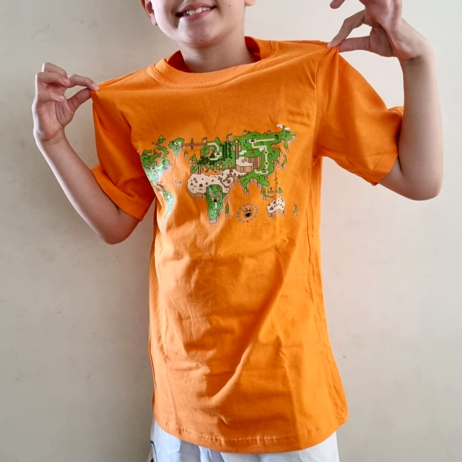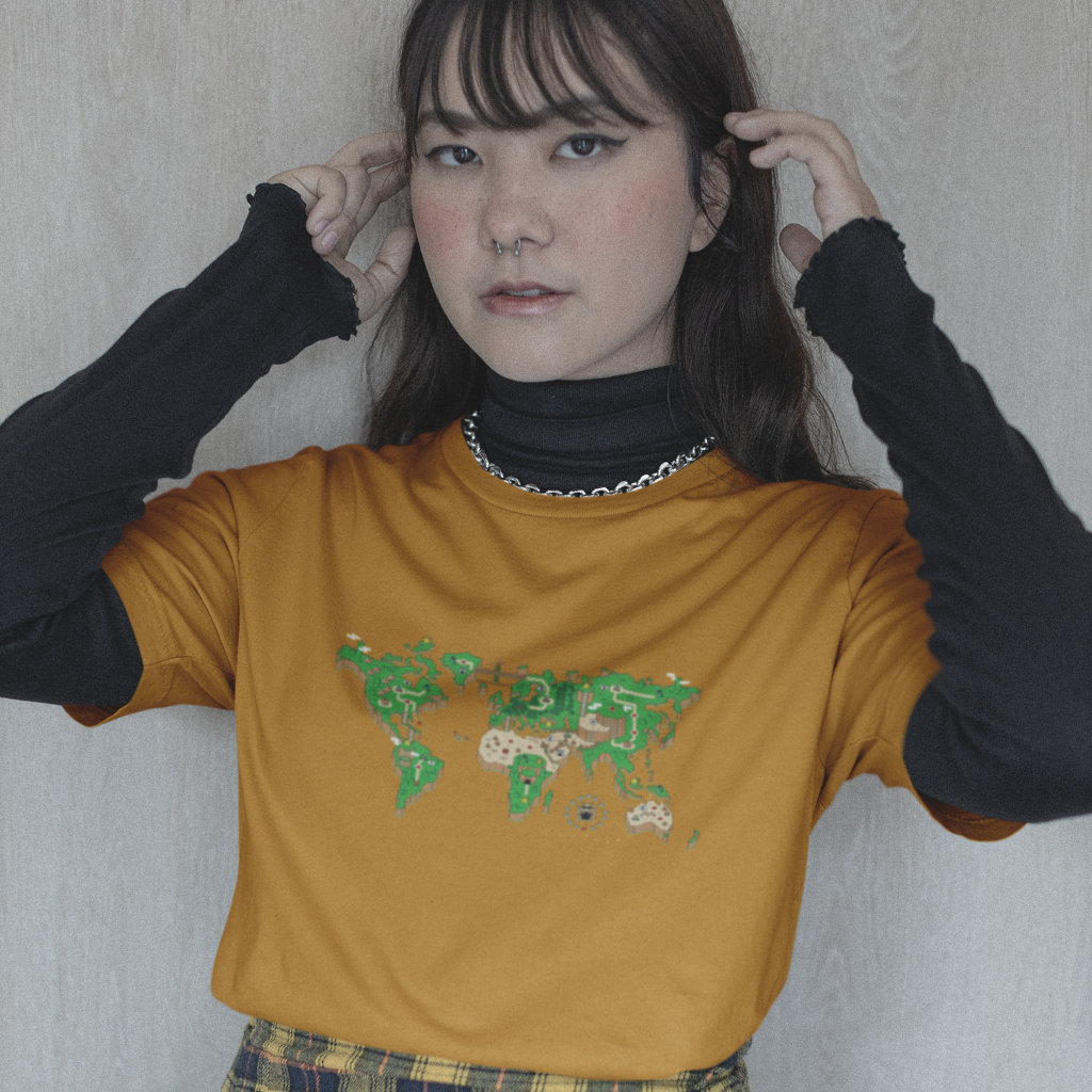 O mundo é um tabuleiro! Esta camiseta é uma janela para um planeta onde os cenários do Super Mário World se transformam em continentes e oceanos. Mario salta entre plataformas e encara inimigos familiares em cada canto do planeta, enquanto a nostalgia se entrelaça com a geografia global.