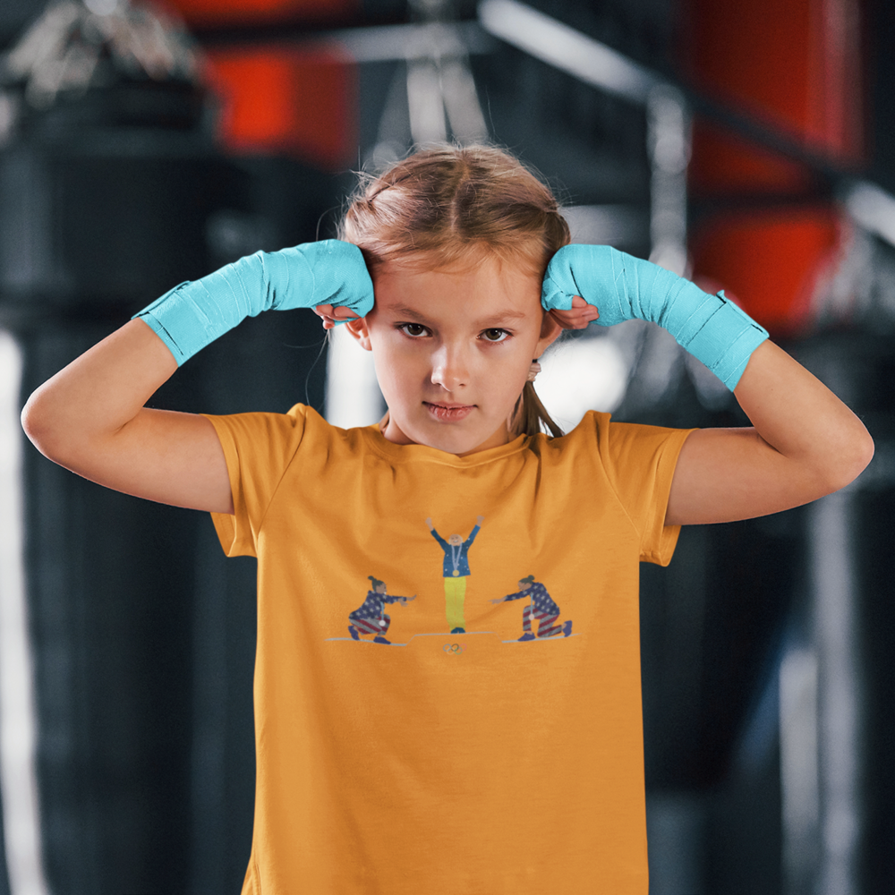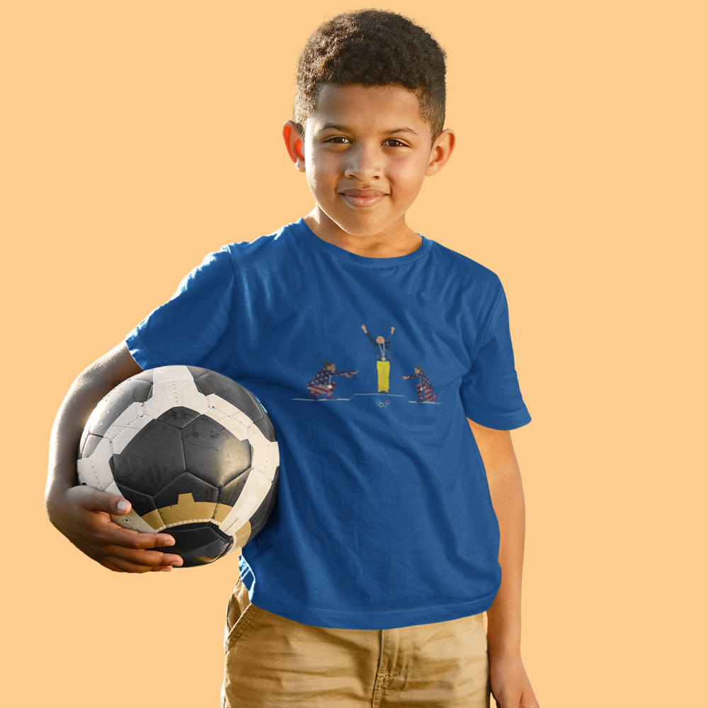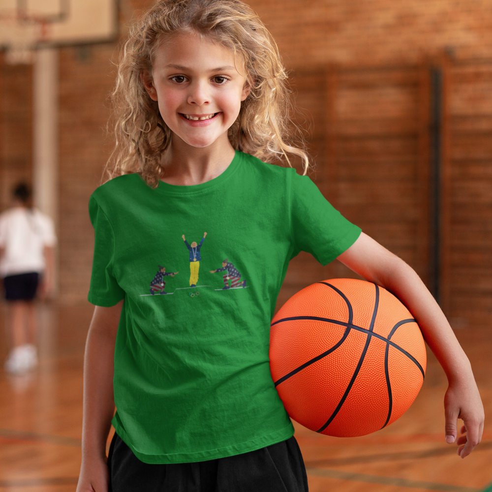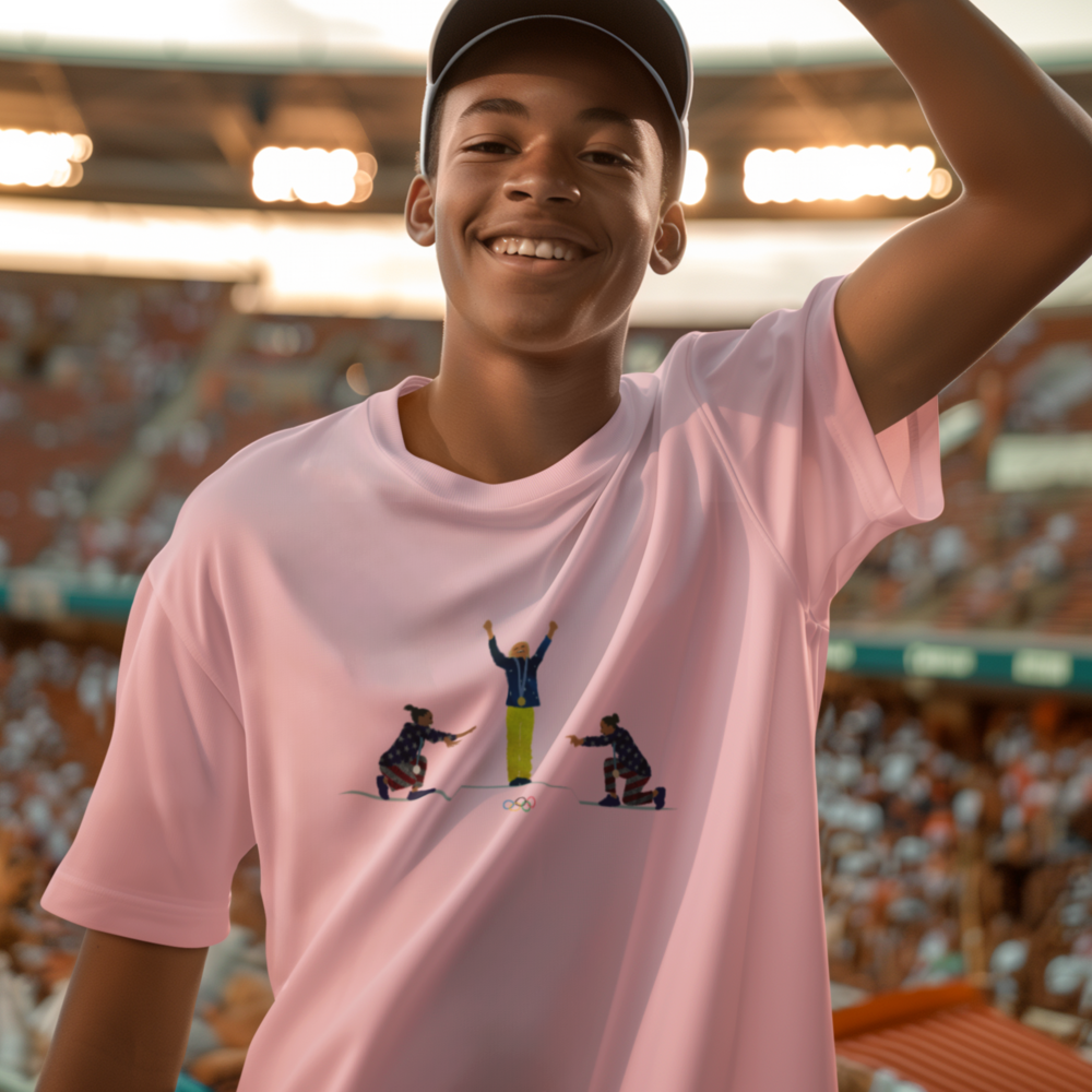 Um momento histórico e emocionante: Rebeca Andrade no topo do pódio, enquanto Simone Biles e Jordan Chiles (EUA) a homenageiam com respeito e admiração. O retrato perfeito da superação, da conquista e do espírito olímpico, que transcende fronteiras e nos inspira a ir além. Vestir esta camiseta é carregar consigo a energia da vitória e a honra de fazer parte dessa história inesquecível.