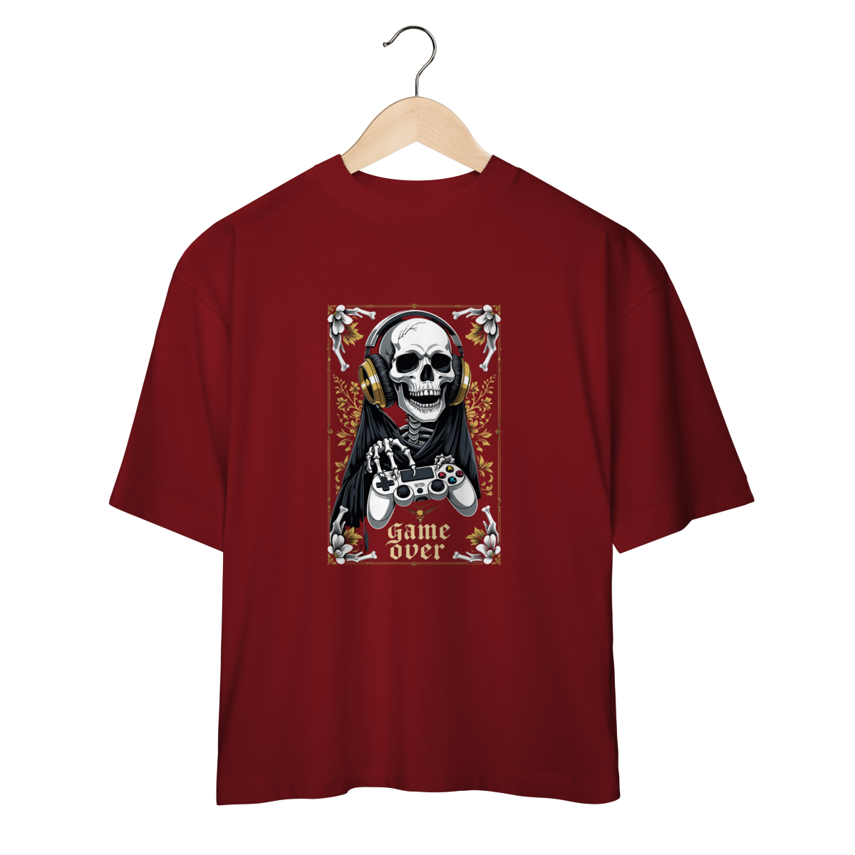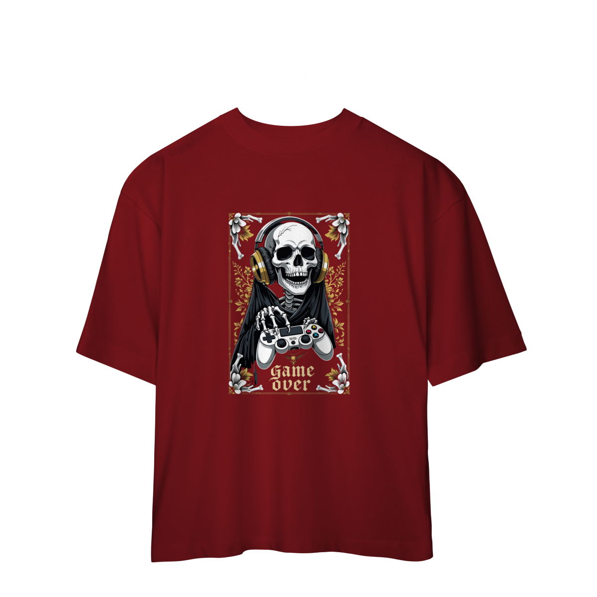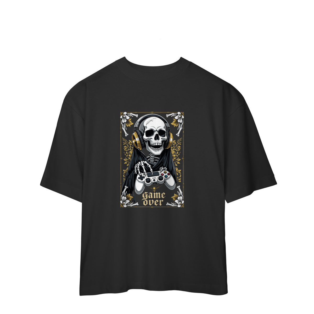 Camiseta Oversized “Game Over” traz uma arte impactante: a Morte gamer, com fones dourados e controle nas mãos, pronta para a próxima partida — porque até o último boss precisa de um bom setup.