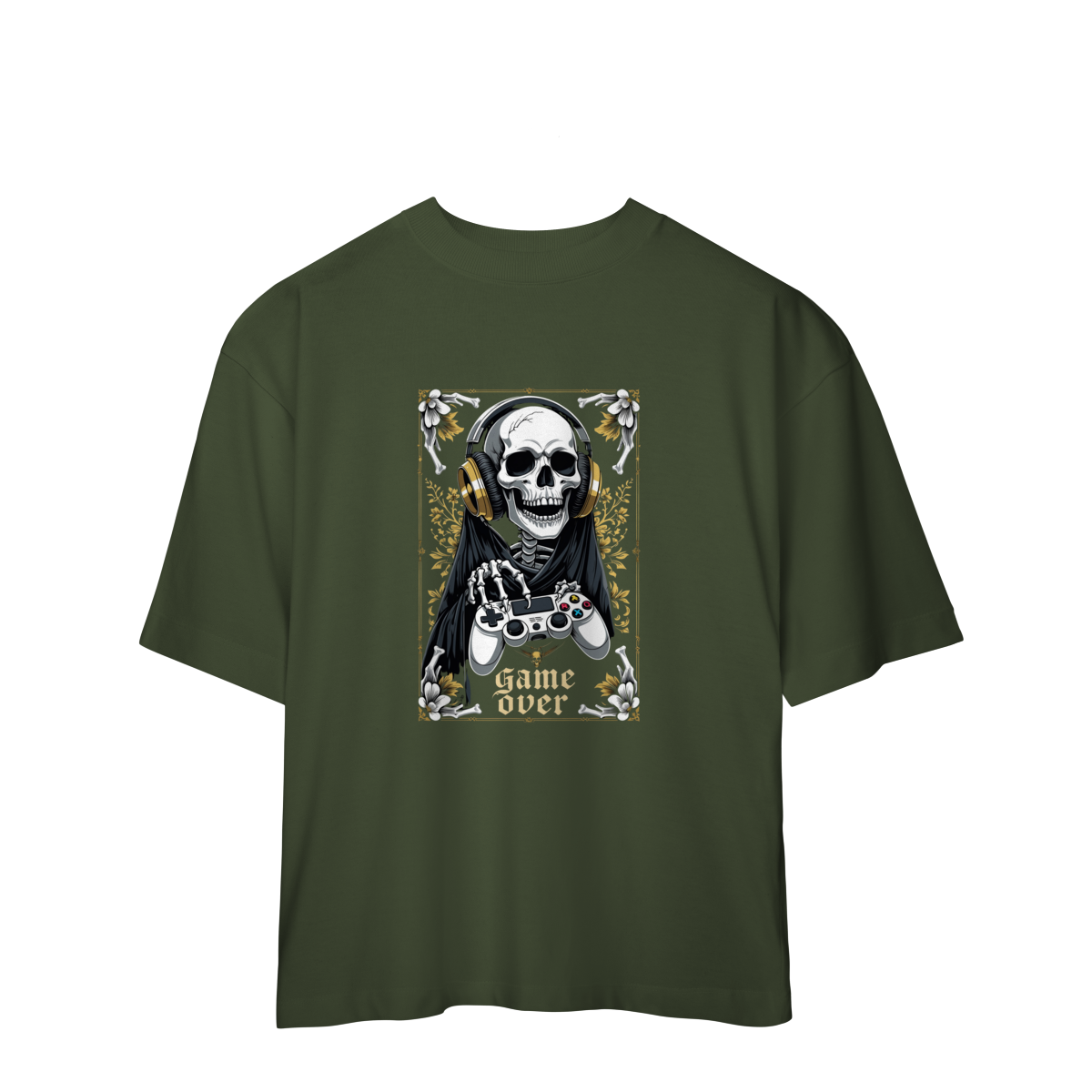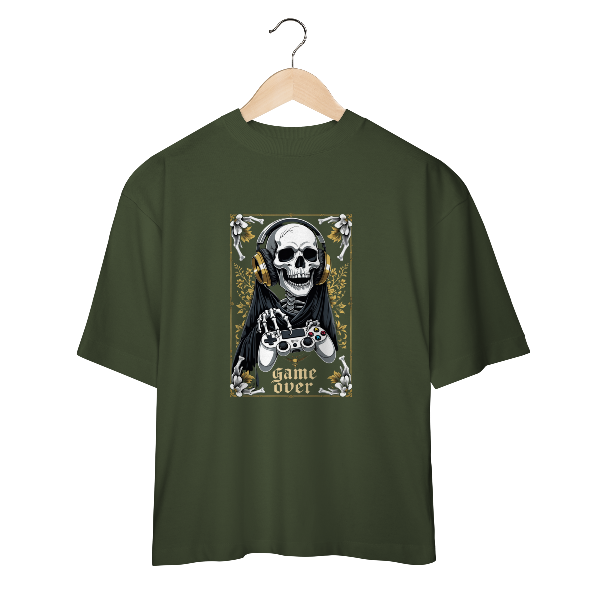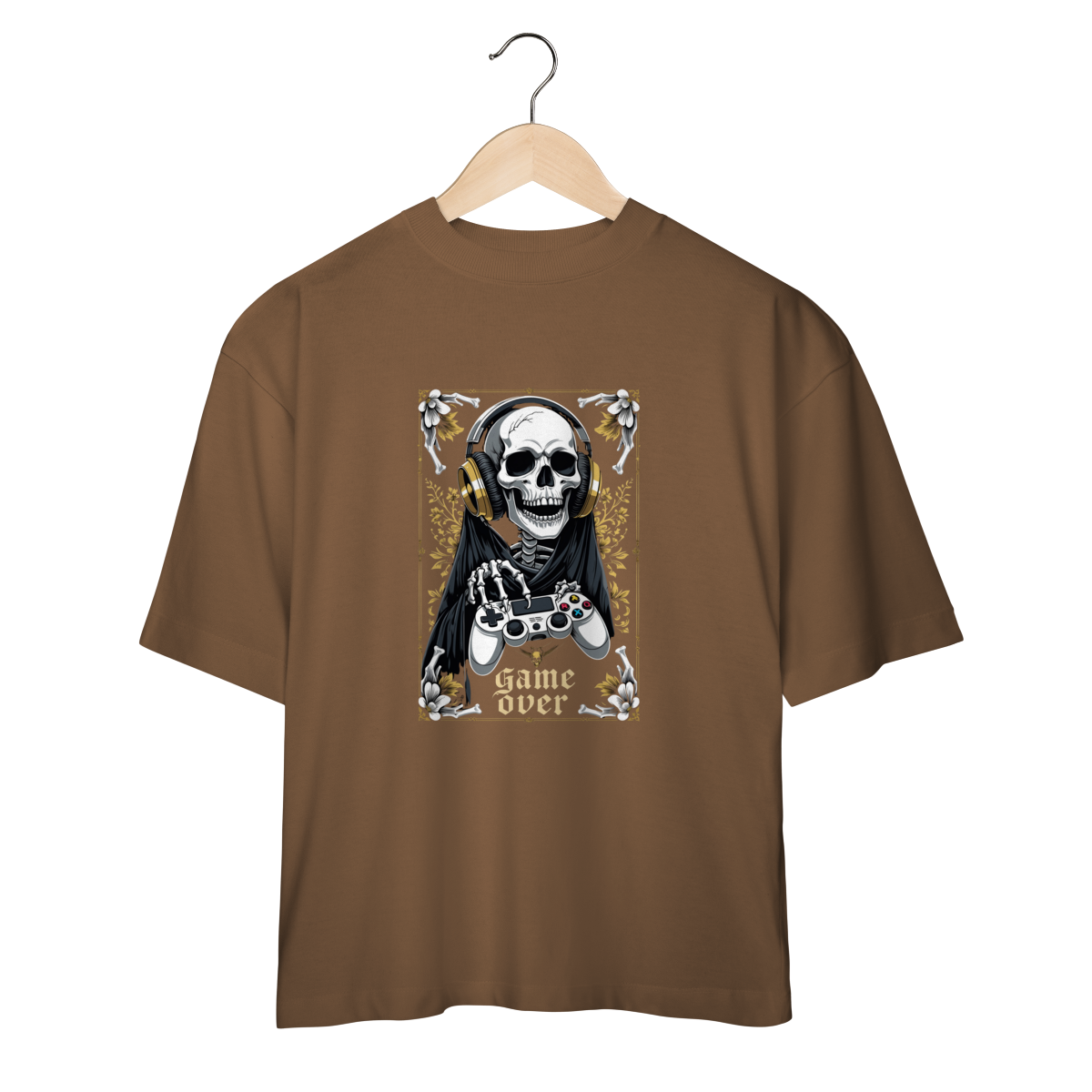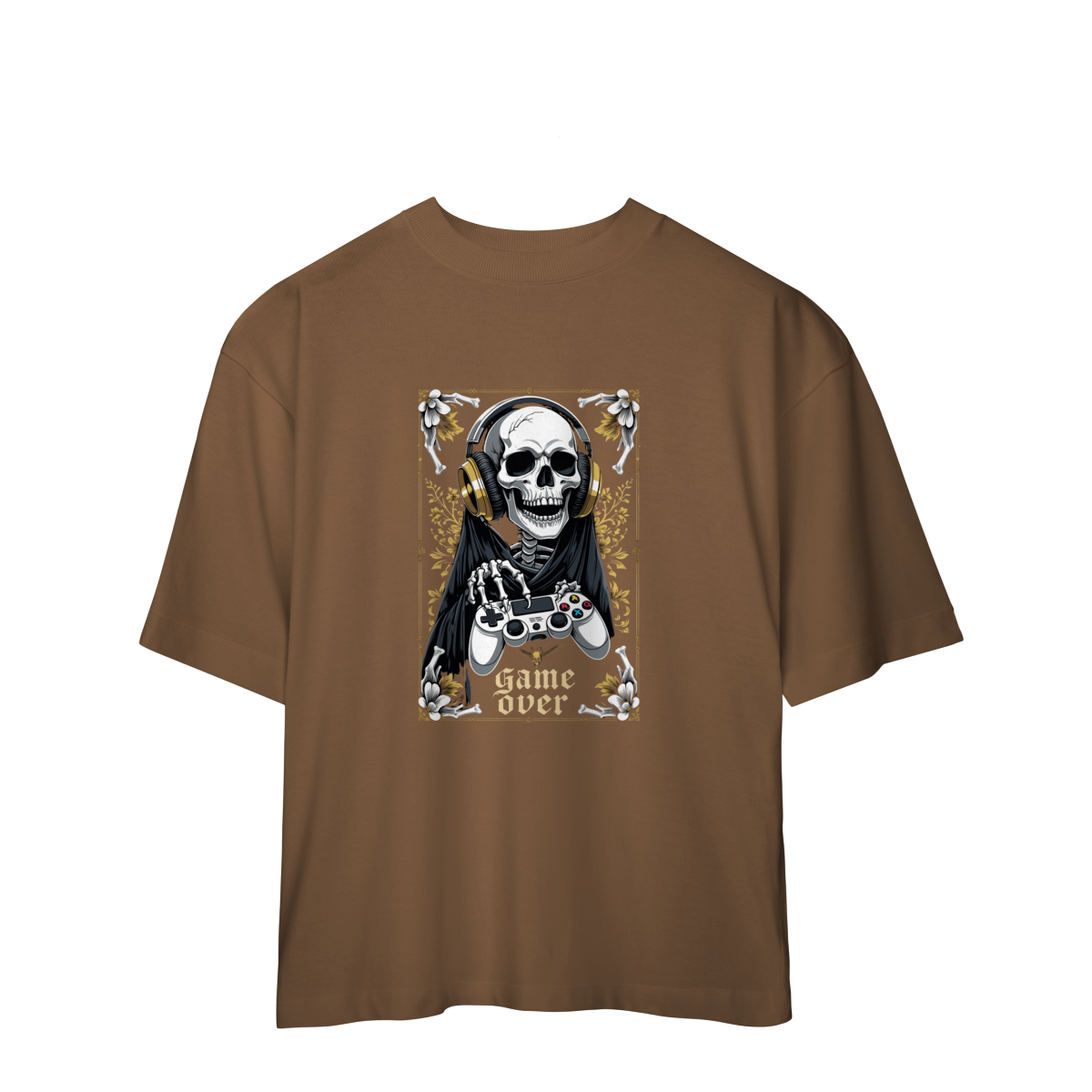 Camiseta Oversized “Game Over” traz uma arte impactante: a Morte gamer, com fones dourados e controle nas mãos, pronta para a próxima partida — porque até o último boss precisa de um bom setup.