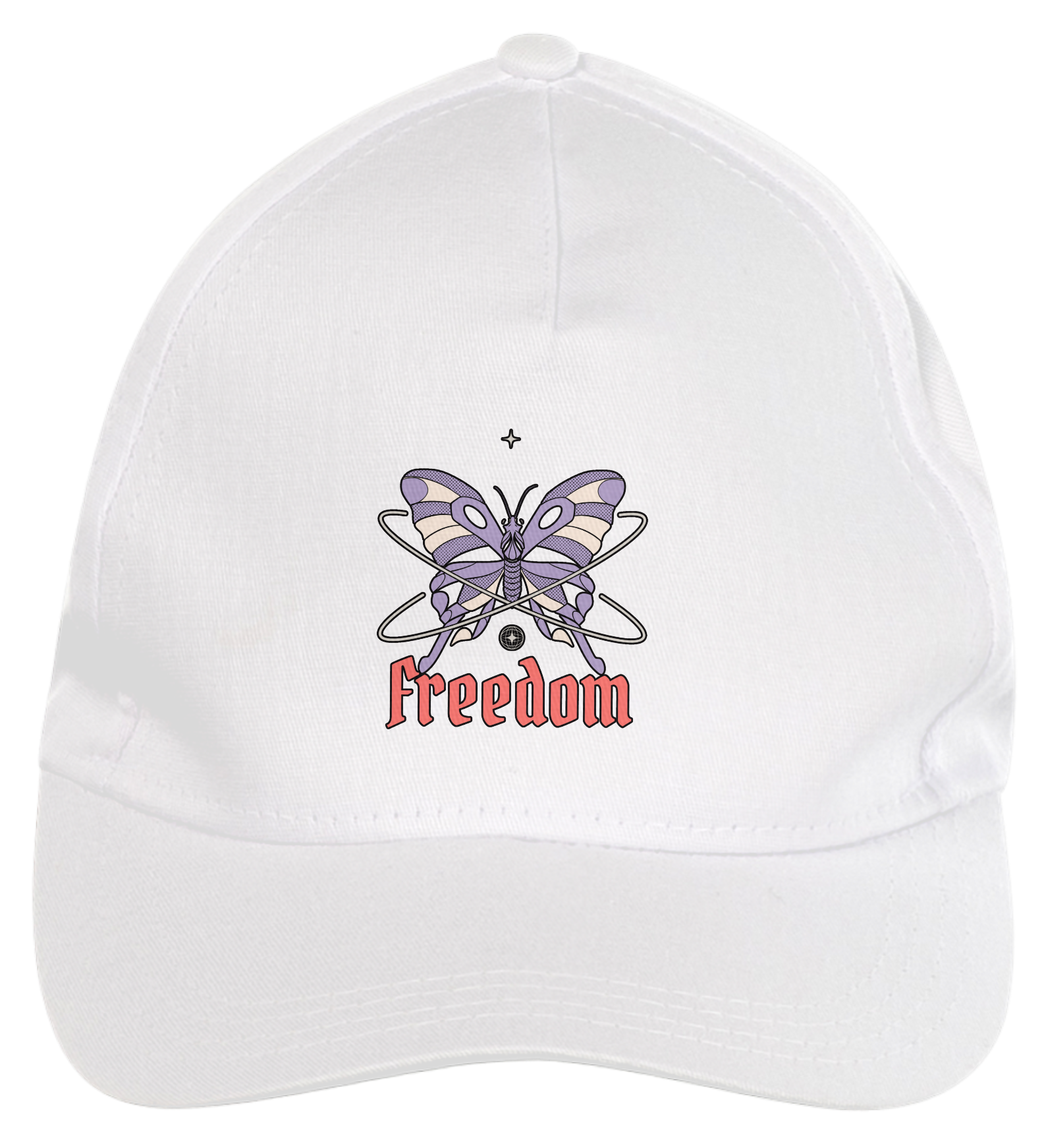 Boné americano com transfer frontal em alta qualidade, aba curva e fecho em tira totalmente regulável com pinos. O modelo veste tamanho "único".