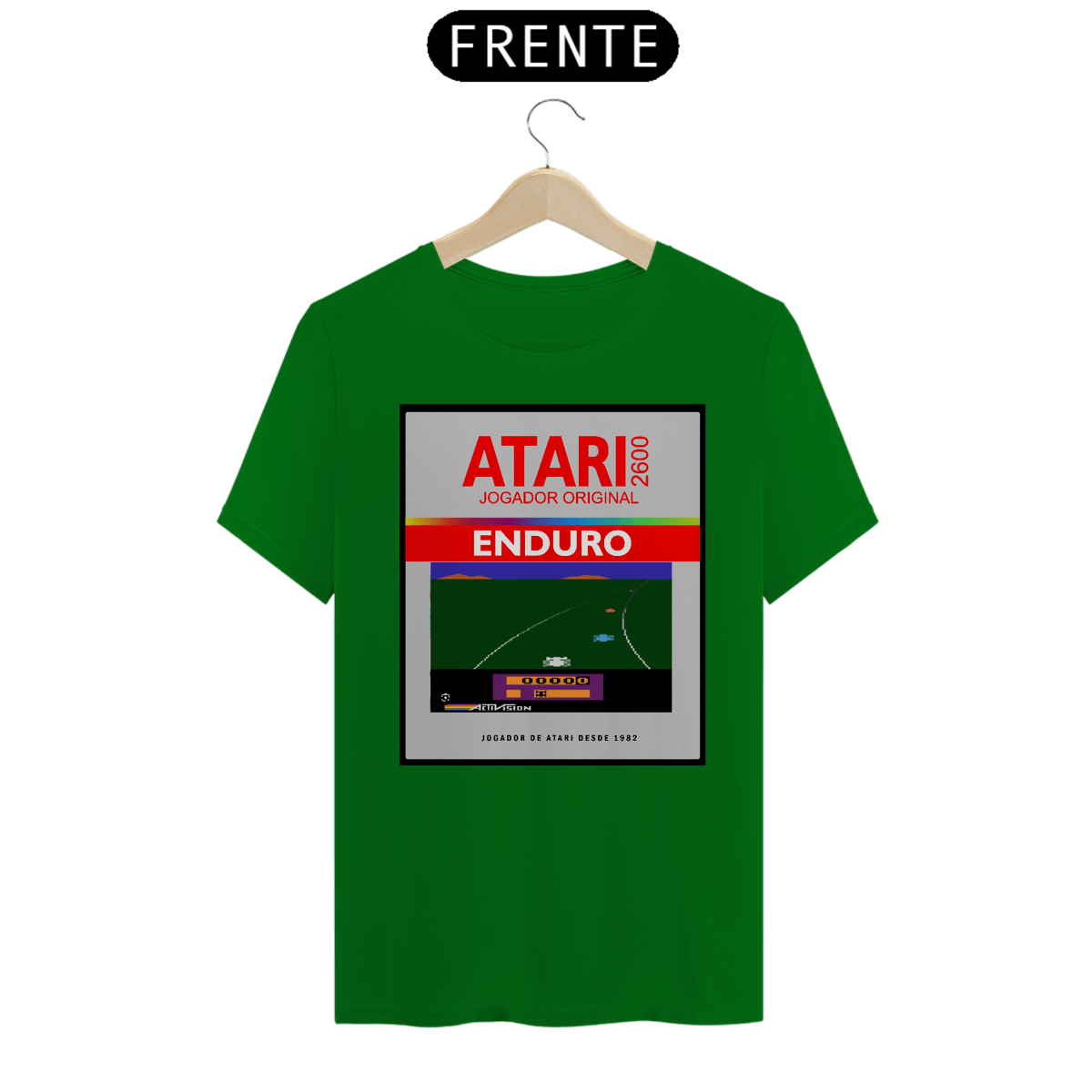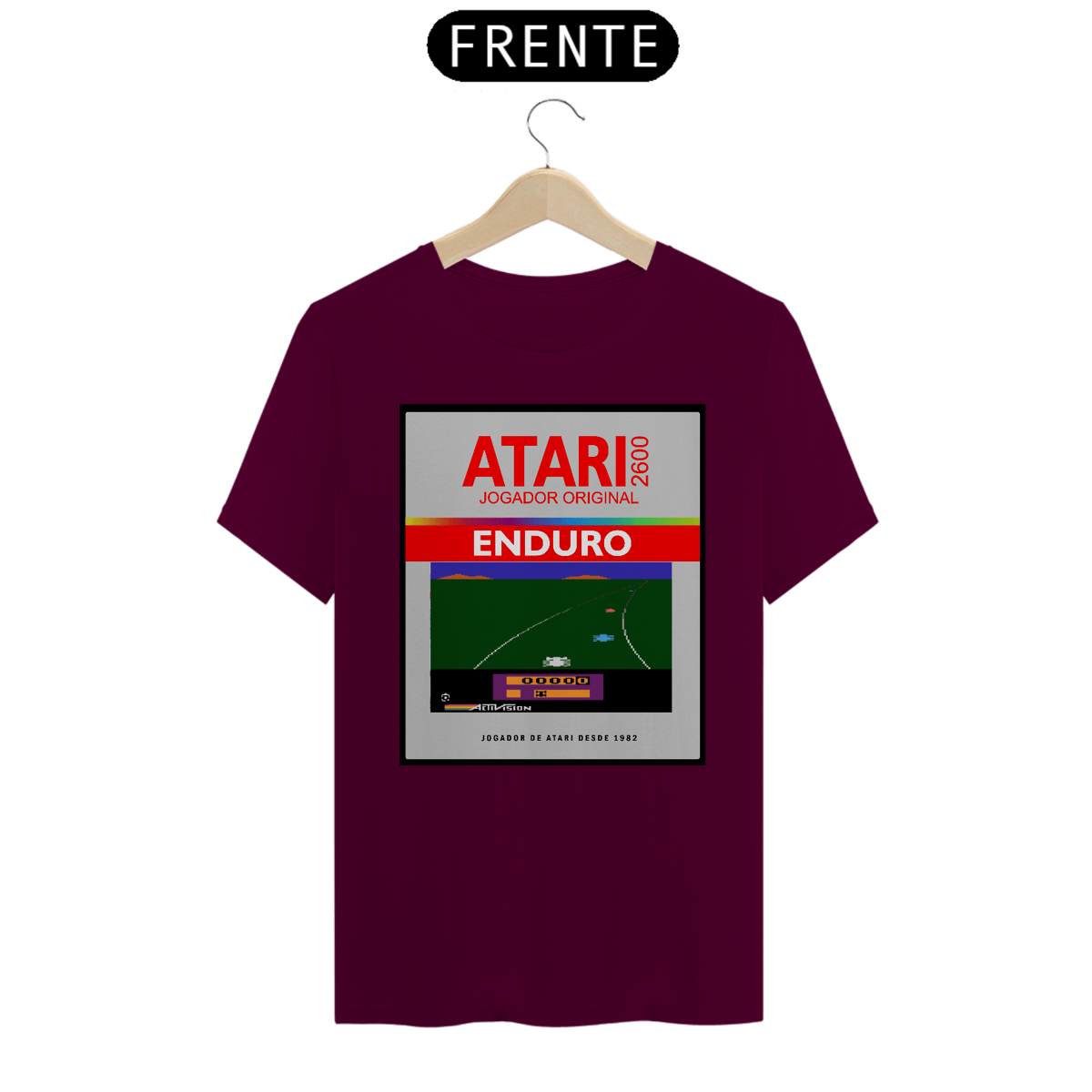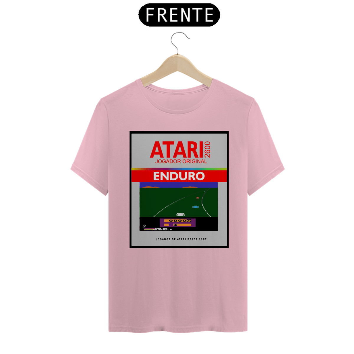 A camiseta branca de manga curta apresenta uma estampa inspirada no clássico jogo de corrida "Enduro" para o Atari 2600. A estampa é um box do jogo, com o título "Enduro" em destaque, a logo da Atari 2600 e uma imagem do jogo em pixel art. A frase "Jogador Original" e "Jogadores de Atari desde 1982" completam o design da camiseta.