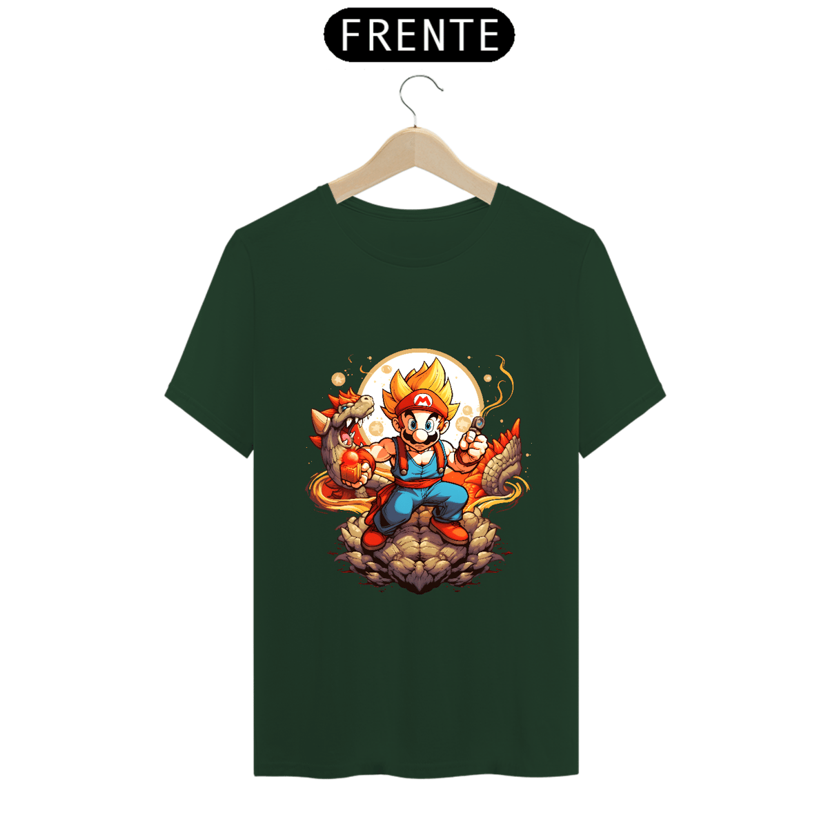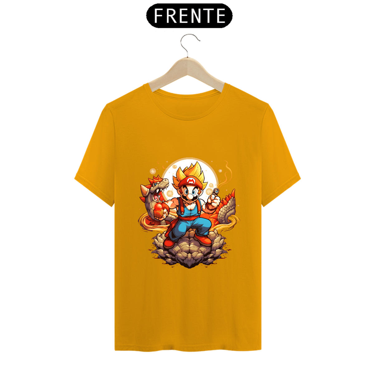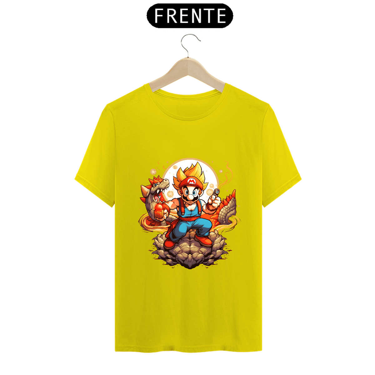 Nessa obra-prima vestível, o nosso querido Super Mário não está apenas pegando cogumelos; ele está canalizando a força lendária dos Saiyajins! A transformação épica está completa, com cabelos dourados voando ao vento e olhos faiscando com poder. Ele não é apenas um super-herói dos jogos, agora ele é um super saiyajin que vai enfrentar qualquer desafio, seja ele no Reino do Cogumelo ou além!